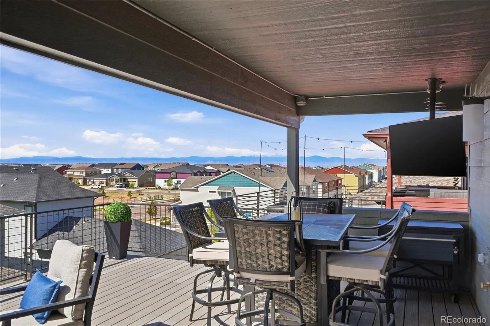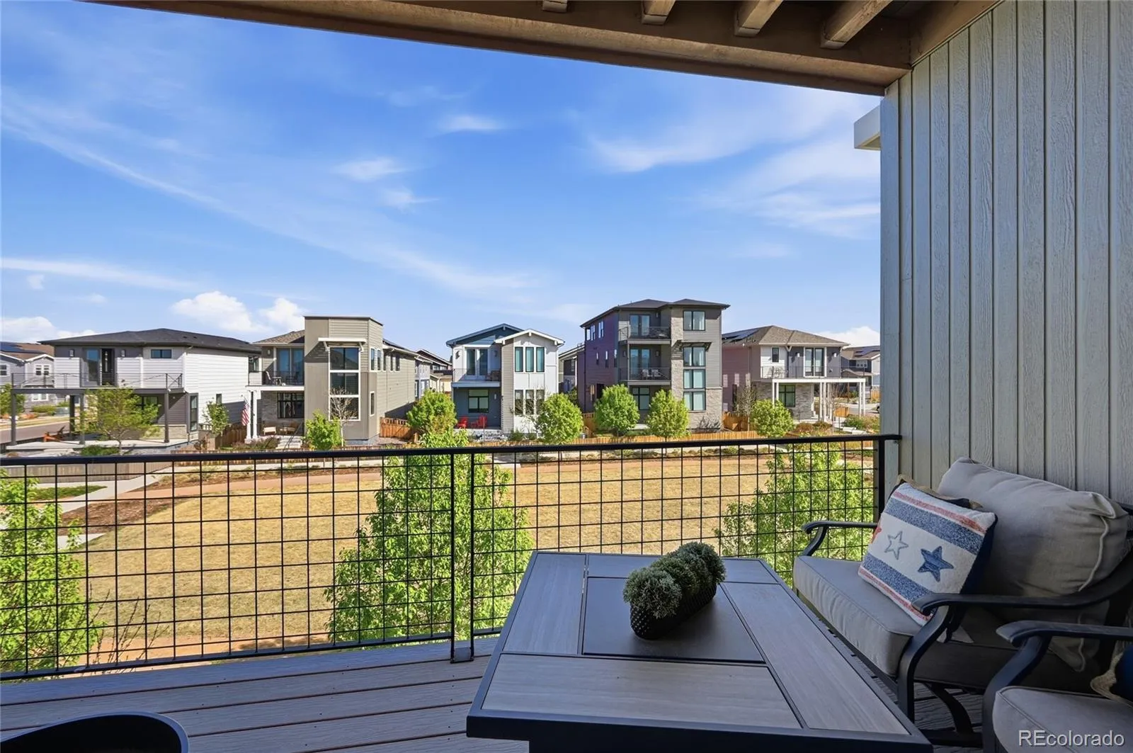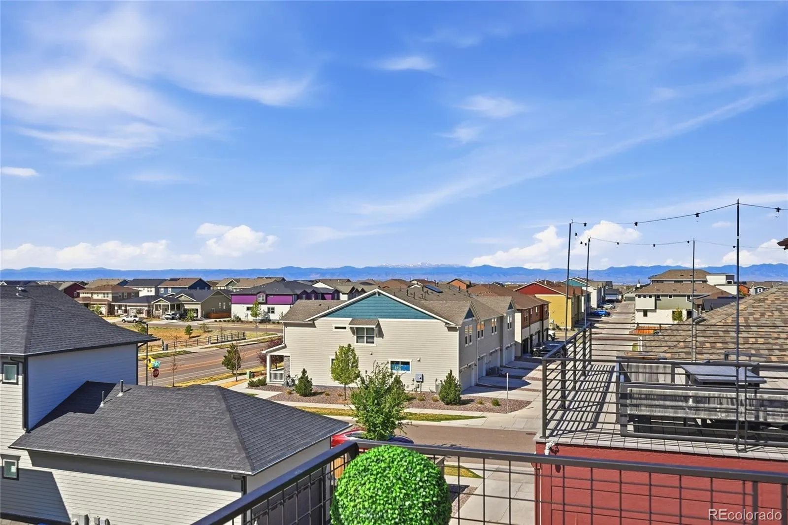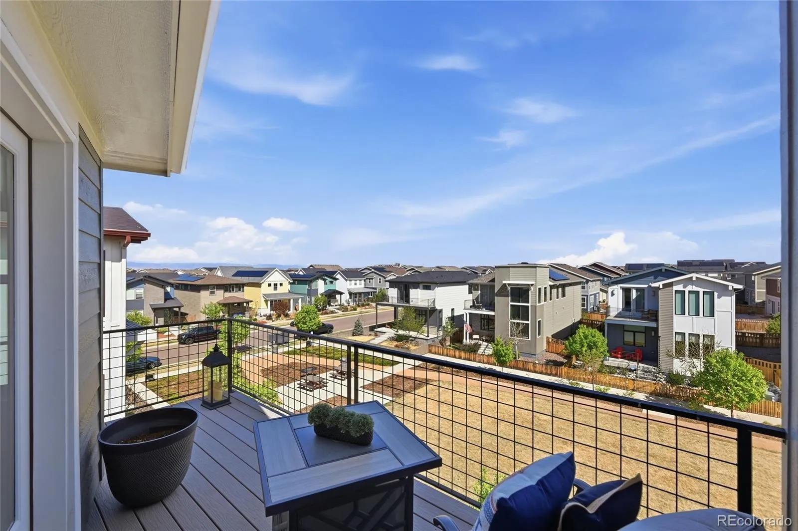 WELCOME to this stunning contemporary residence located in the dynamic Painted Prairie neighborhood- INFUSED with parks, trails and green spaces that welcome nature and promote community. Situated on a premier lot facing a delightful grassy courtyard, this modern home features three beds, four baths, various flexible living, dining, work and play spaces, a two-car garage and unfinished basement. This innovative floorplan was MADE for Colorado living, with its numerous patios, private balconies, and showstopping roof top deck with GLORIOUS MOUNTAIN VIEWS. Custom smart motorized window shades cover nearly every window in the home. A dramatic three-story foyer invites you into an expansive main living space with high ceilings, 8′ doors, chic gas fireplace, and gorgeous LVP wood-look flooring. The connecting chef’s kitchen features JennAir appliances, gas cooktop, white quartz, rich espresso maple cabinetry and an expansive granite island for dining and food prep. The expanded nearby side patio is the perfect spot for your grilling necessities. A half bath and oversized two car garage complete the first floor. The roomy loft on the second floor makes a great space for additional lounging, working or playing. The primary bedroom suite has its own private balcony, and en-suite bath with oversized shower, double vanities and walk-in closet. Two additional bedrooms and a full guest bath with double sinks are located down the hall. The laundry room is conveniently placed across from guest bath and features a charming coffee bar with built in cabinetry. Finally, a spectacular recreational room occupies the entire third floor and offers a private balcony, a wet bar/kitchenette complete with a beverage fridge, kegerator, and that ice maker you always wanted! The adjacent guest bath simplifies entertaining. Dual sliding glass doors open to an expansive partially covered roof top deck with unmatched mountain views! *NEW ROOF IN 2025*