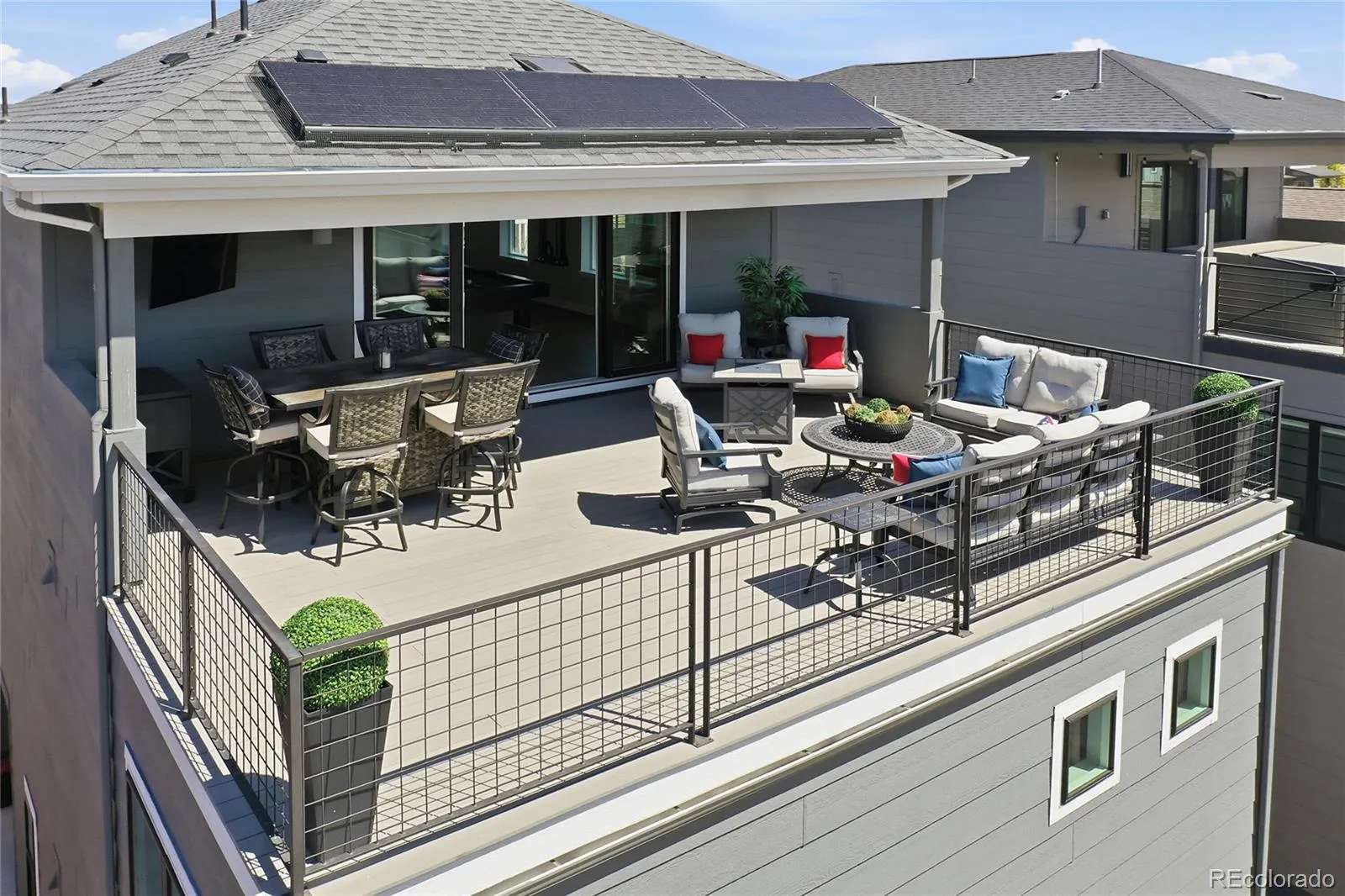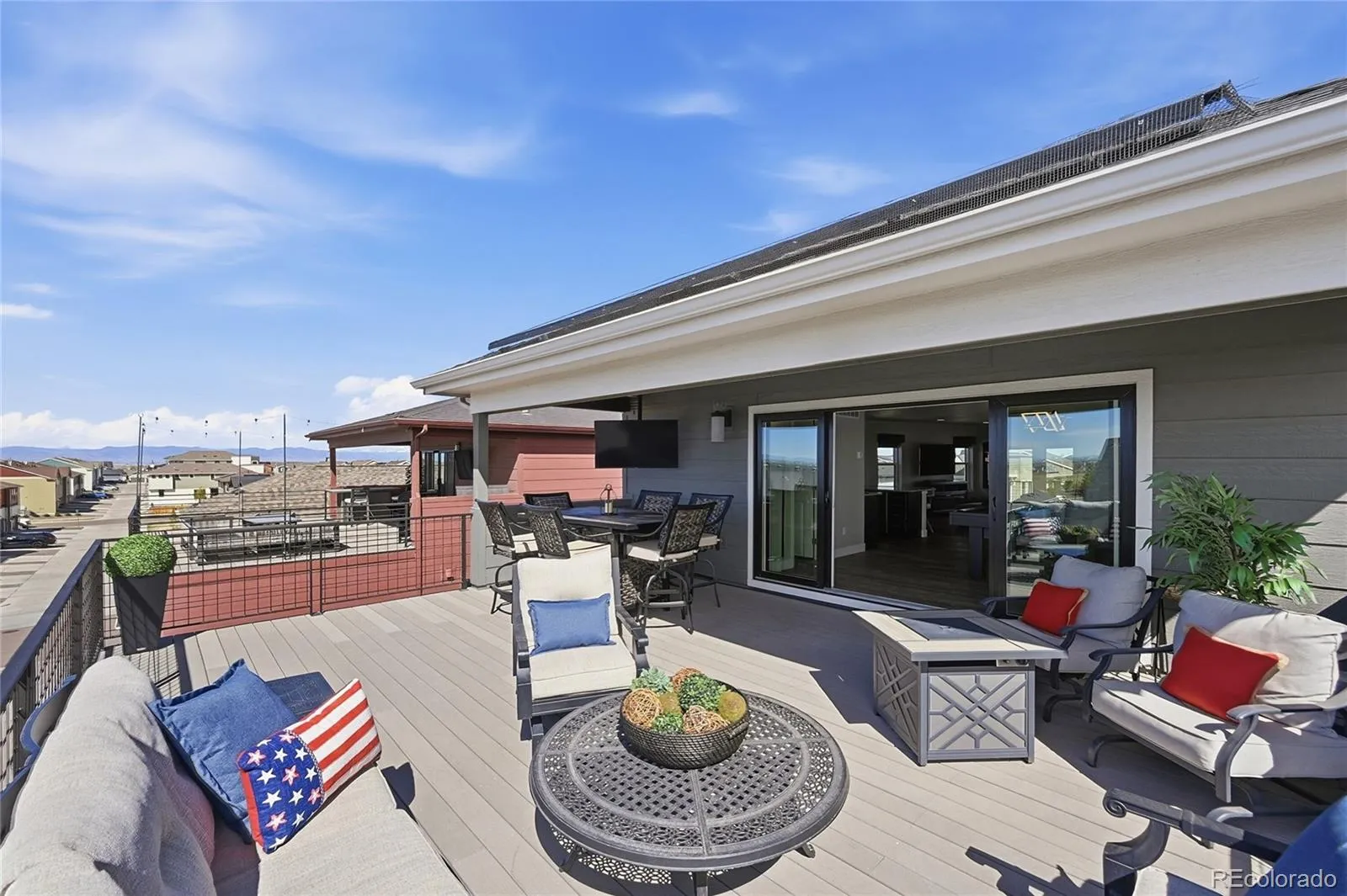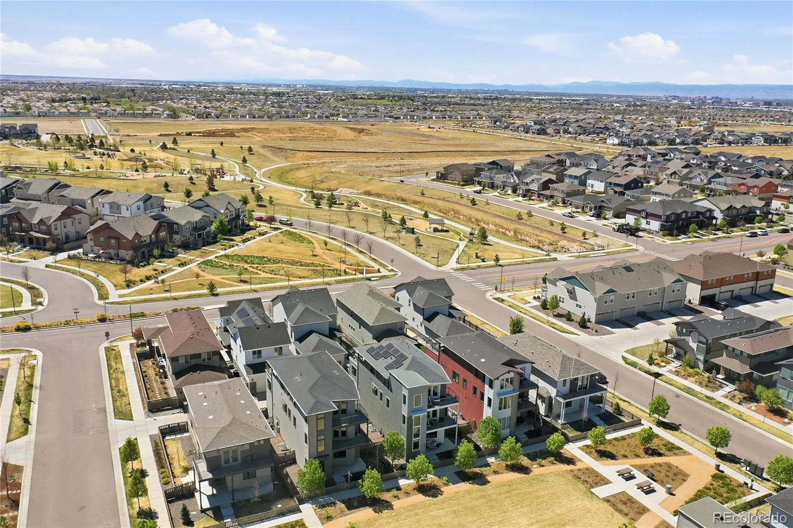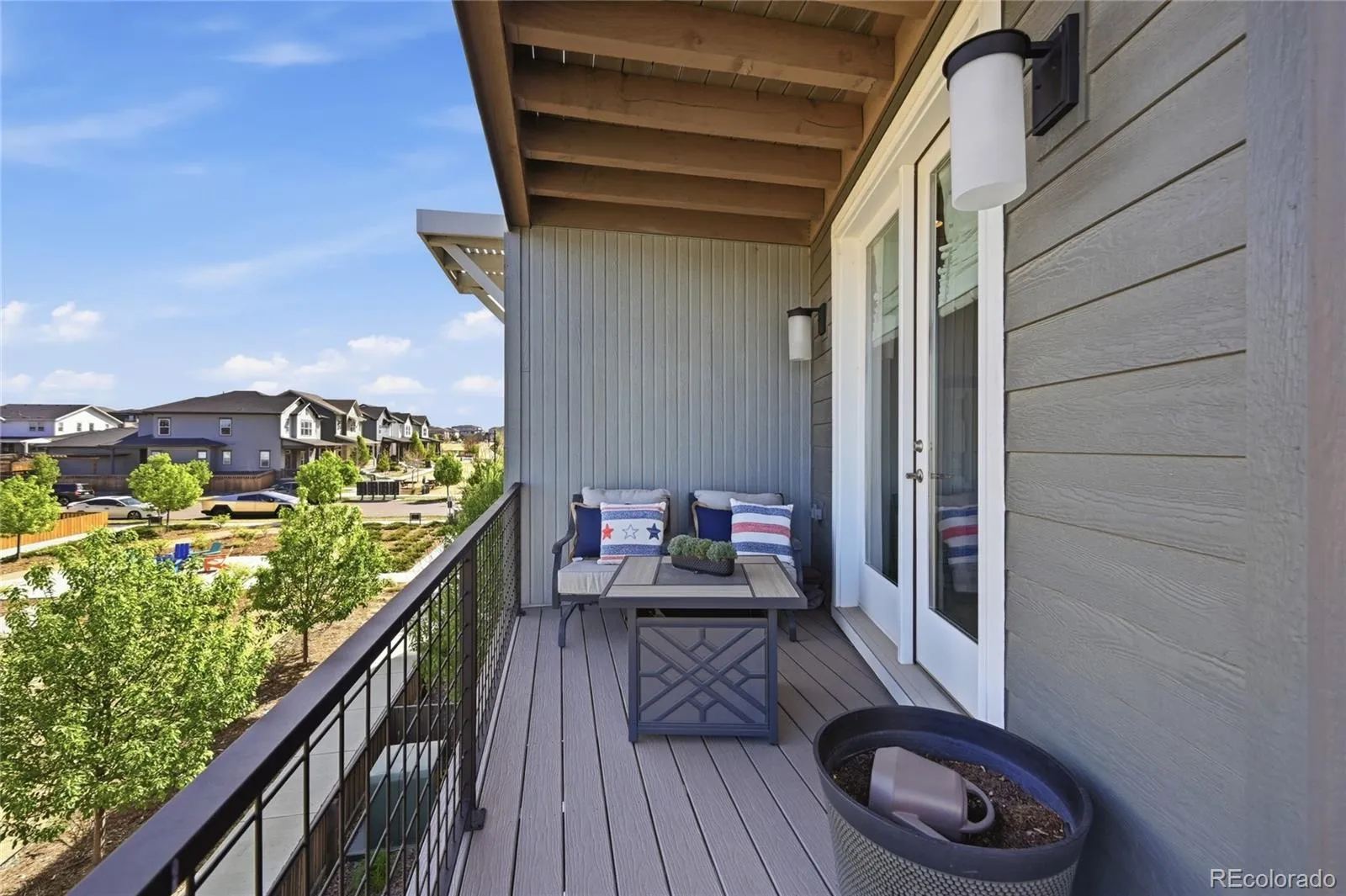 WELCOME to this stunning contemporary residence located in the dynamic Painted Prairie neighborhood- INFUSED with parks, trails and green spaces that welcome nature and promote community. Situated on a premier lot facing a delightful grassy courtyard, this modern home features three beds, four baths, various flexible living, dining, work and play spaces, a two-car garage and unfinished basement. This innovative floorplan was MADE for Colorado living, with its numerous patios, private balconies, and showstopping roof top deck with GLORIOUS MOUNTAIN VIEWS. Custom smart motorized window shades cover nearly every window in the home. A dramatic three-story foyer invites you into an expansive main living space with high ceilings, 8′ doors, chic gas fireplace, and gorgeous LVP wood-look flooring. The connecting chef’s kitchen features JennAir appliances, gas cooktop, white quartz, rich espresso maple cabinetry and an expansive granite island for dining and food prep. The expanded nearby side patio is the perfect spot for your grilling necessities. A half bath and oversized two car garage complete the first floor. The roomy loft on the second floor makes a great space for additional lounging, working or playing. The primary bedroom suite has its own private balcony, and en-suite bath with oversized shower, double vanities and walk-in closet. Two additional bedrooms and a full guest bath with double sinks are located down the hall. The laundry room is conveniently placed across from guest bath and features a charming coffee bar with built in cabinetry. Finally, a spectacular recreational room occupies the entire third floor and offers a private balcony, a wet bar/kitchenette complete with a beverage fridge, kegerator, and that ice maker you always wanted! The adjacent guest bath simplifies entertaining. Dual sliding glass doors open to an expansive partially covered roof top deck with unmatched mountain views! *NEW ROOF IN 2025*