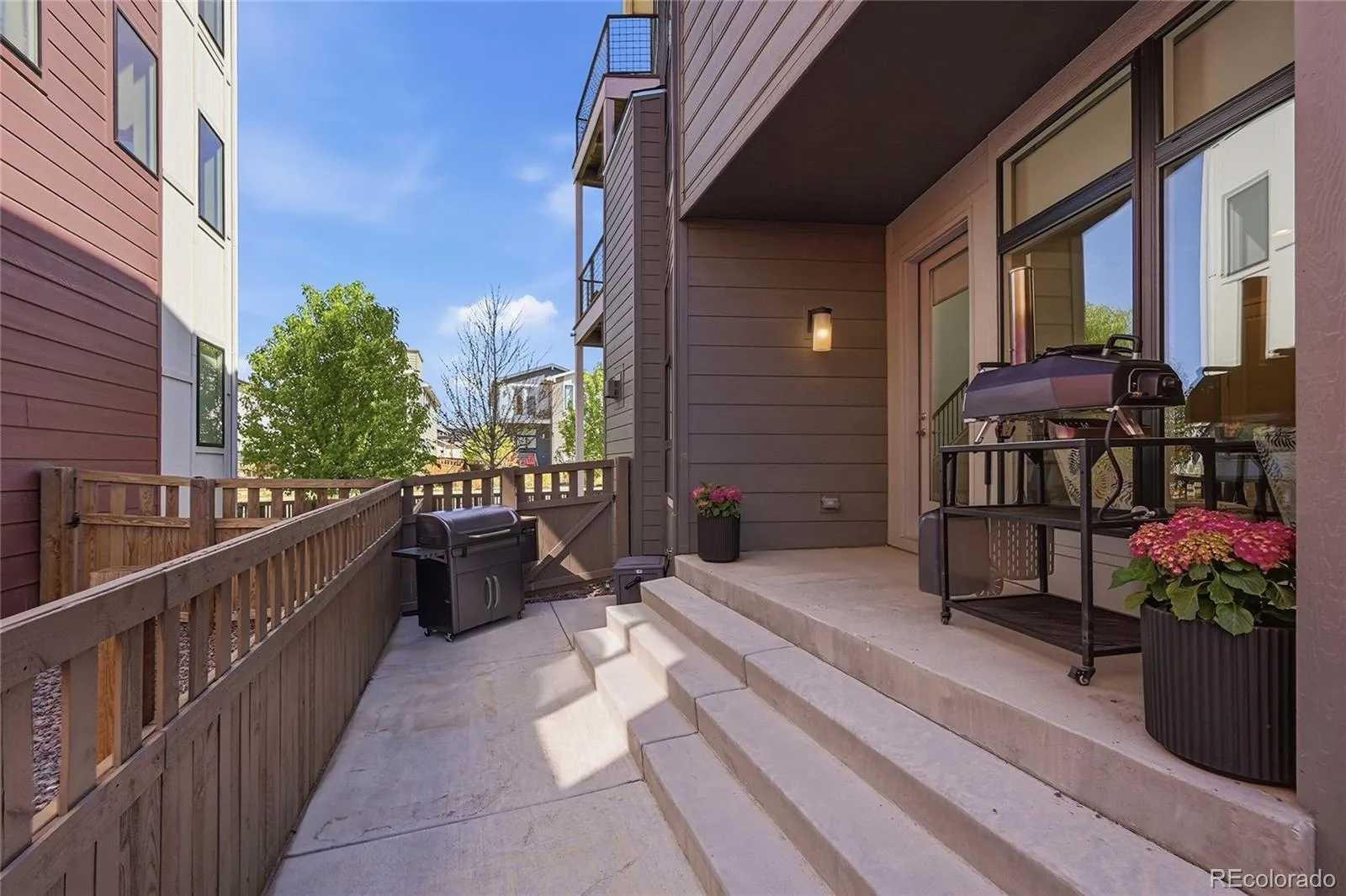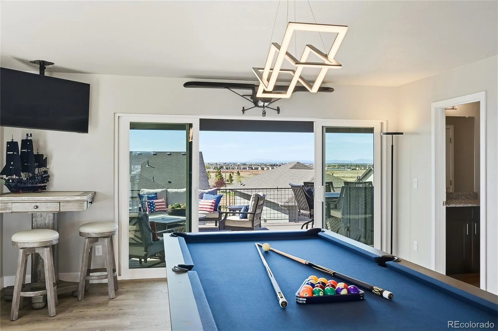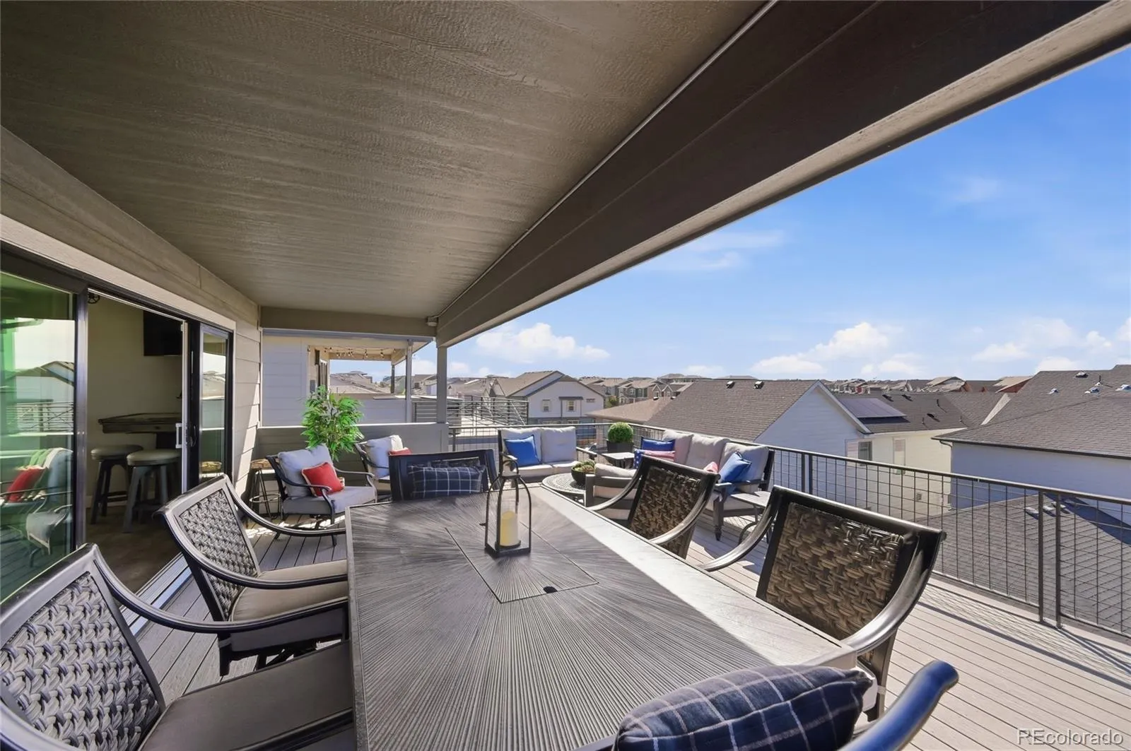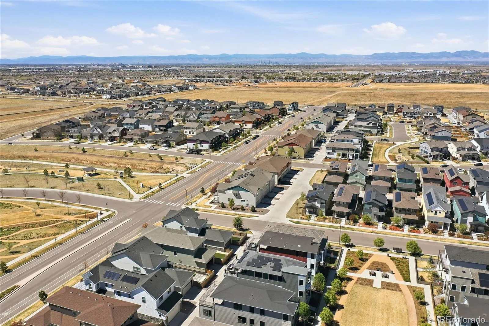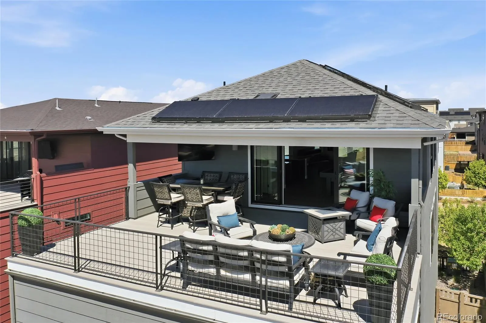 WELCOME to this stunning contemporary residence located in the dynamic Painted Prairie neighborhood- INFUSED with parks, trails and green spaces that welcome nature and promote community. Situated on a premier lot facing a delightful grassy courtyard, this modern home features three beds, four baths, various flexible living, dining, work and play spaces, a two-car garage and unfinished basement. This innovative floorplan was MADE for Colorado living, with its numerous patios, private balconies, and showstopping roof top deck with GLORIOUS MOUNTAIN VIEWS. Custom smart motorized window shades cover nearly every window in the home. A dramatic three-story foyer invites you into an expansive main living space with high ceilings, 8′ doors, chic gas fireplace, and gorgeous LVP wood-look flooring. The connecting chef’s kitchen features JennAir appliances, gas cooktop, white quartz, rich espresso maple cabinetry and an expansive granite island for dining and food prep. The expanded nearby side patio is the perfect spot for your grilling necessities. A half bath and oversized two car garage complete the first floor. The roomy loft on the second floor makes a great space for additional lounging, working or playing. The primary bedroom suite has its own private balcony, and en-suite bath with oversized shower, double vanities and walk-in closet. Two additional bedrooms and a full guest bath with double sinks are located down the hall. The laundry room is conveniently placed across from guest bath and features a charming coffee bar with built in cabinetry. Finally, a spectacular recreational room occupies the entire third floor and offers a private balcony, a wet bar/kitchenette complete with a beverage fridge, kegerator, and that ice maker you always wanted! The adjacent guest bath simplifies entertaining. Dual sliding glass doors open to an expansive partially covered roof top deck with unmatched mountain views! *NEW ROOF IN 2025*