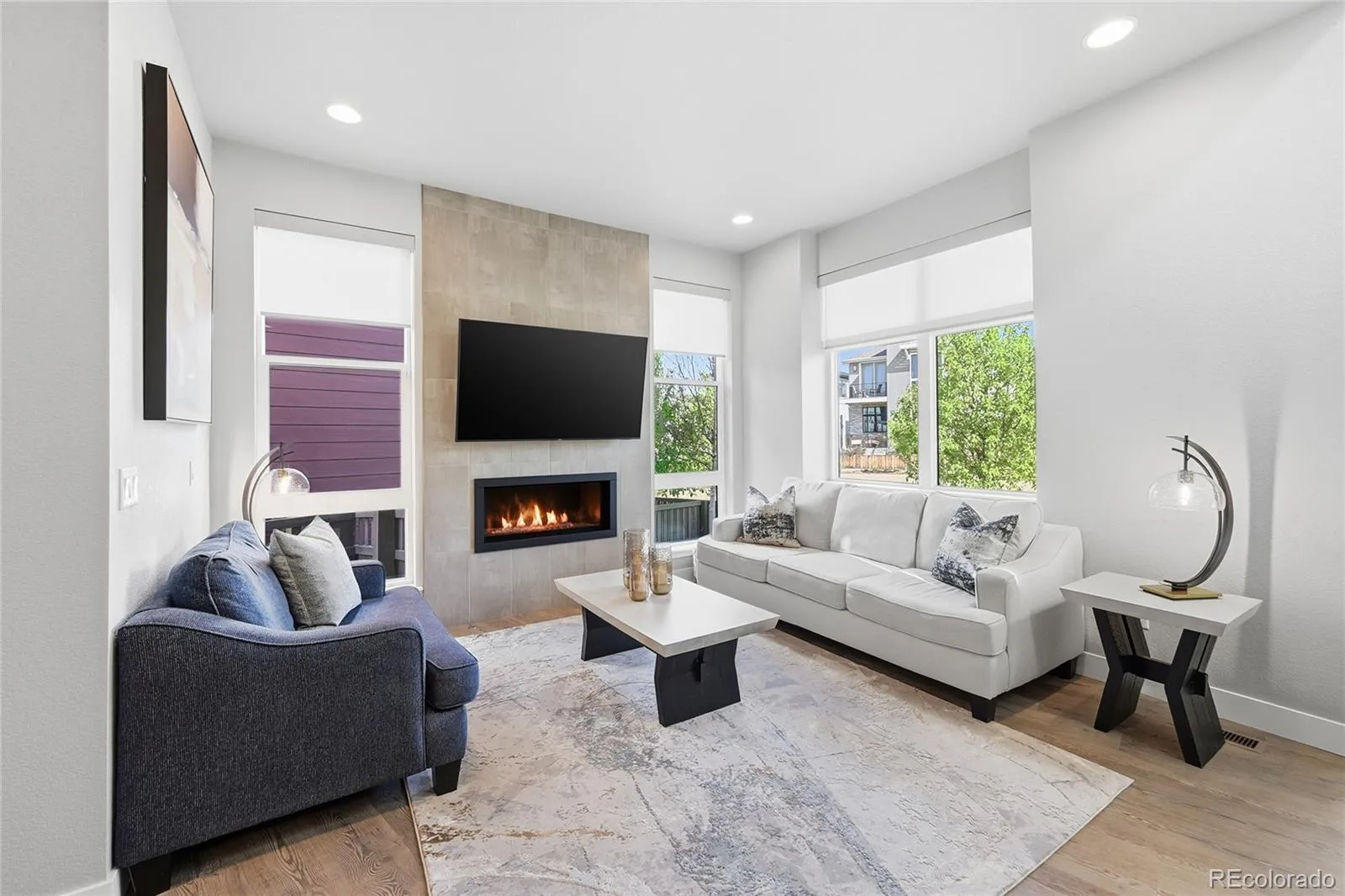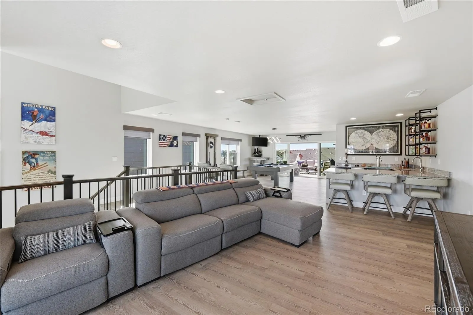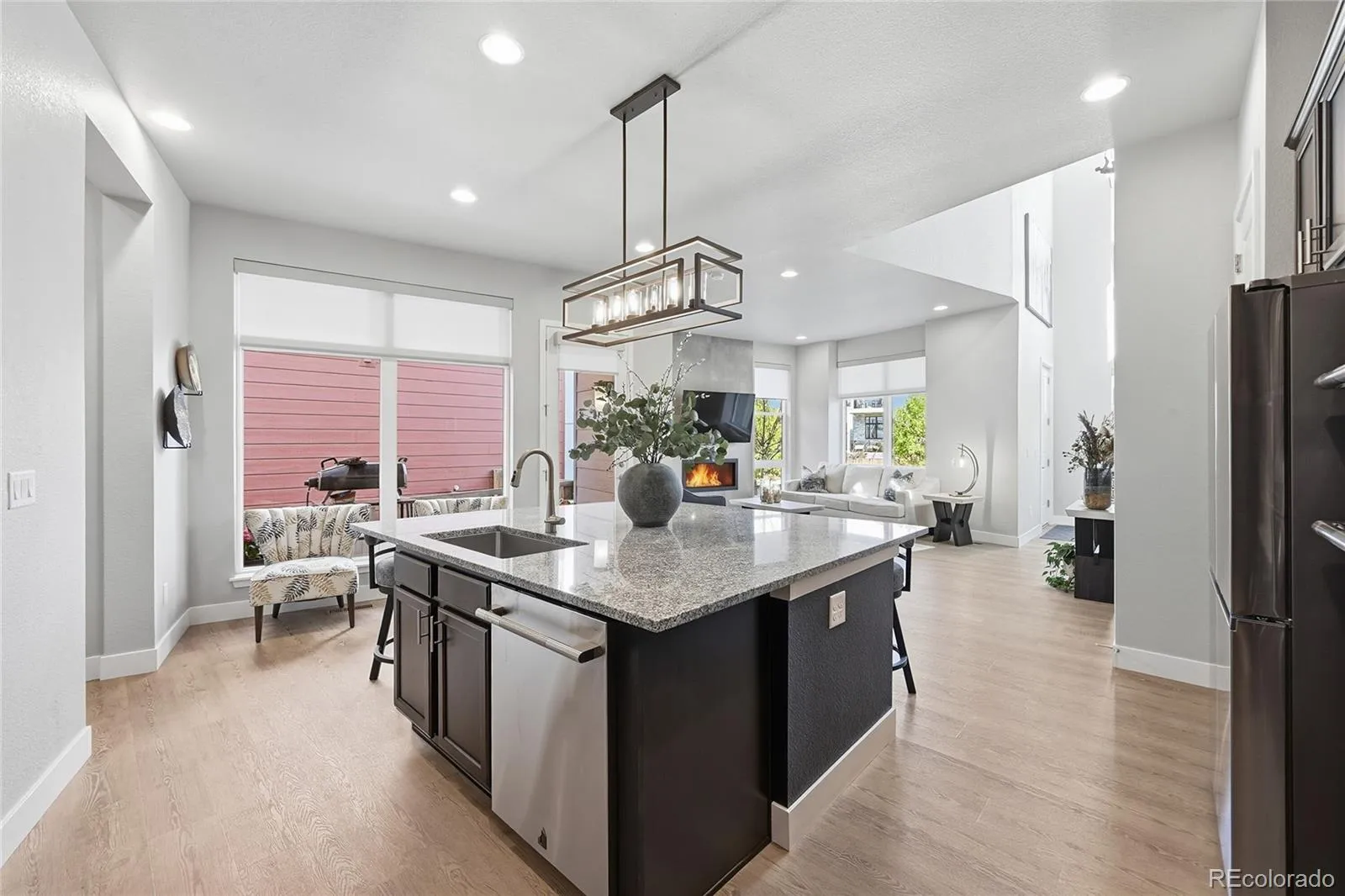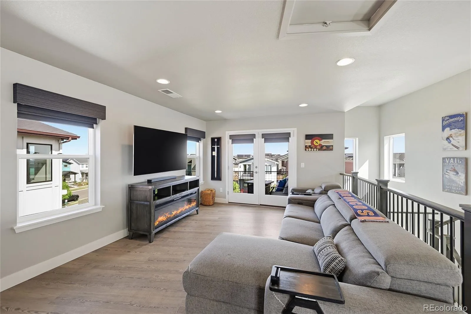 WELCOME to this stunning contemporary residence located in the dynamic Painted Prairie neighborhood- INFUSED with parks, trails and green spaces that welcome nature and promote community. Situated on a premier lot facing a delightful grassy courtyard, this modern home features three beds, four baths, various flexible living, dining, work and play spaces, a two-car garage and unfinished basement. This innovative floorplan was MADE for Colorado living, with its numerous patios, private balconies, and showstopping roof top deck with GLORIOUS MOUNTAIN VIEWS. Custom smart motorized window shades cover nearly every window in the home. A dramatic three-story foyer invites you into an expansive main living space with high ceilings, 8′ doors, chic gas fireplace, and gorgeous LVP wood-look flooring. The connecting chef’s kitchen features JennAir appliances, gas cooktop, white quartz, rich espresso maple cabinetry and an expansive granite island for dining and food prep. The expanded nearby side patio is the perfect spot for your grilling necessities. A half bath and oversized two car garage complete the first floor. The roomy loft on the second floor makes a great space for additional lounging, working or playing. The primary bedroom suite has its own private balcony, and en-suite bath with oversized shower, double vanities and walk-in closet. Two additional bedrooms and a full guest bath with double sinks are located down the hall. The laundry room is conveniently placed across from guest bath and features a charming coffee bar with built in cabinetry. Finally, a spectacular recreational room occupies the entire third floor and offers a private balcony, a wet bar/kitchenette complete with a beverage fridge, kegerator, and that ice maker you always wanted! The adjacent guest bath simplifies entertaining. Dual sliding glass doors open to an expansive partially covered roof top deck with unmatched mountain views! *NEW ROOF IN 2025*