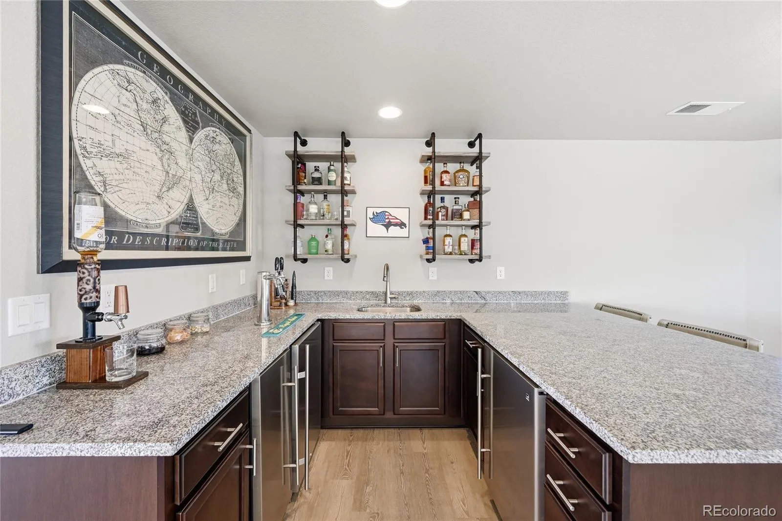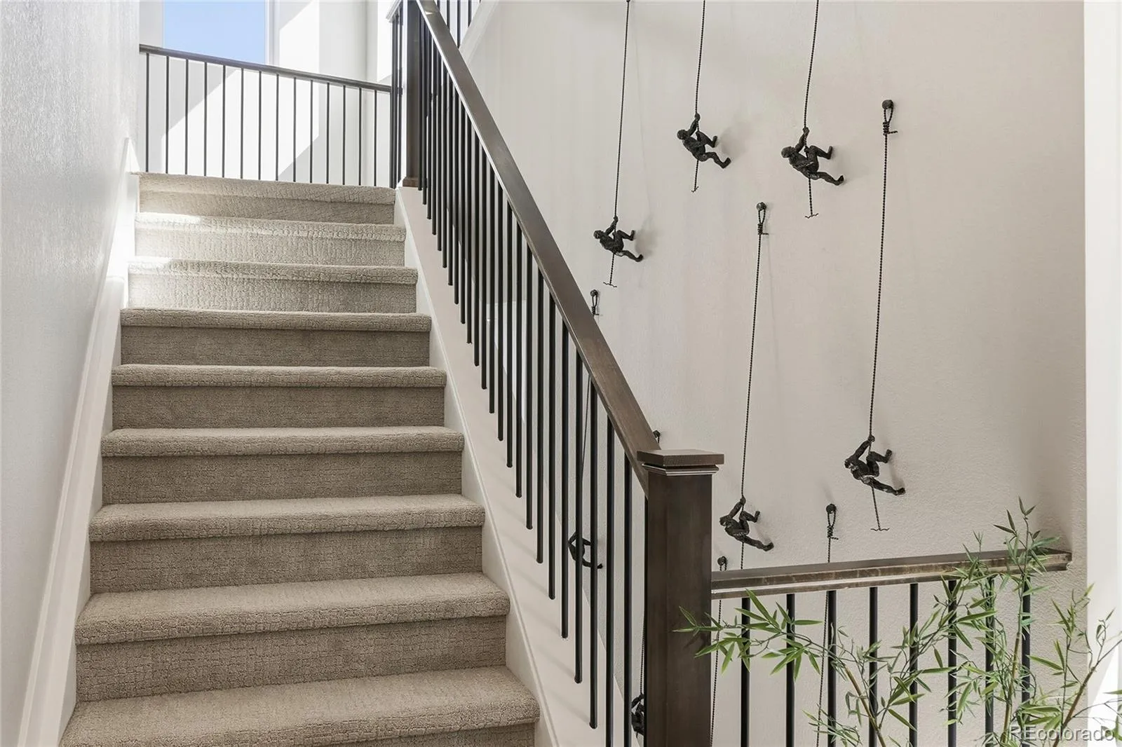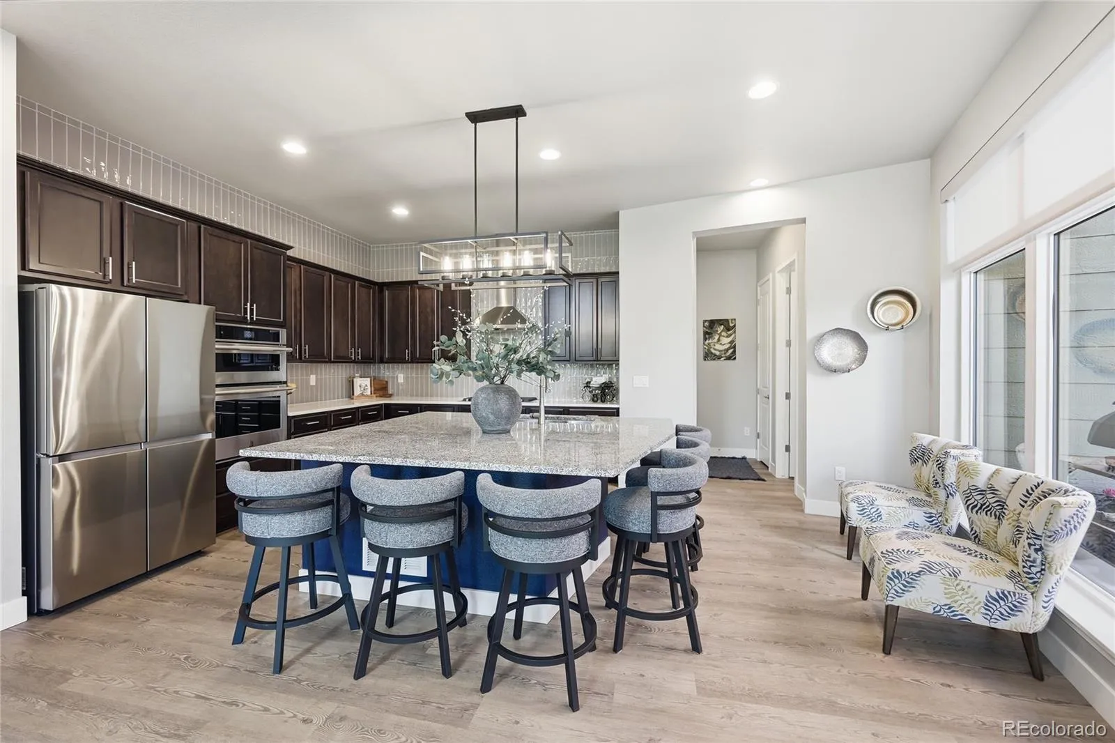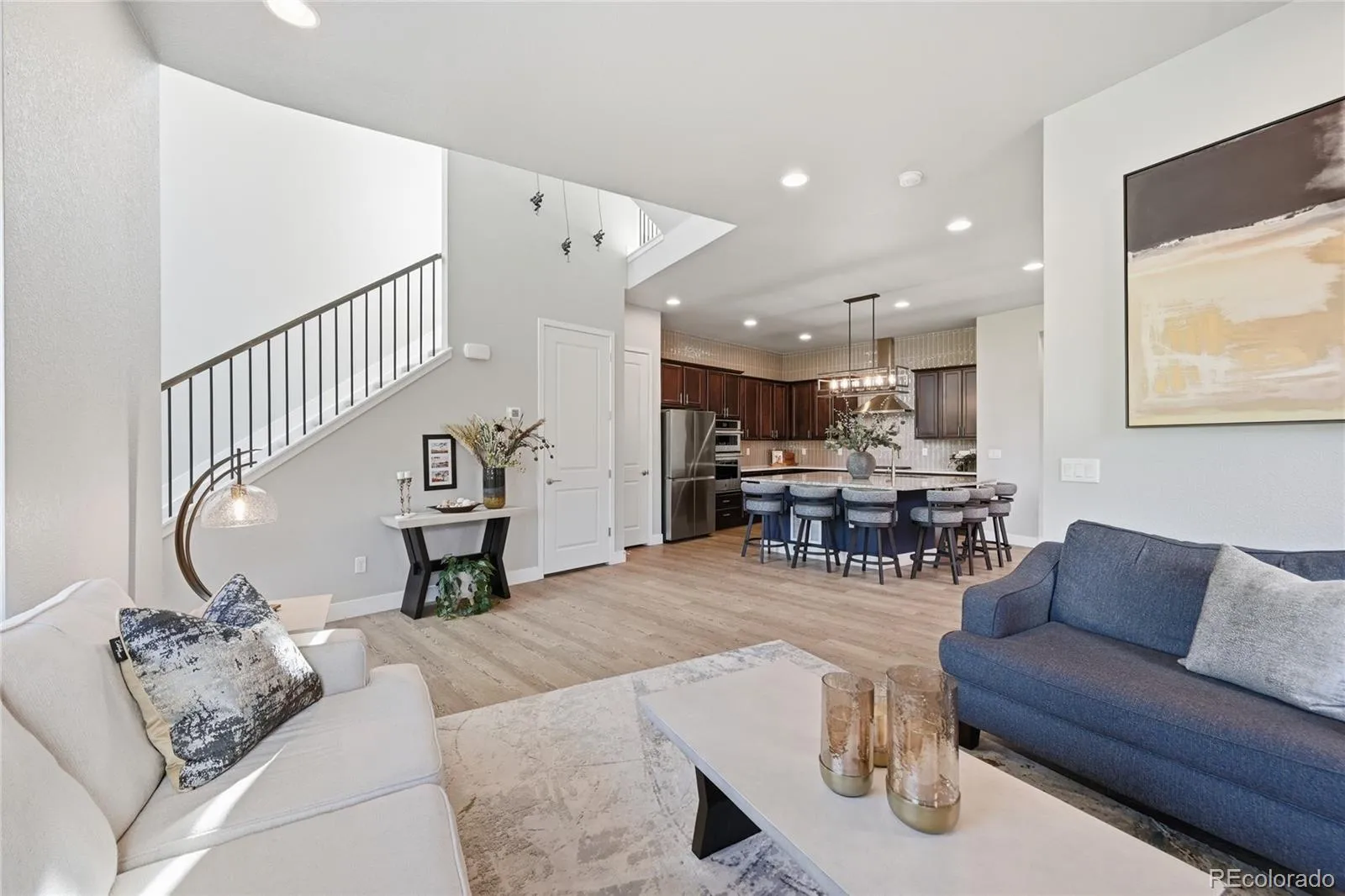 WELCOME to this stunning contemporary residence located in the dynamic Painted Prairie neighborhood- INFUSED with parks, trails and green spaces that welcome nature and promote community. Situated on a premier lot facing a delightful grassy courtyard, this modern home features three beds, four baths, various flexible living, dining, work and play spaces, a two-car garage and unfinished basement. This innovative floorplan was MADE for Colorado living, with its numerous patios, private balconies, and showstopping roof top deck with GLORIOUS MOUNTAIN VIEWS. Custom smart motorized window shades cover nearly every window in the home. A dramatic three-story foyer invites you into an expansive main living space with high ceilings, 8′ doors, chic gas fireplace, and gorgeous LVP wood-look flooring. The connecting chef’s kitchen features JennAir appliances, gas cooktop, white quartz, rich espresso maple cabinetry and an expansive granite island for dining and food prep. The expanded nearby side patio is the perfect spot for your grilling necessities. A half bath and oversized two car garage complete the first floor. The roomy loft on the second floor makes a great space for additional lounging, working or playing. The primary bedroom suite has its own private balcony, and en-suite bath with oversized shower, double vanities and walk-in closet. Two additional bedrooms and a full guest bath with double sinks are located down the hall. The laundry room is conveniently placed across from guest bath and features a charming coffee bar with built in cabinetry. Finally, a spectacular recreational room occupies the entire third floor and offers a private balcony, a wet bar/kitchenette complete with a beverage fridge, kegerator, and that ice maker you always wanted! The adjacent guest bath simplifies entertaining. Dual sliding glass doors open to an expansive partially covered roof top deck with unmatched mountain views! *NEW ROOF IN 2025*