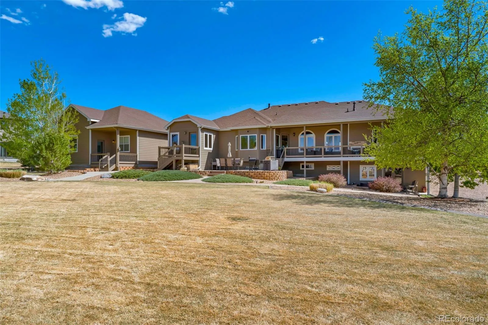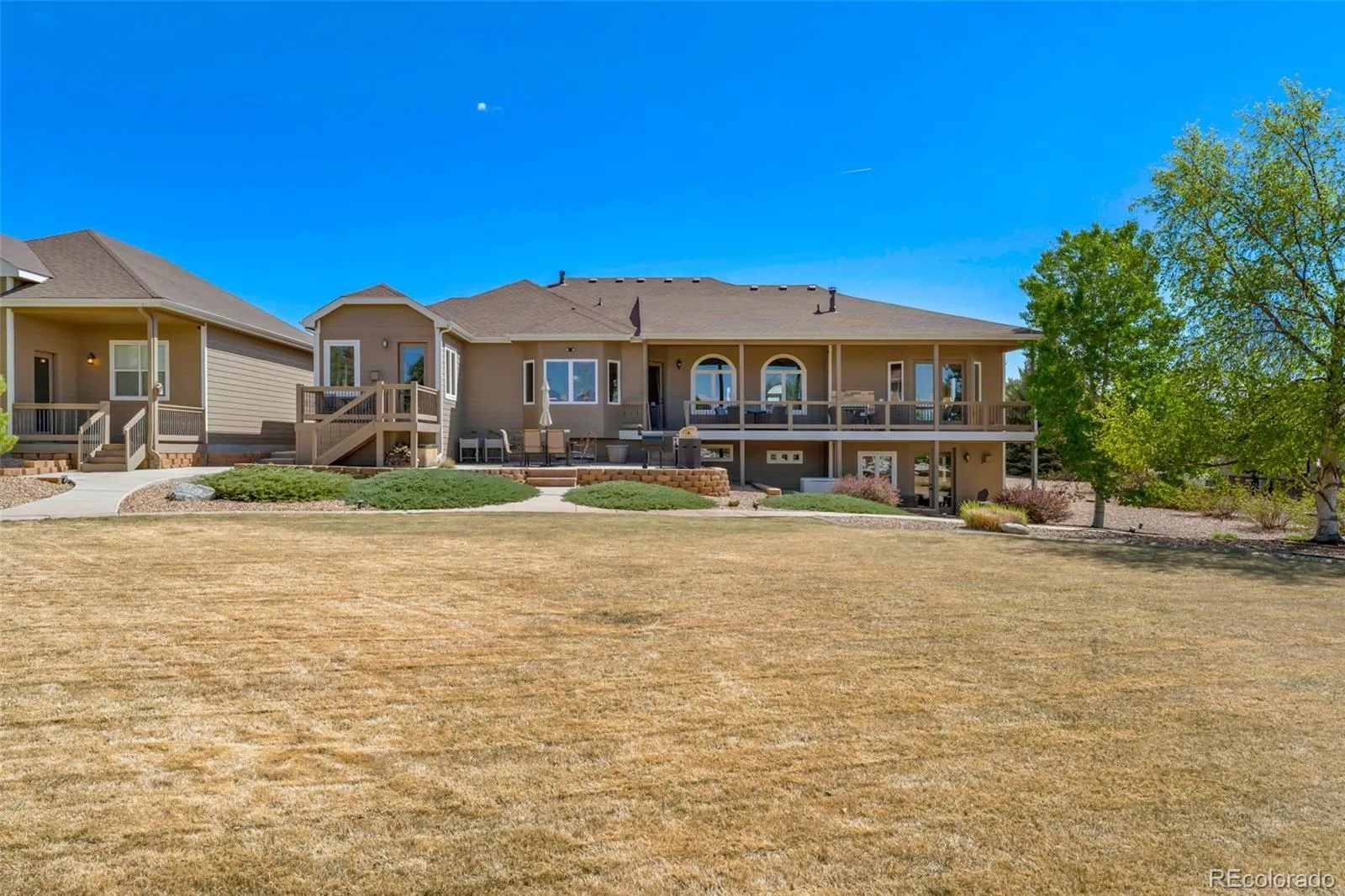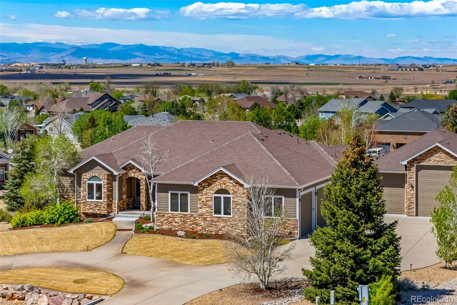 Amazing mountain views with a private, peaceful setting make this exceptional acre property a true stand out. This beautifully designed custom ranch home has 5 beds, 5 baths, and a main floor office with a private entrance. As soon as you enter, you will find spacious, inviting open-concept living with vaulted ceilings, big windows and beautiful hardwood floors. This living area includes a large family room with fireplace, a sitting room, dining space, a spacious kitchen with second dining and a large walk-in pantry. Also, located on the main level is the primary suite with a walk-in shower, jacuzzi tub, walk-in closet and French doors opening to the deck. There is a second large bedroom on the main level with a private full bath. The private office with warm finishes is ideal for working from home, meeting clients (enter from inside or outside), or just relaxing. The finished walk-out basement expands the living space with a family room/wet bar, 3 large bedrooms, 2 bathrooms, and a spacious flex room or theatre. Outdoor living includes a large covered, main-level deck with incredible mountain views, sunsets, and a built-in gas fireplace. Enjoy a ground-level patio connected to the main level deck and a second patio on the walk-out level. Take in the fully mature, beautiful landscape from all levels. The oversized attached 3 bay garage is 36’ by 36’, fully finished with 10’ overhead doors and built-in cabinets/countertop. The detached RV garage is fully finished, including epoxy floors and an entry door from a private, rear deck. It has expansive space with one bay featuring a 14-ft. door and 45-ft. depth, and the other providing a 12.5-ft. door and 36-ft. depth. Other highlights include dual fuel heating, cooling, and hot water, whole-house air purification system, backup electric power system. Ideally located with easy access to major highways, airport, shopping, dining, and everyday conveniences, including Costco.