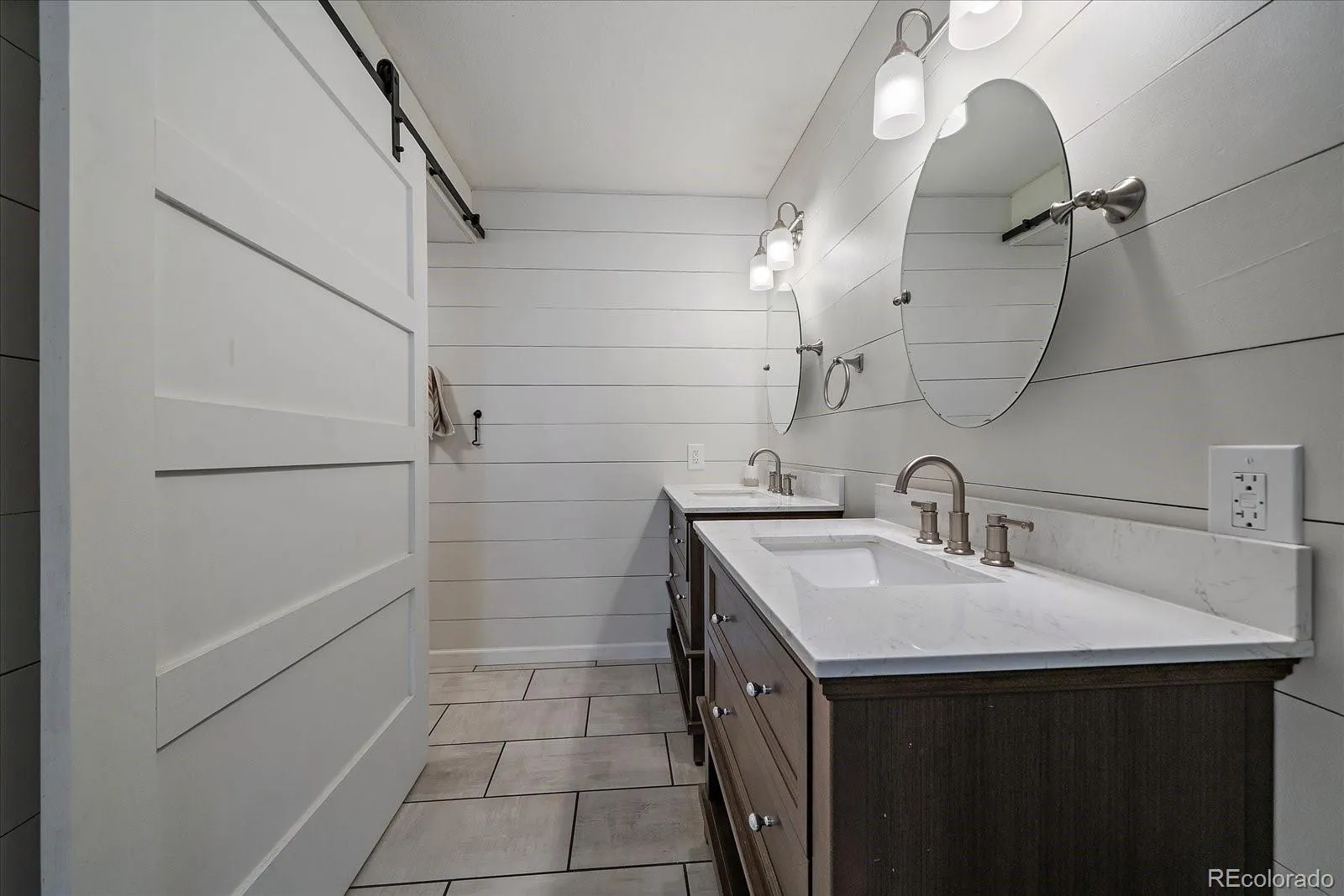 The kitchen is bright and functional with white cabinetry, butcher block counters, and direct access outside—perfect for casual mornings or hosting friends. A rare main-level primary suite features dual sinks, shiplap accents, and a stylish barn door for a modern touch. Upstairs offers a flexible loft or office space plus a guest suite, while the finished basement adds a second living area, third bedroom, updated bath, and laundry.