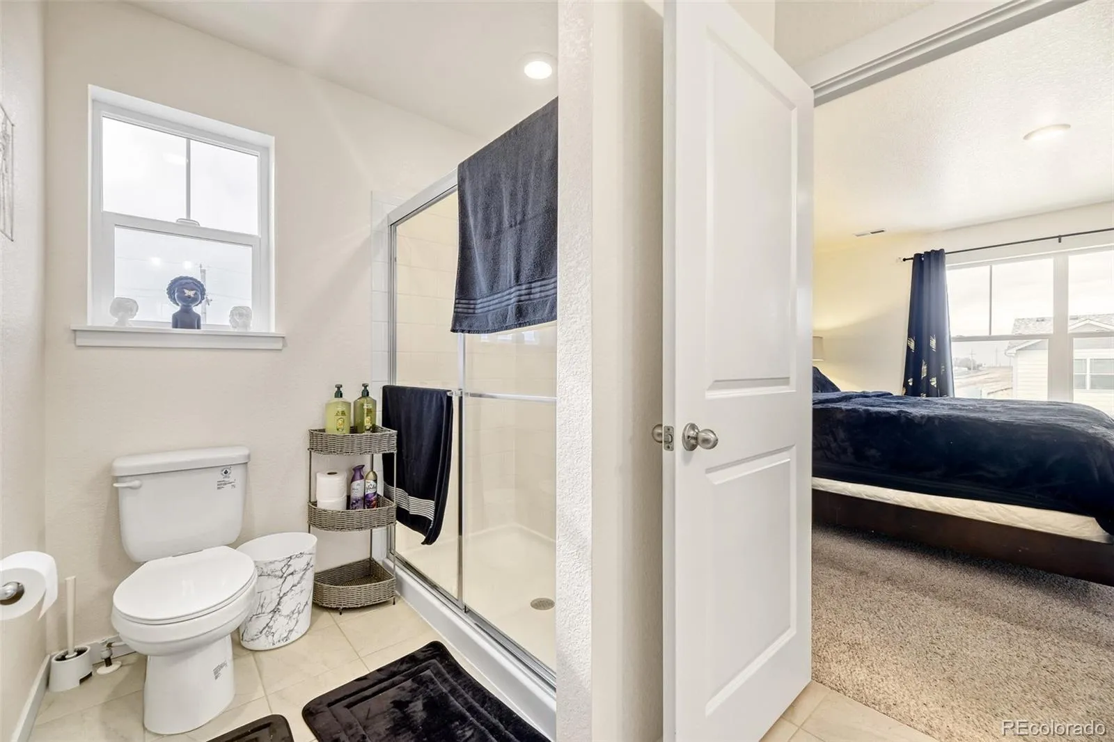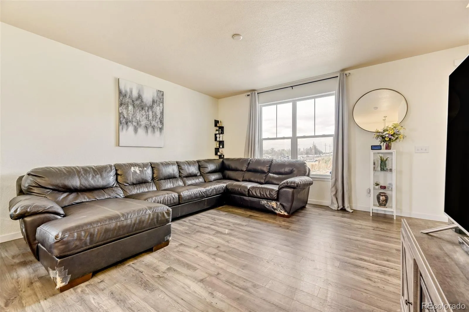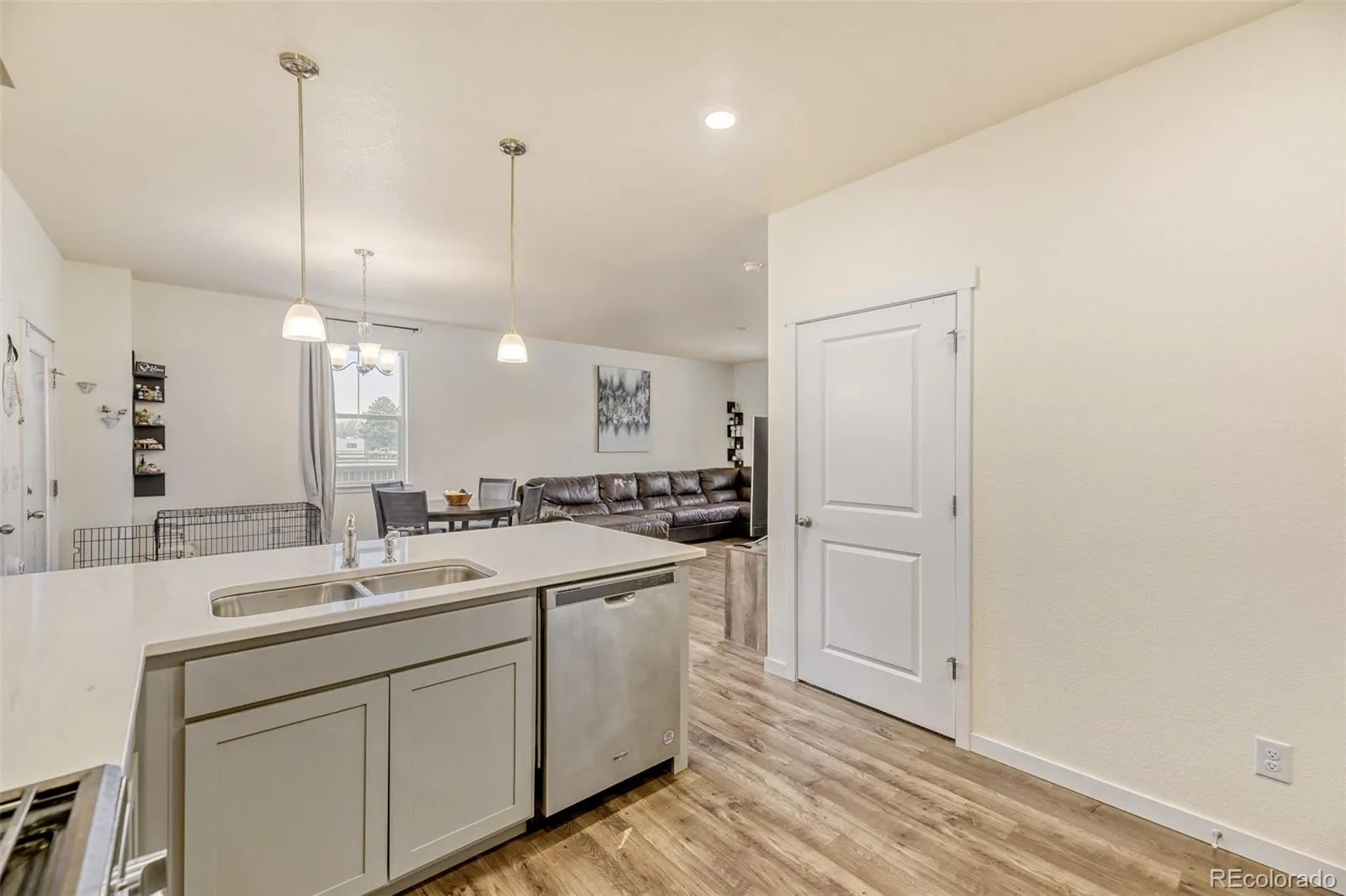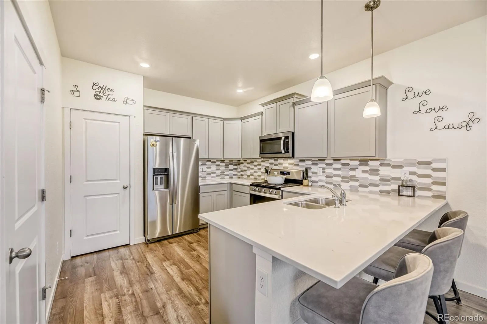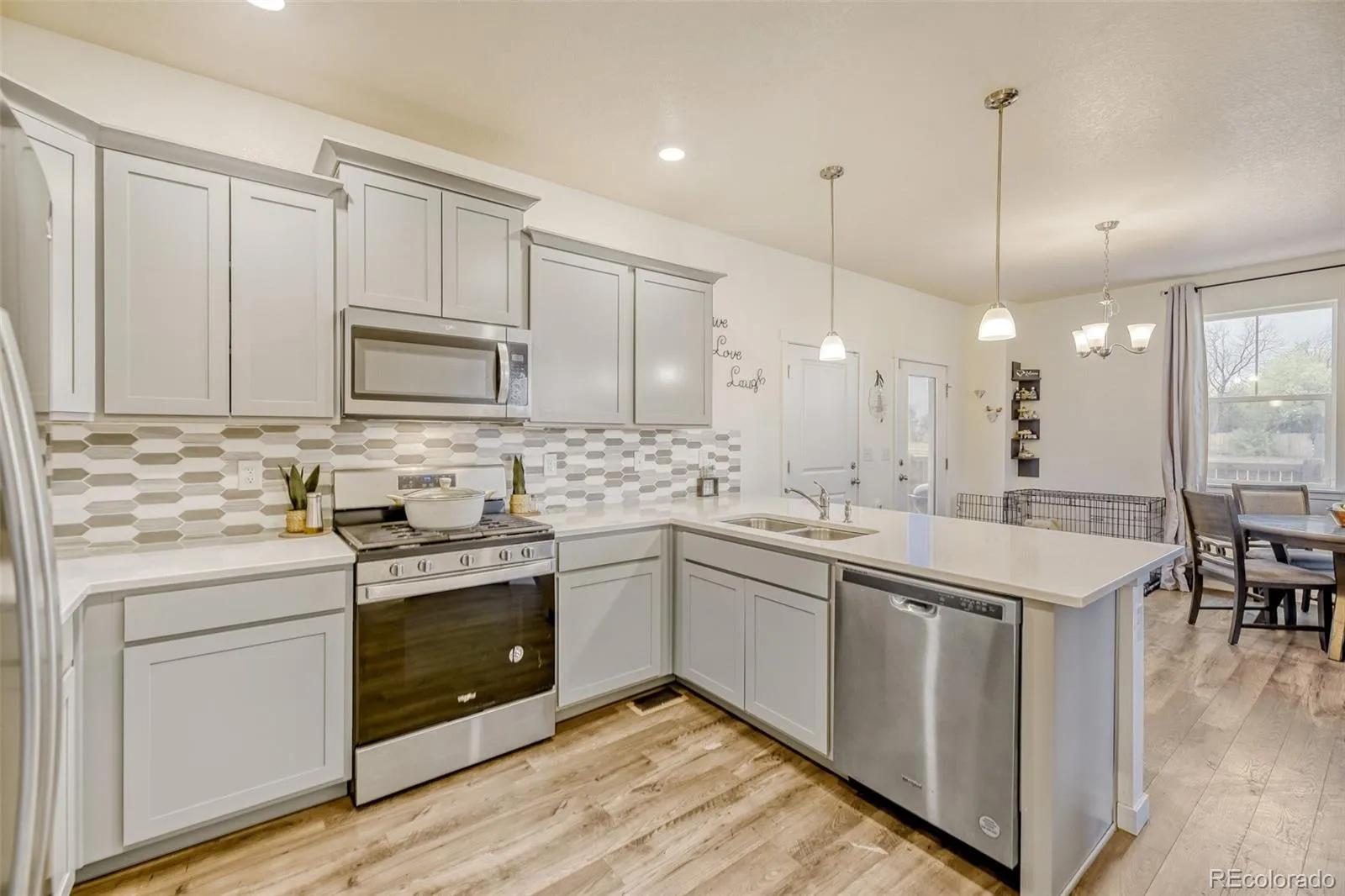 The open-concept floor plan is filled with natural light. It features a modern kitchen with quartz countertops, tiled backsplash, gray cabinetry, stainless steel appliances, gas range, and a spacious pantry. The living and dining areas flow seamlessly, ideal for everyday living and entertaining.