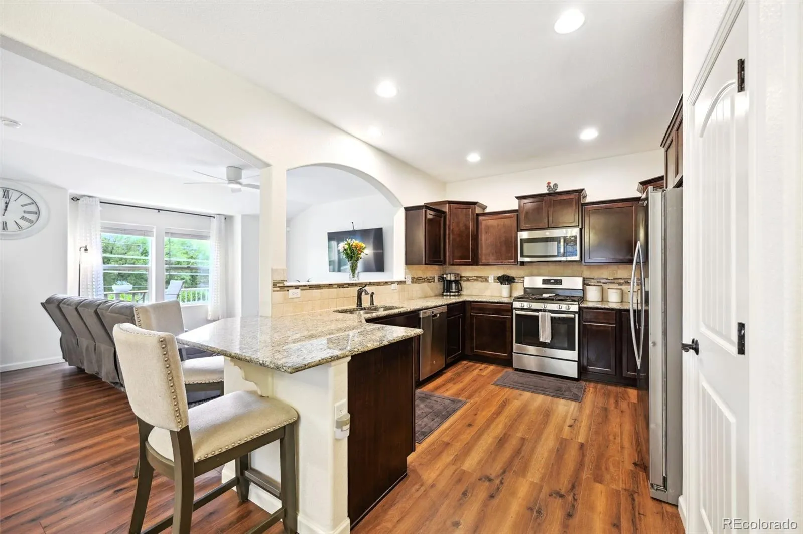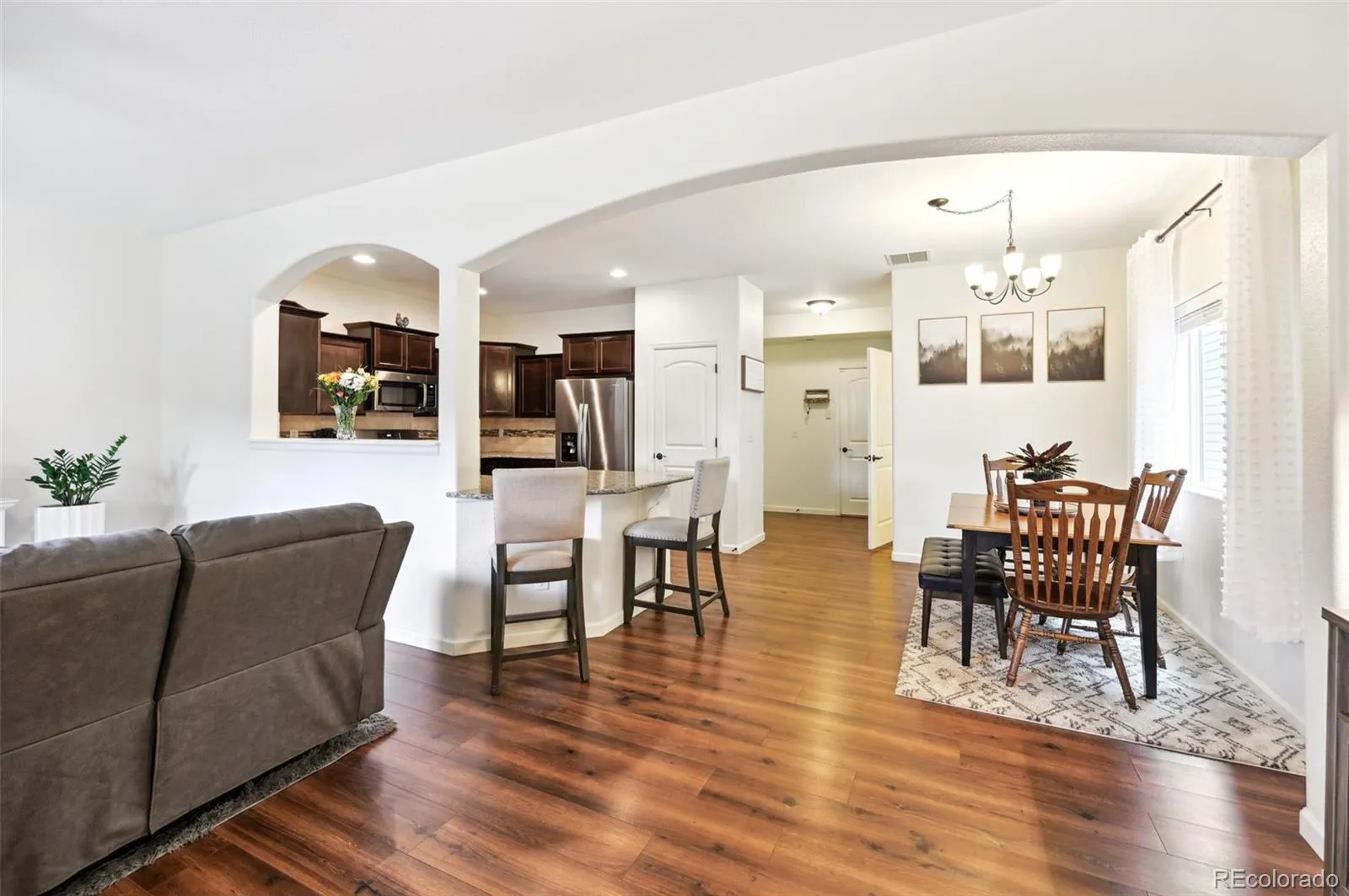 Welcome to this beautiful end unit townhome which has been meticulously maintained. Facing the trees and to the West, you can enjoy both the surrounding scenery and some amazing mountain views! Built in 2018, this home presents as if it’s brand-new offering 3 bedrooms, 3 bathrooms, and a spacious 2 car attached garage. From the moment you walk in the door, you’ll love the openness and all of the natural light that pours in. This open floorplan is perfect for entertaining. There is a large picture window in the front that overlooks the trees and green space. The kitchen has granite countertops, staggered cabinetry, countertop seating, a pantry, stainless steel appliances, and an abundance of cabinet space. You’ll enjoy having LVT flooring throughout the main level. There is a guest powder bath on the main level and a couple of storage closets. Upstairs, you’ll love the convenience of having the laundry room between the bedrooms. The primary bedroom is spacious enough to comfortably accommodate a restful sleeping area, along with an intimate sitting area or a dedicated workspace, providing both relaxation and functionality in one seamless design. There is a large walk-in closet along with a beautiful bath with an oversized shower and double vanity with granite countertops. There are an additional 2 bedrooms upstairs both with stellar mountain views and walk-in closets along with another full-size bathroom. This home comes equipped with A/C perfect for the summertime. And the best summer feature is the clubhouse and pool available to the owners! There is a dog park area, firepit, private gym, and ample amount of additional guest parking. Be prepared to be the place where everyone wants to visit this summer to enjoy all that this home and community has to offer!