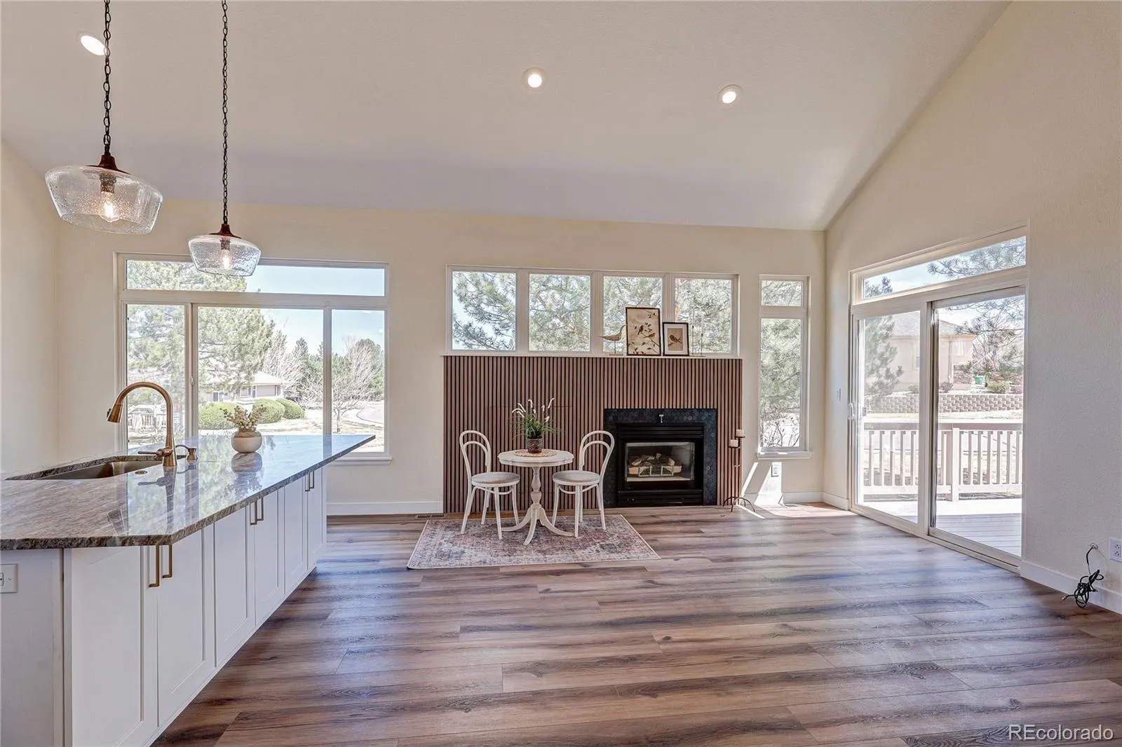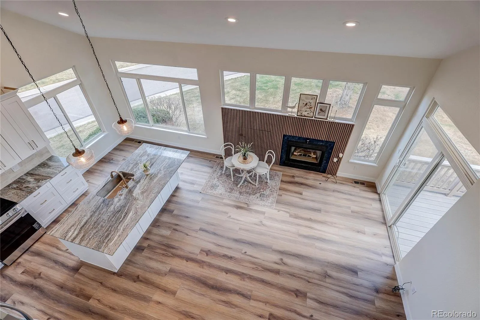 The spacious kitchen features a large island, new cabinetry, quartz countertops, and upgraded high-end appliances, opening to a light-filled great room with a cozy fireplace and access to an expansive deck—perfect for relaxing or entertaining. The main level also includes formal living and dining spaces along with a convenient mail level laundry room.