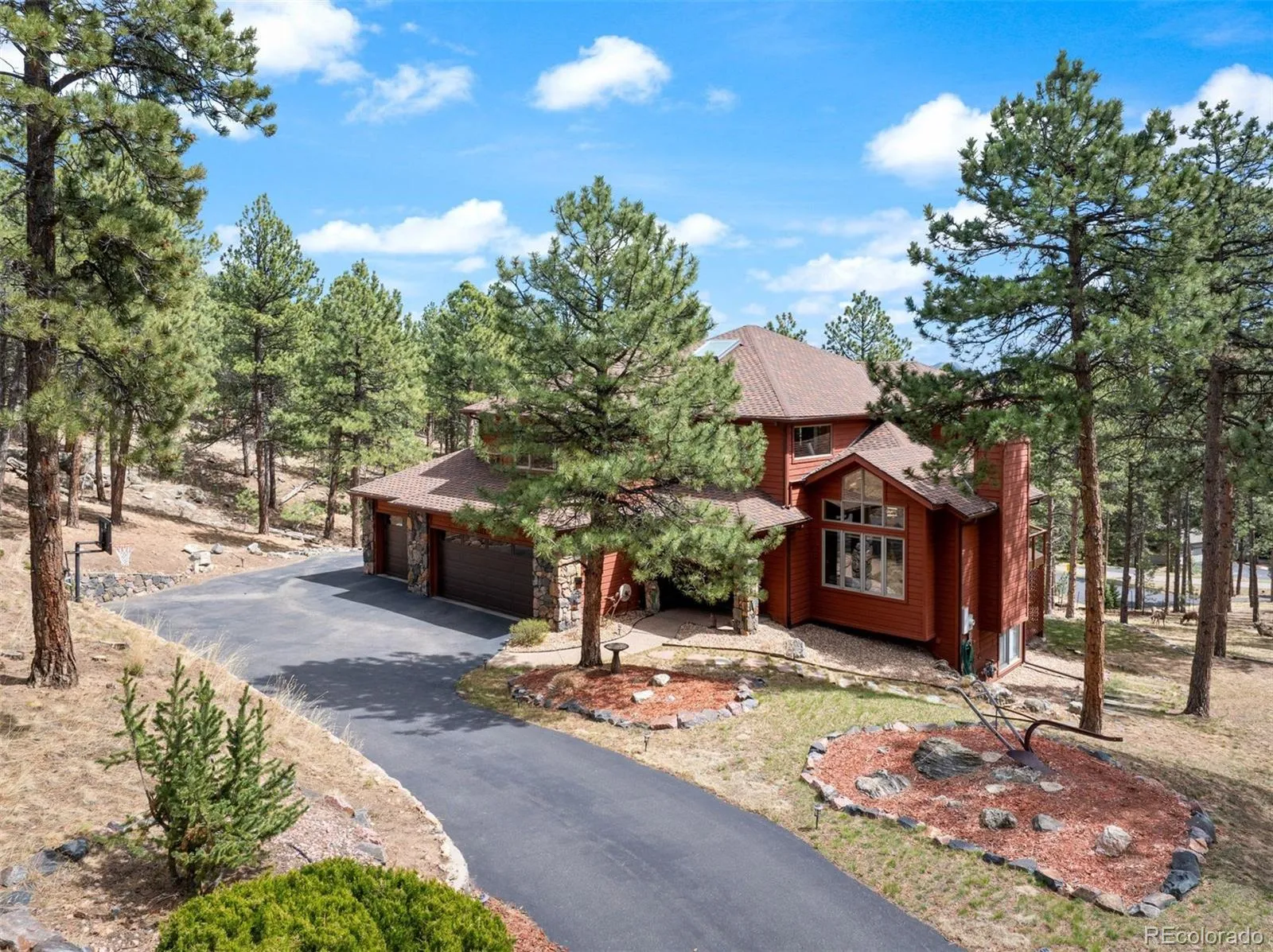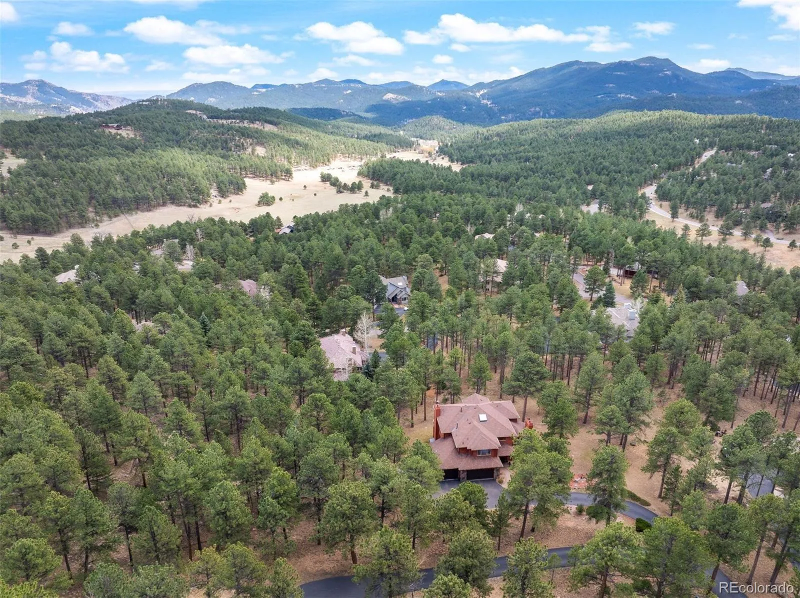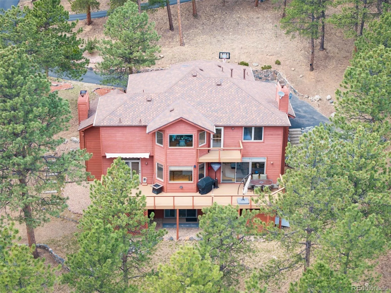 Your Shire Awaits! Nestled in on 1.02 Acres that backs to open space in The Ridge at Hiwan. Pride of ownership throughout and attention to every detailed. Meticulous maintained home with many updates to include hardwood floors, new deck, updated kitchen, bathrooms, deck awning, LED lighting, primary closet system, furnace, gutters, humidifier, hot tub, new stainless steel appliances and ceiling fans. Spacious vaulted ceilings in the great room with a cozy fireplace for enjoying snowy winter evenings. Updated kitchen is the perfect entertaining space with easy access to the outdoor deck. The new deck is the perfect location for enjoying a morning cup of coffee and the daily wildlife sightings of deer and elk. A rare 6 bedroom find in the heart of Evergreen. Primary upper level bedroom suite with a spa like spacious primary bathroom. This spacious primary has an amazing mountain view with plenty of room for a California King size bed, dressers, nightstands and even an office space or a reading nook. Home is tucked in at the end of the Cul De Sac. Great location very close to schools, hiking & biking trails, restaurants and retail shopping. Within 7 minutes of I-70 making for a very easy commute to Denver, DIA or Skiing!