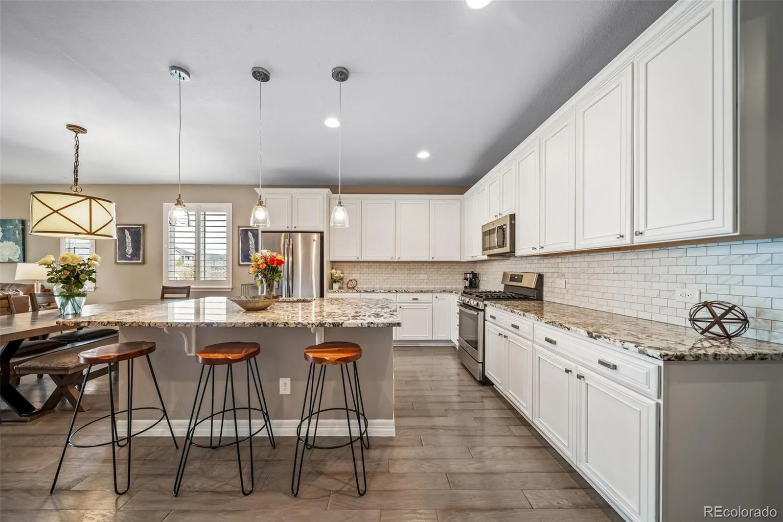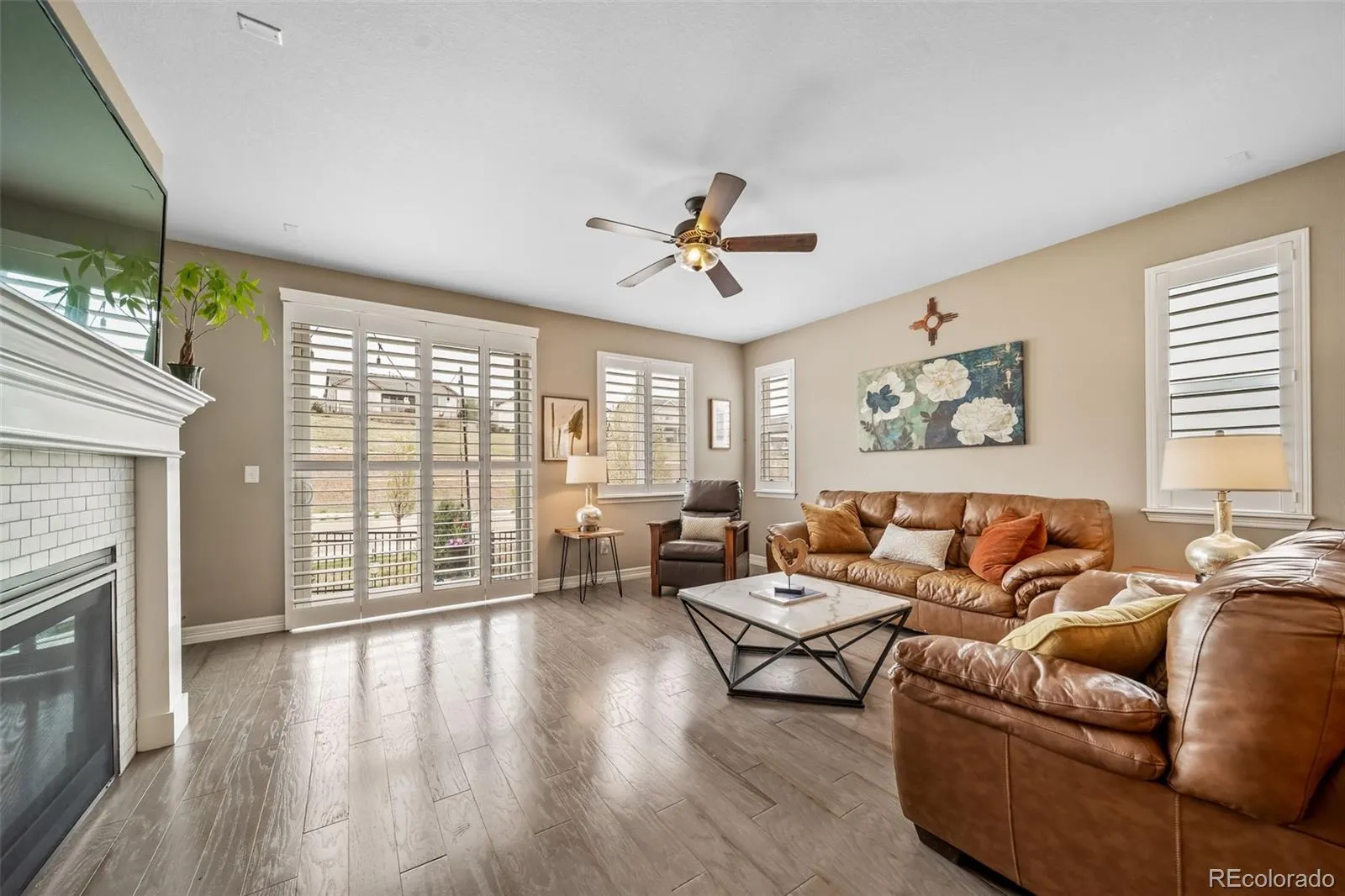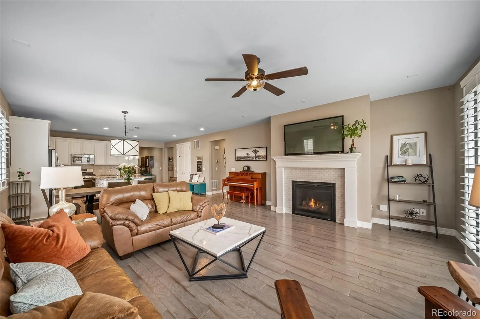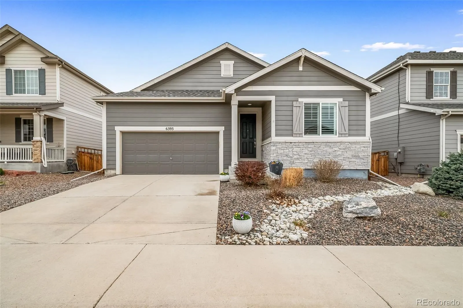 Welcome to this beautifully maintained ranch home in Cobblestone Ranch, offering effortless main-level living with 3 bedrooms, 2 bathrooms, and a 2-car garage. Thoughtfully designed with an open layout and upgraded with stylish finishes throughout, this home blends comfort, functionality, and low-maintenance living. Step inside to find wood flooring flowing seamlessly throughout the entire main living space (NO carpet!), creating a clean look that is both durable and on-trend. The sunlight-filled great room centers around a cozy gas fireplace and opens easily to the kitchen and dining areas, making everyday living and entertaining feel natural and connected. The kitchen features stunning granite countertops, a large center island with seating, stainless steel appliances, abundant cabinetry, and a subway tile backsplash. A spacious pantry and prep space make it as practical as it is inviting. The primary suite offers a peaceful retreat with plenty of natural light, a large walk-in closet, and a bath with dual sinks and an oversized walk-in shower. Two more bedrooms are positioned at the front of the home, offering flexibility for guests, hobbies, or a home office, with a full bathroom nearby. Additional highlights include gorgeous shutters, a dedicated laundry room, 8 foot doors, and thoughtful storage throughout. The unfinished basement offers almost 2000 square feet of untapped potential! Outside, enjoy a low-water, low-maintenance yard with an extended patio and seating areas—perfect for relaxing evenings or casual gatherings. The setting offers a sense of openness with views of the surrounding neighborhood and nearby green space. Living in Cobblestone Ranch means access to neighborhood amenities including a community pool, park, clubhouse, and pickleball courts, all just minutes away. The home includes a solar energy system that helps offset a portion of the property’s electricity usage, contributing to overall energy efficiency. View this incredible home today!