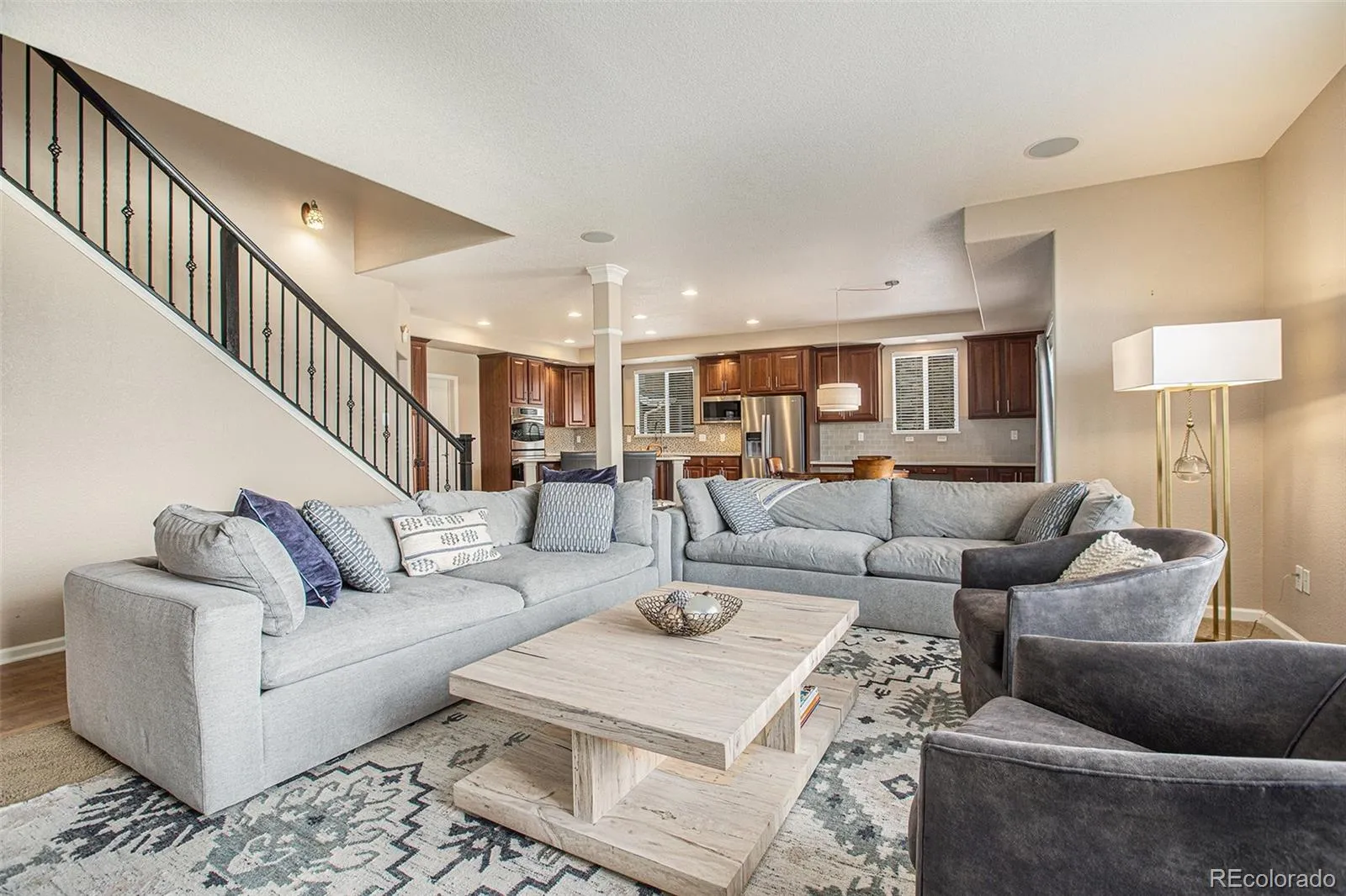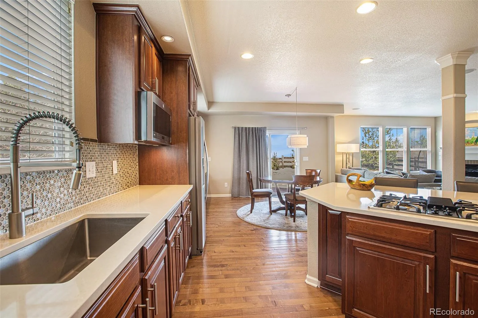 Backing to a greenbelt and designed for everyday living, this Tallyn’s Reach home delivers the space, function, and Colorado lifestyle buyers are after. Step inside to an open main level where the kitchen, dining, and living areas flow together—ideal for entertaining or keeping life simple. The kitchen offers a large island, abundant cabinetry, stainless steel appliances, and a bright breakfast nook that opens to the backyard.