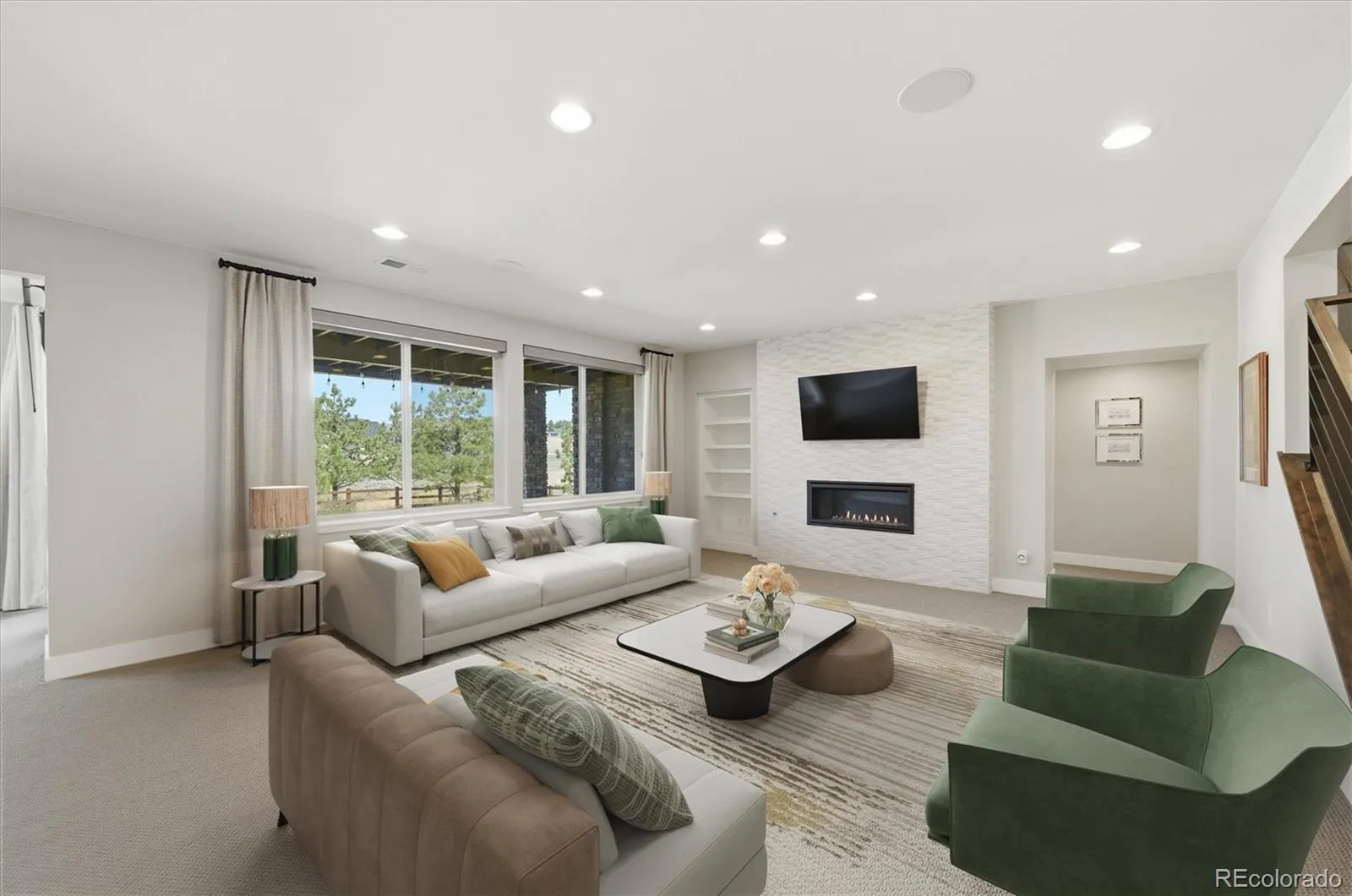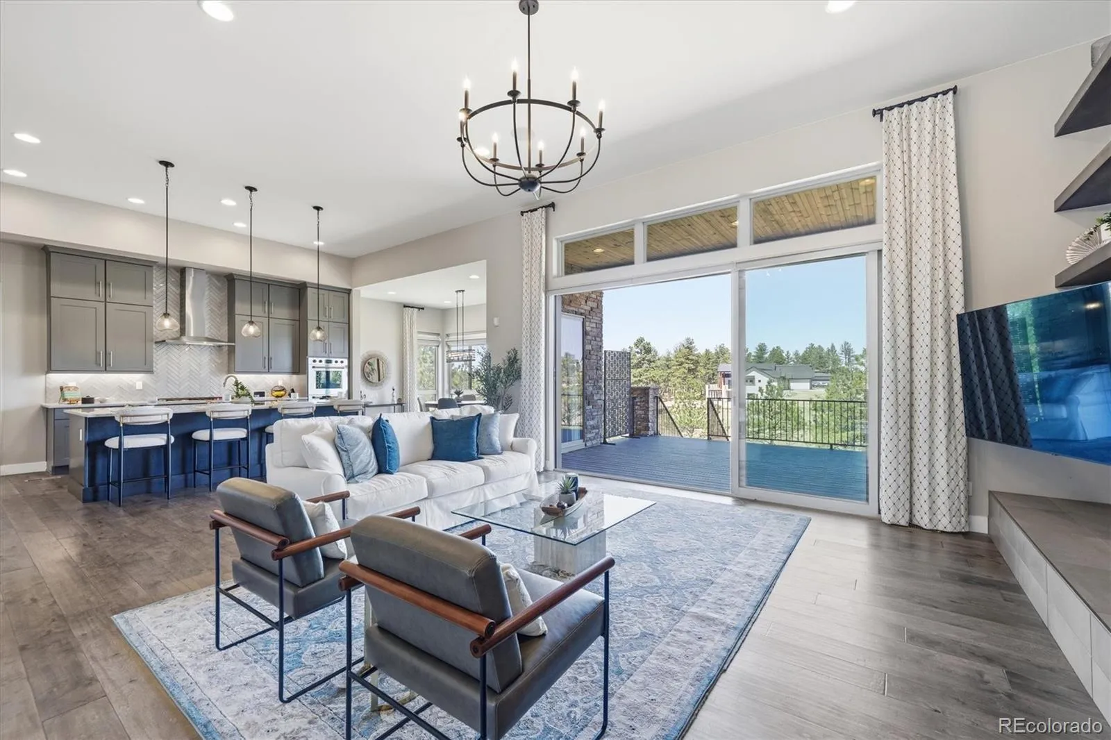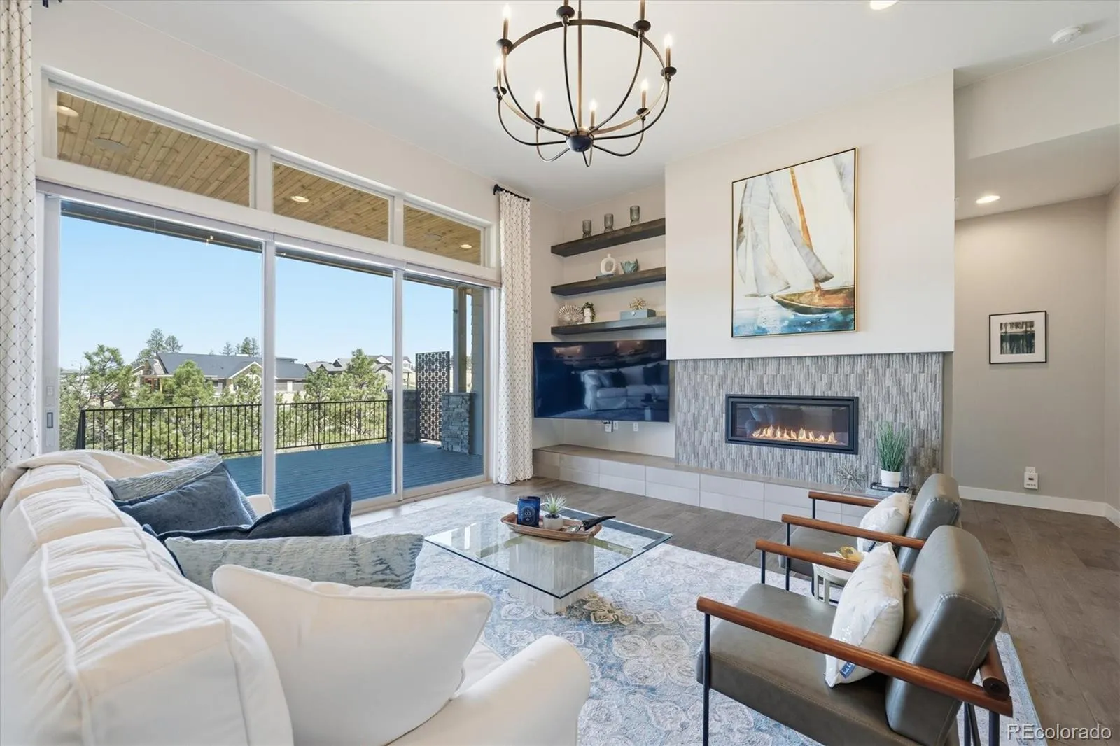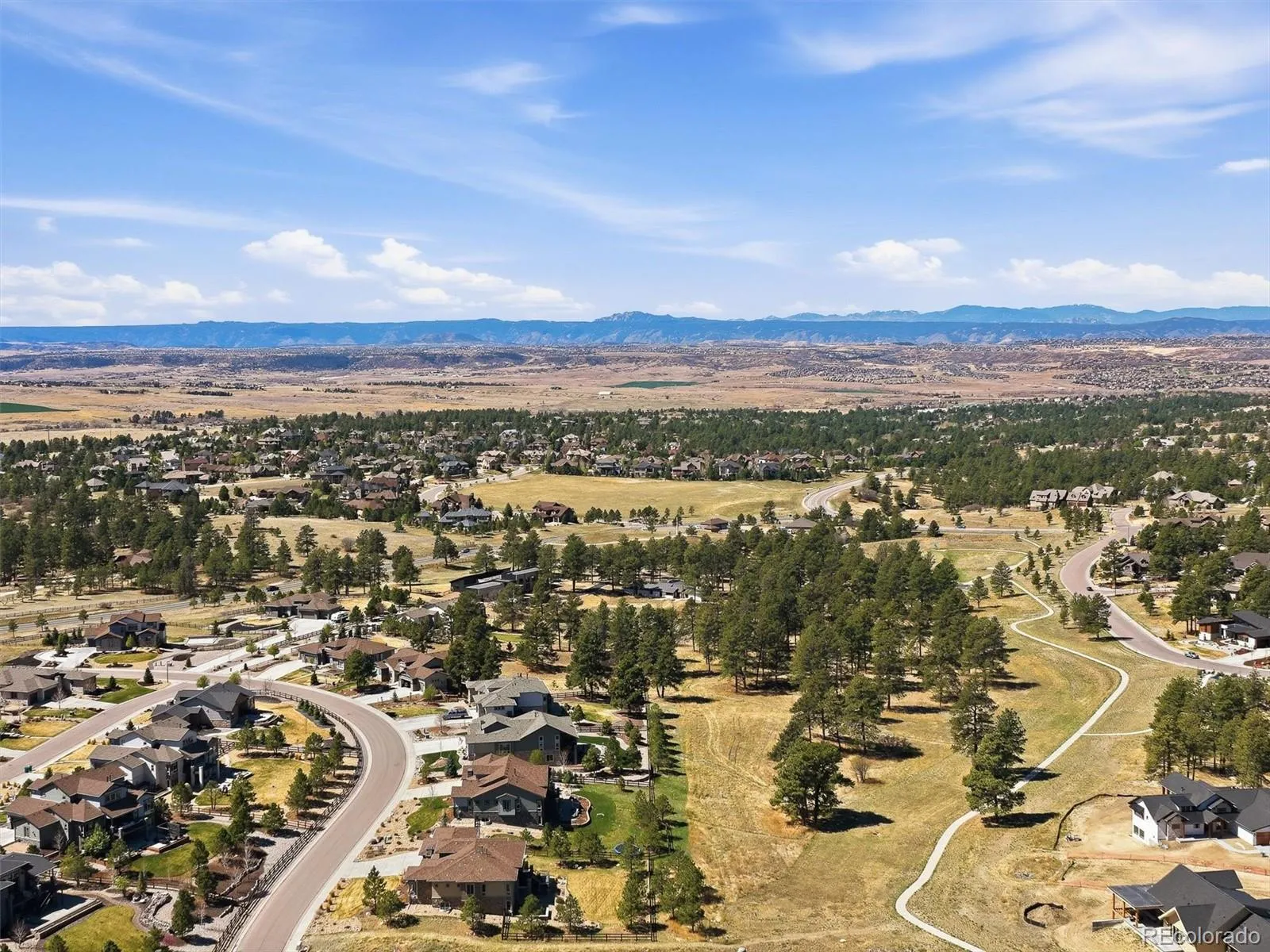 Elevated Living in The Timbers & NO HOA- Experience refined Colorado living in this immaculate, semi-custom ranch by Berkeley Homes. Perfectly positioned on a private, tree-filled 24,437 sq ft lot, this home backs and sides to open space and trails – offering rare privacy, views, and seamless access to the outdoors. Designed for both comfort and sophistication, the home features a highly sought-after four-car garage, ideal for vehicles and all your Colorado gear. Inside, elevated finishes set the tone: 10-foot ceilings, 8-foot doors, hand-troweled walls, wood ceiling accents, and a whole-home audio system. The open-concept main level is anchored by a spacious great room that flows effortlessly into the kitchen and dining area. Expansive multi-panel sliding doors extend the living space onto a covered deck, blending indoor and outdoor living. The chef’s kitchen is both functional and striking, featuring floor-to-ceiling cabinetry, a large island, quartz countertops, Wolf appliances, and a Sub-Zero refrigerator, along with a beautifully appointed walk-in pantry with custom shelving. Step outside to enjoy Colorado at its best – for morning coffee or evening sunsets – from the covered Trex deck overlooking trees and open space. An exterior staircase leads to a lower outdoor retreat complete with a covered patio, built-in firepit, and seating wall – all also accessible from the walk-out basement. The main-floor primary suite offers a private sanctuary with a spa-like en-suite bath, including dual vanities, a large walk-in shower, freestanding tub, and a thoughtfully designed custom closet. The main level also includes another bedroom and bath, a dedicated office, and a half bath. The walk-out basement is built for entertaining, featuring a large great room with a custom fireplace and surround sound, a stunning 700-bottle wine cellar, and a custom wet bar. Additional spaces include a home gym, two guest bedrooms, a full bath, and over 500 sq ft of unfinished storage.