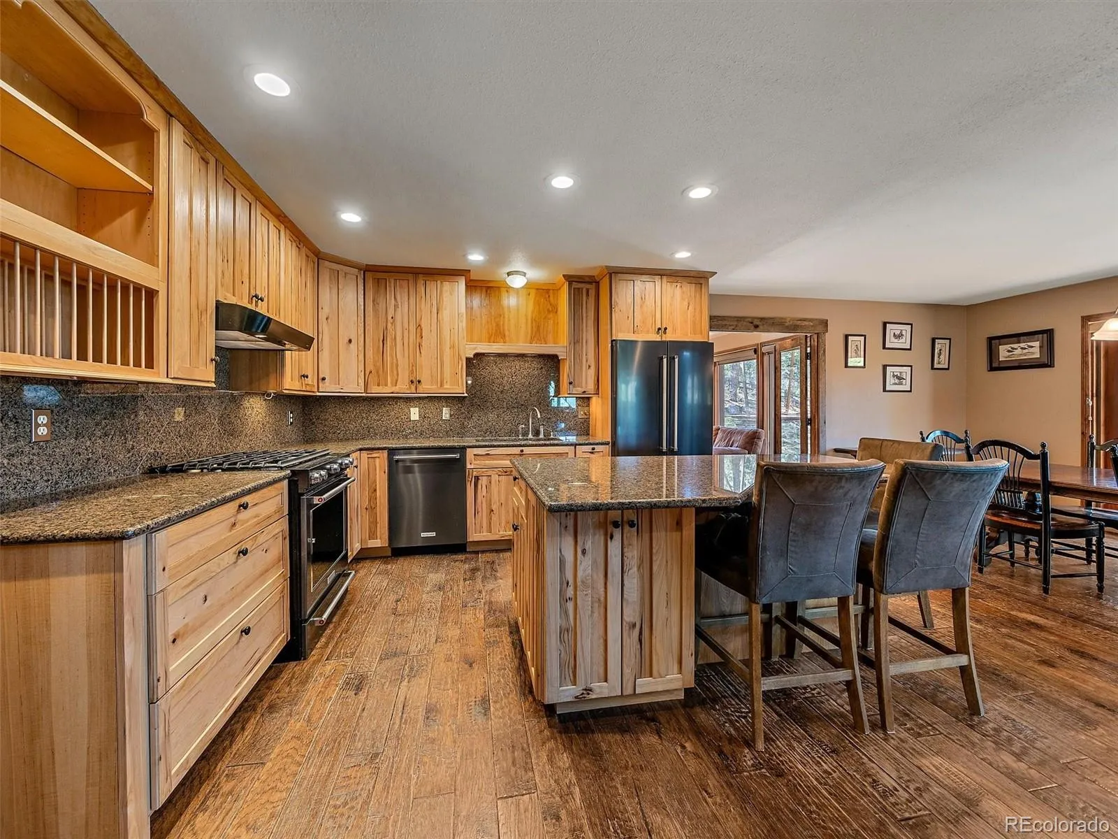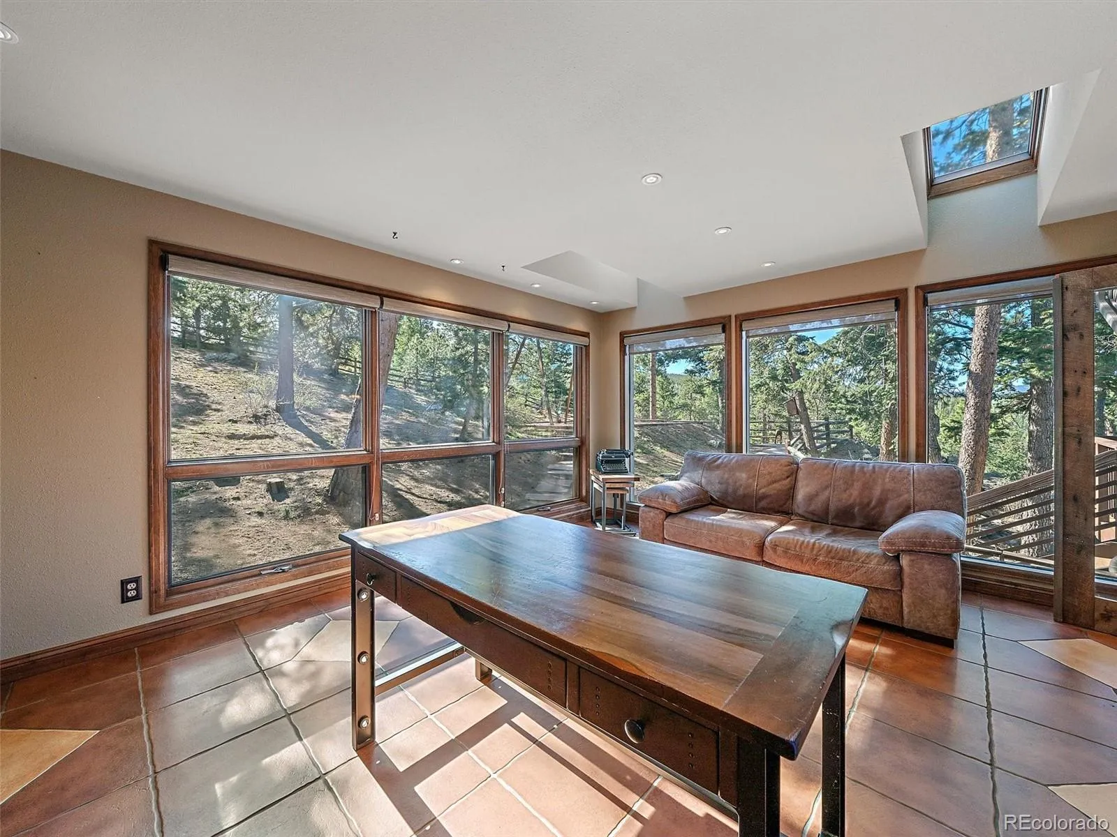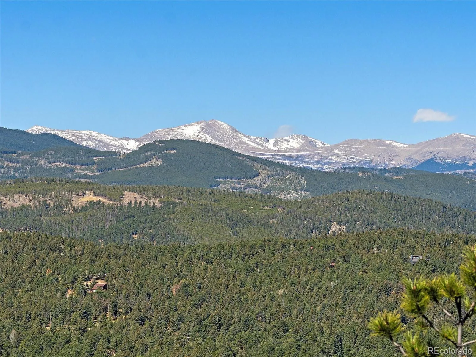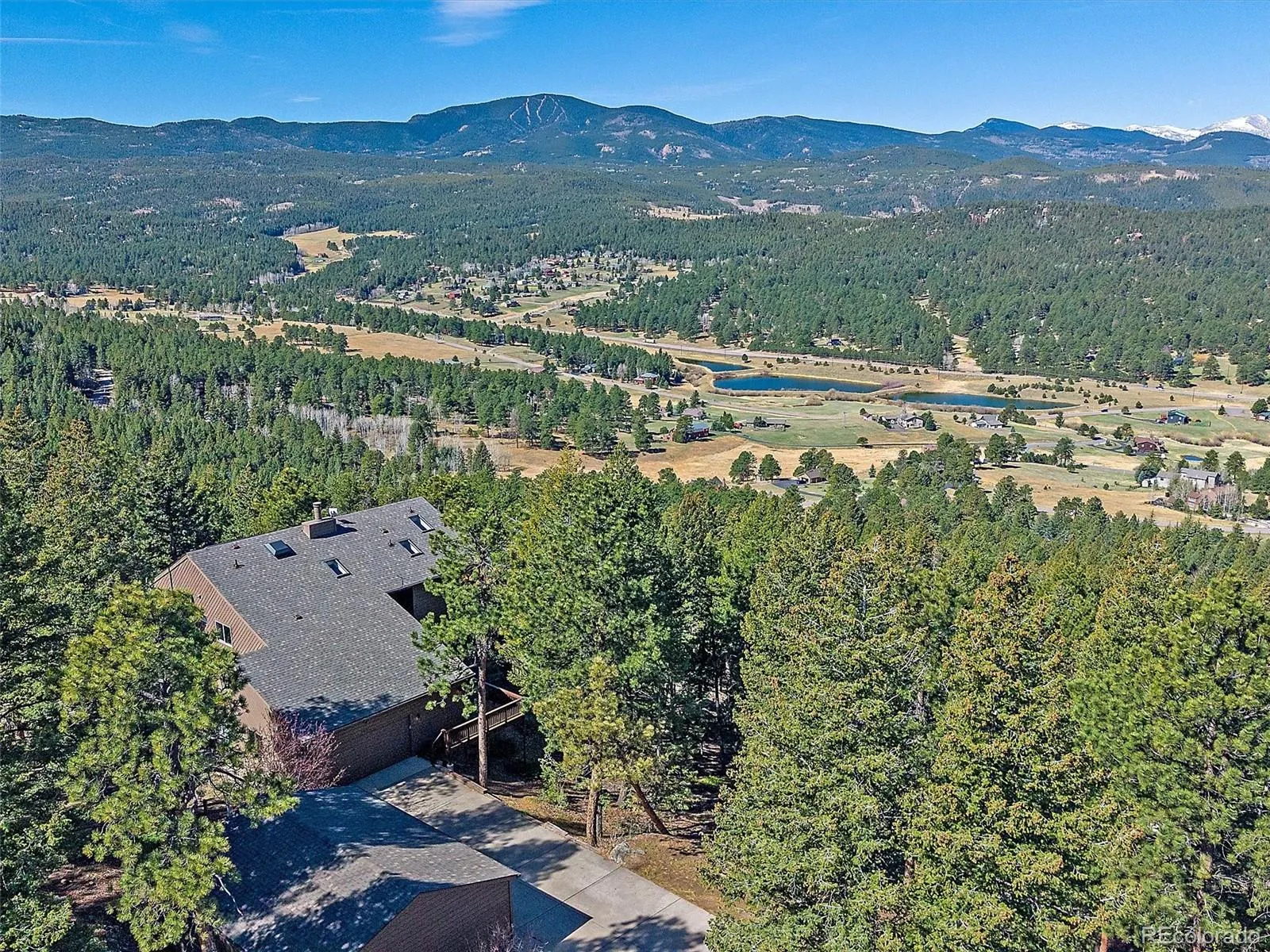 Welcome to a rare opportunity in the highly sought-after Evergreen Meadows community, where breathtaking, unobstructed views of Mt. Blue Sky set the stage for an exceptional mountain lifestyle. Perfectly positioned on 4.69 pristine acres, this remarkable property offers privacy, space, and unforgettable views from nearly every vantage point. Designed for both comfort and entertaining, the home features a spacious great room with expansive windows and a dramatic stone fireplace that flows seamlessly into the spacious open kitchen. Featuring hickory cabinets, granite countertops, island, pantry, and newer appliances, this kitchen is as functional as it is inviting. Off the open dining area you’ll find the perfect office wrapped in windows that overlooks the large fenced yard. For entertaining, the incredible game room features a custom wet bar complete with a refrigerator, dishwasher and ice maker, creating the ideal setting for gatherings. The main-floor laundry room adds to everyday convenience. The outdoor living is exceptional, with multiple wraparound decks designed to capture the stunning surroundings. The expansive primary suite is a true retreat, showcasing sweeping mountain views and a luxurious five-piece bath. With four bedrooms and four baths in total, there is ample space for family and guests alike. The lower level continues to impress with more sweeping views and walk-out access to a covered deck with hot tub deck – perfect for relaxing under the Colorado sky. Other features include the extra 2.5 car shop/garage that’s finished and heated offering incredible versatility for hobbies, storage, or workspace needs. Generac whole house back-up generator. NEW (Jan 26′) Class IV Roofs on house and shop! This is Colorado mountain living at its finest—where views, acreage, and thoughtful design come together in one extraordinary property.