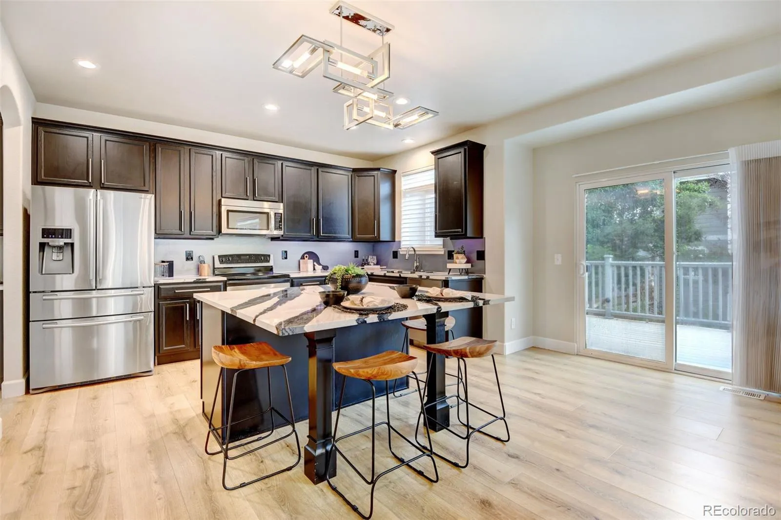 Welcome home to Redleaf! Situated across the street from one of the many parks of the community, this 5-bedroom home will not disappoint. The front of the home offers outdoor living to take in the beautiful view. Inside is a comfortable layout with a private den at the front of the home + formal dining room with Butler’s pantry to kitchen. Updated kitchen provides endless cabinet space, quartz counters, glass backsplash, under cabinet lighting, pantry + oversized island for informal dining. Family room offers custom built-ins below the electric fireplace + built-in TV mount with surround sound speakers. Outside is a great deck for outdoor dining + low-maintenance yard. Check out the fun + funky half bathroom for guests + easy access to the garage. Fully finished garage w/epoxy floors, Tesla charger, utility sink, Rachio sprinkler control, built-in storage cabinets plus motorized ceiling storage racks! Upstairs you’ll find 4 bedrooms at each corner of the home offering great privacy. The primary bedroom with double doors and a vaulted ceiling is bright + inviting. The primary ensuite 5-piece bathroom provides a great walk-in closet. Three additional bedrooms share a secondary full bathroom. An added bonus to this home is the upstairs laundry room with cabinets + laundry sink! Enjoy extra living space in the finished basement with additional 5th bedroom! Roughed-in bathroom in the basement just needs your finishing touches. Radon Mitigation System (2019), Furnace & A/C (2021), Water Heater (2019). Epic location just next door to Paul Derda recreation center + Broomfield Commons where the annual 4th of July fireworks festivities are held. Easily access Boulder, Denver, and DIA! Do not miss out on this great home!
