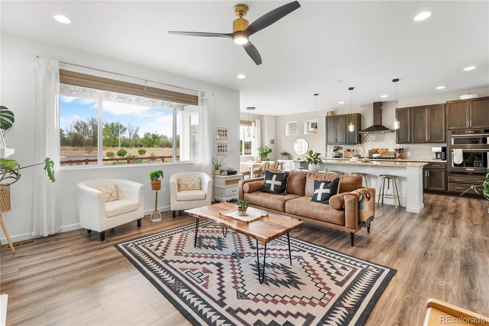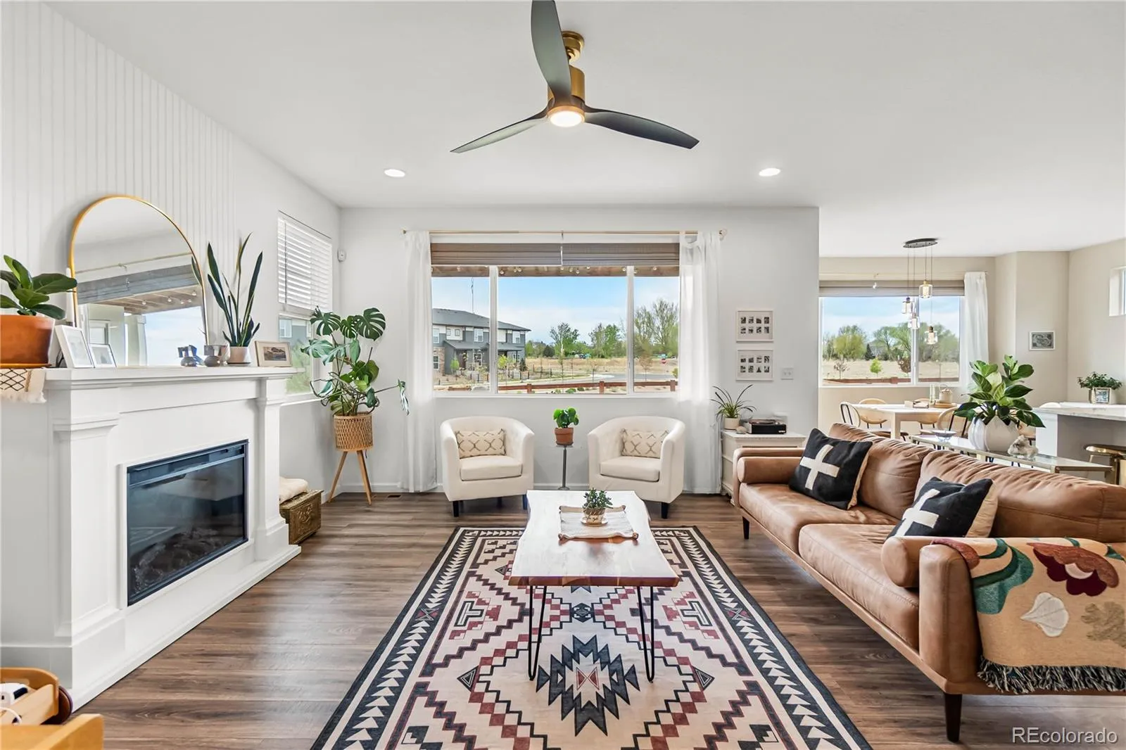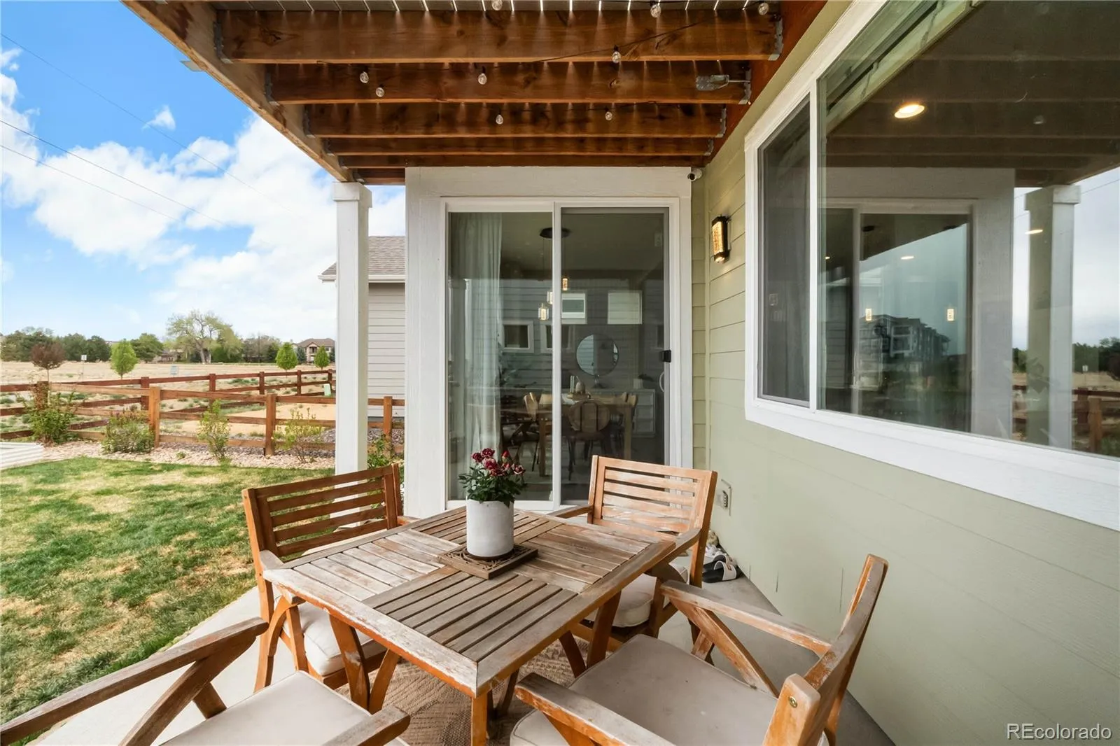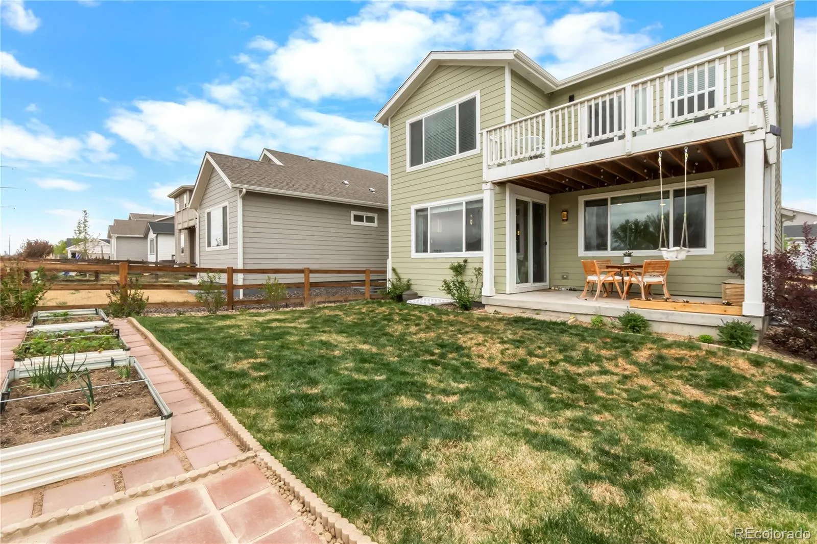 Built in 2022 in the Highlands of Longmont, this move-in ready 3-bedroom, 3-bath home offers 3,356 sq ft with an open-concept layout, many builder upgrades, and no direct rear neighbors. The main level centers around a spacious and private great room with fireplace, large windows, and natural light, flowing into a kitchen with quartz island seating, double ovens, stainless appliances, walk-in pantry, and updated lighting, hardware, and all-new faucets throughout. The dining room opens to a covered patio and fenced backyard with newly seeded lawn, garden beds, and added walkway.