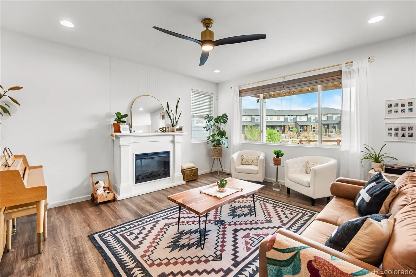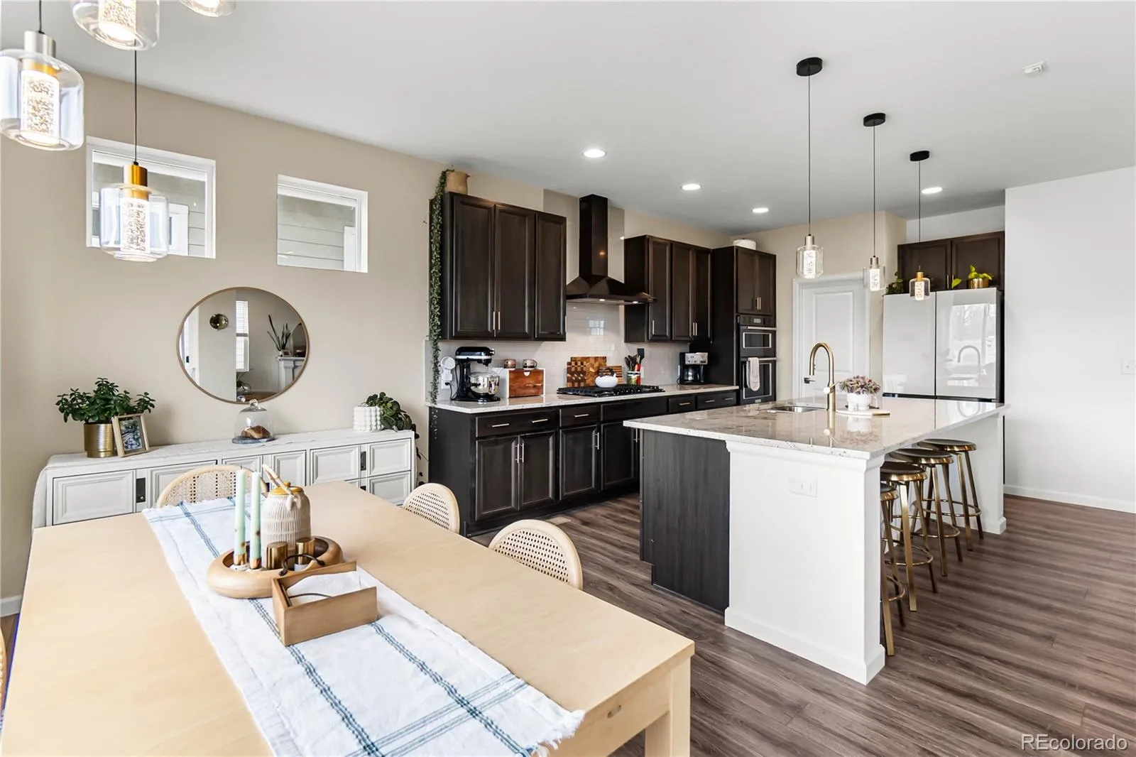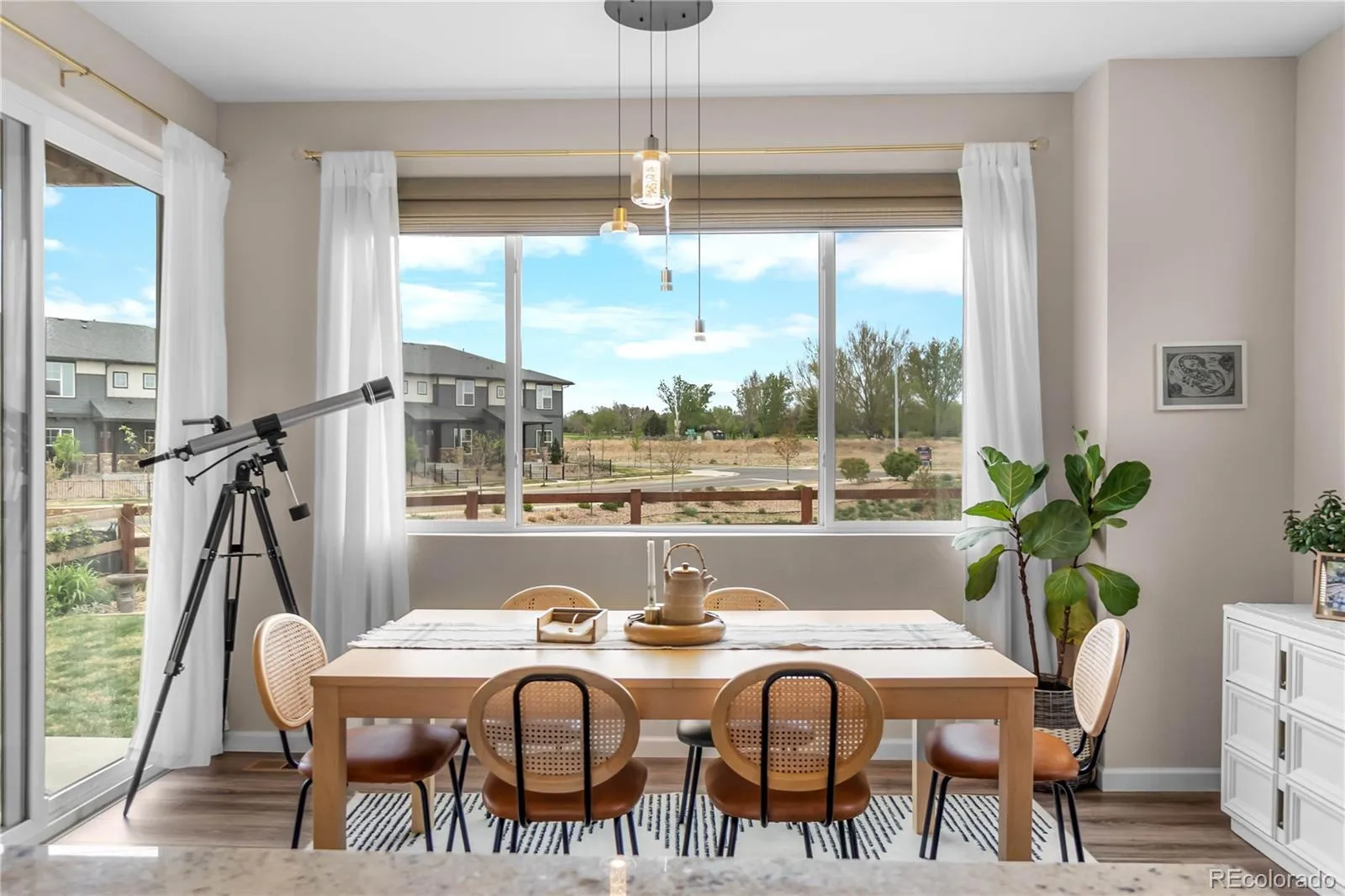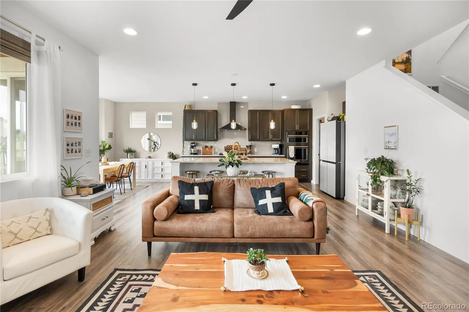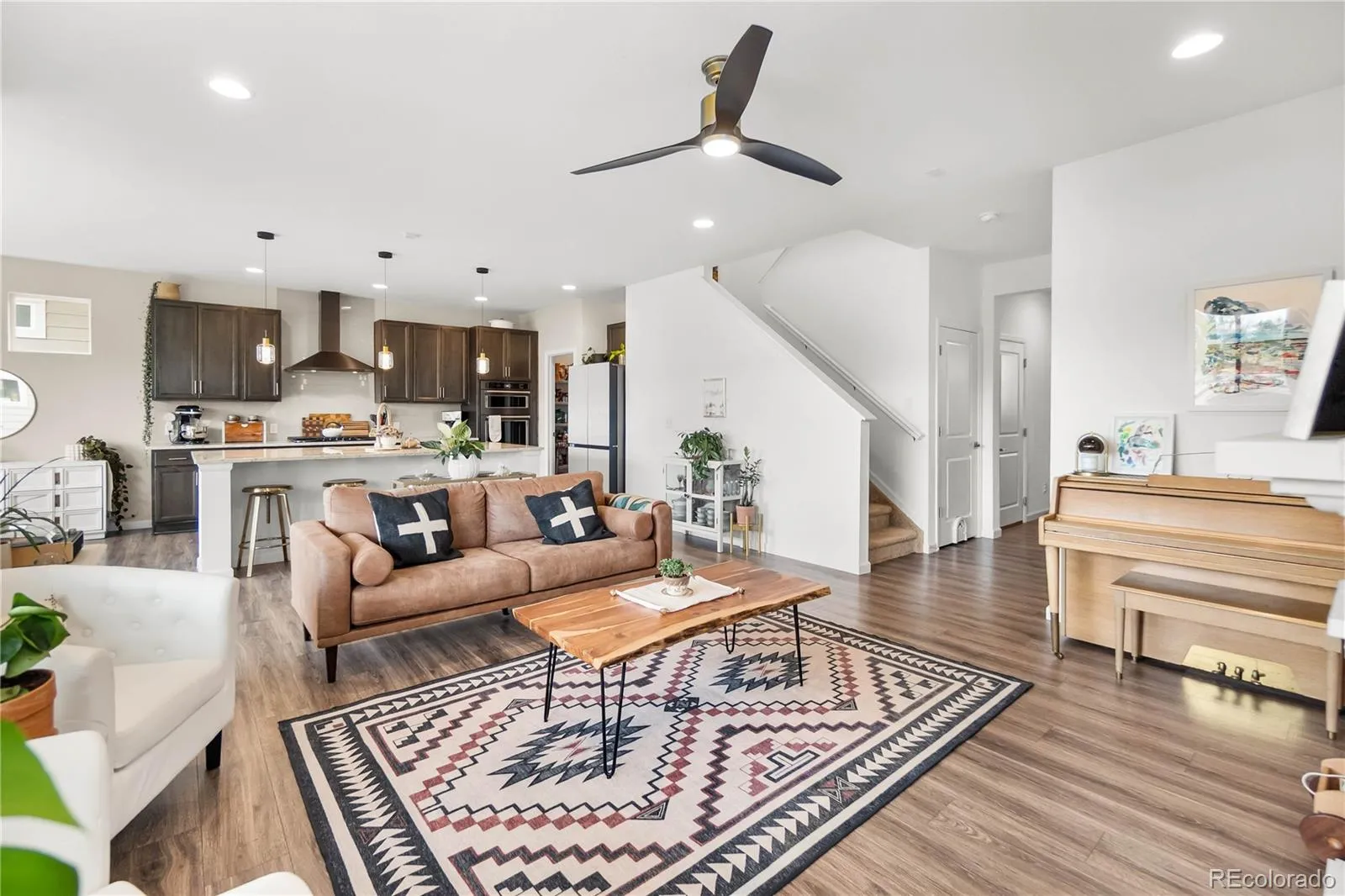 Built in 2022 in the Highlands of Longmont, this move-in ready 3-bedroom, 3-bath home offers 3,356 sq ft with an open-concept layout, many builder upgrades, and no direct rear neighbors. The main level centers around a spacious and private great room with fireplace, large windows, and natural light, flowing into a kitchen with quartz island seating, double ovens, stainless appliances, walk-in pantry, and updated lighting, hardware, and all-new faucets throughout. The dining room opens to a covered patio and fenced backyard with newly seeded lawn, garden beds, and added walkway.