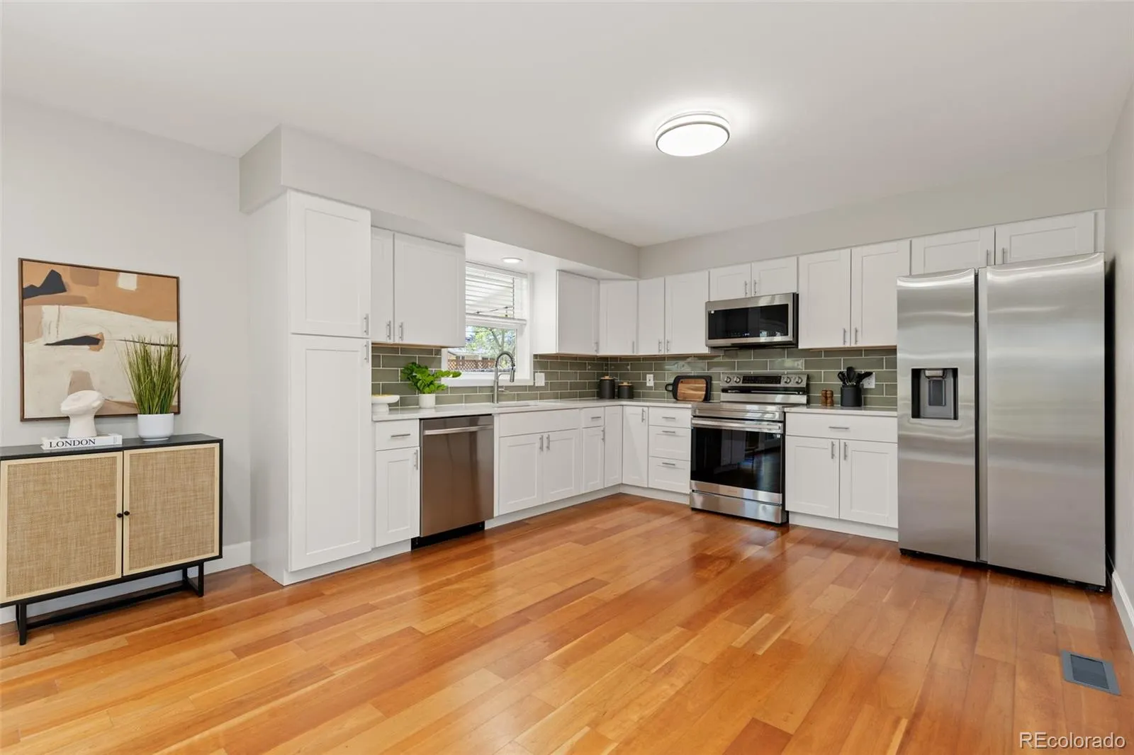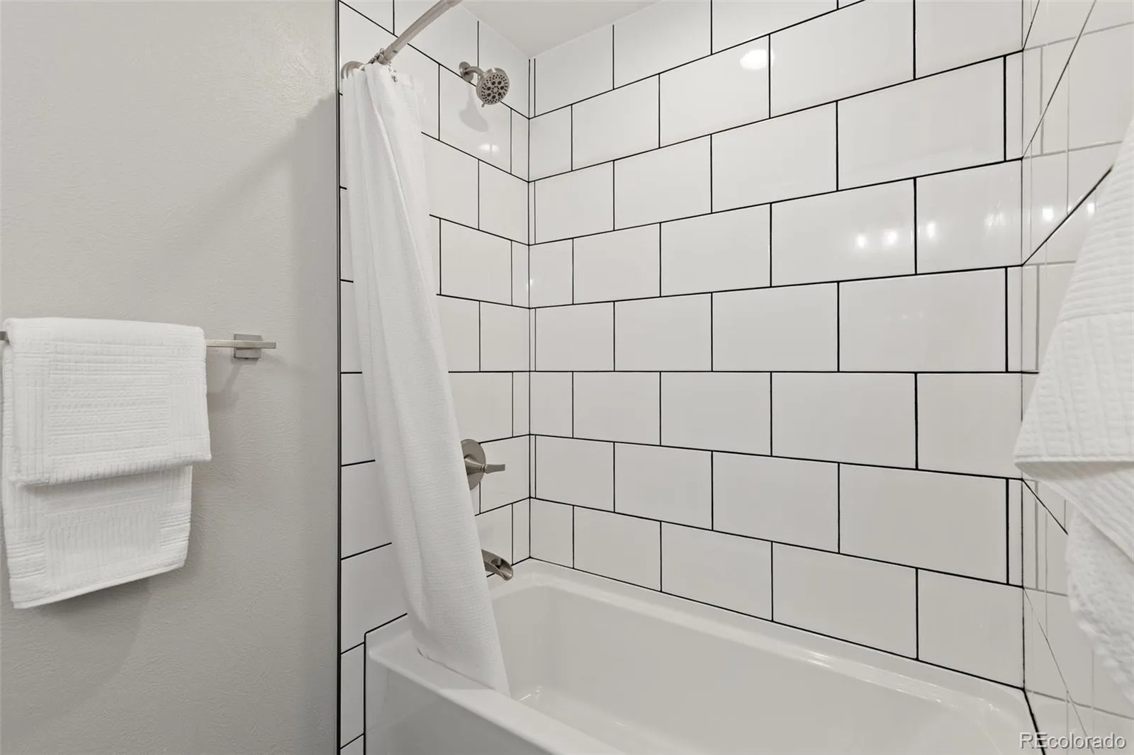 The remodeled kitchen features shaker style cabinetry, quartz countertops, subway tile backsplash, and brand new appliances. The fully updated hallway bathroom includes slate flooring, a double sink vanity, updated lighting, soaker tub, and tile that extends to the ceiling for a polished finish.