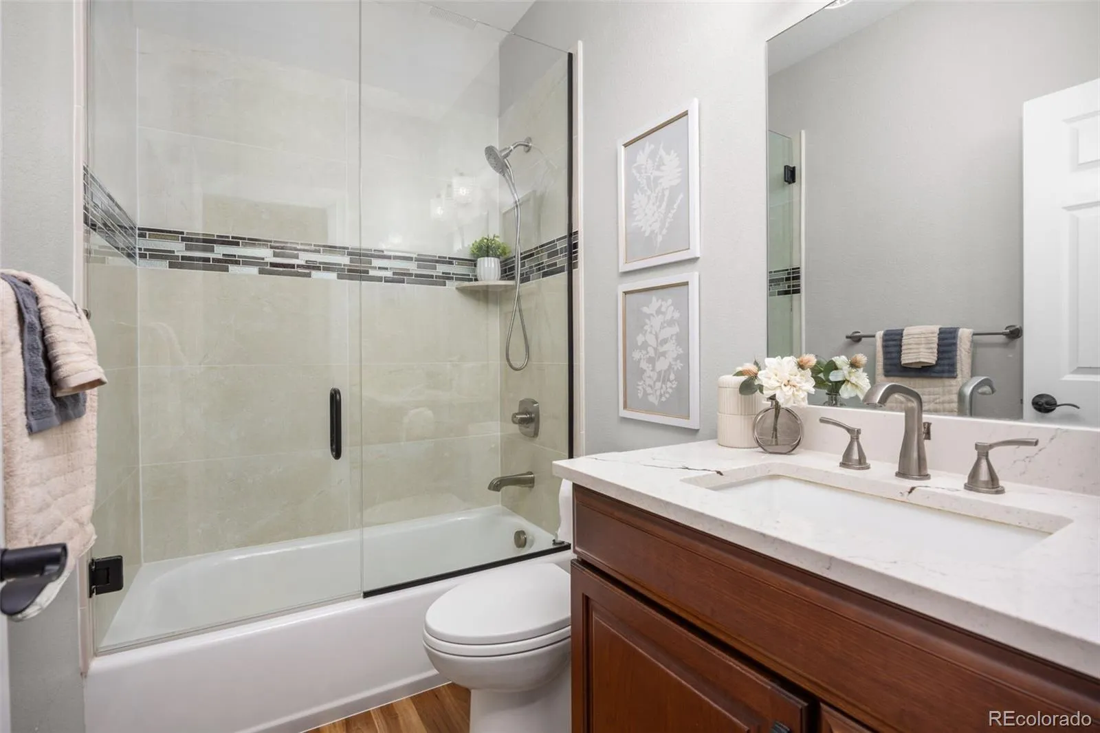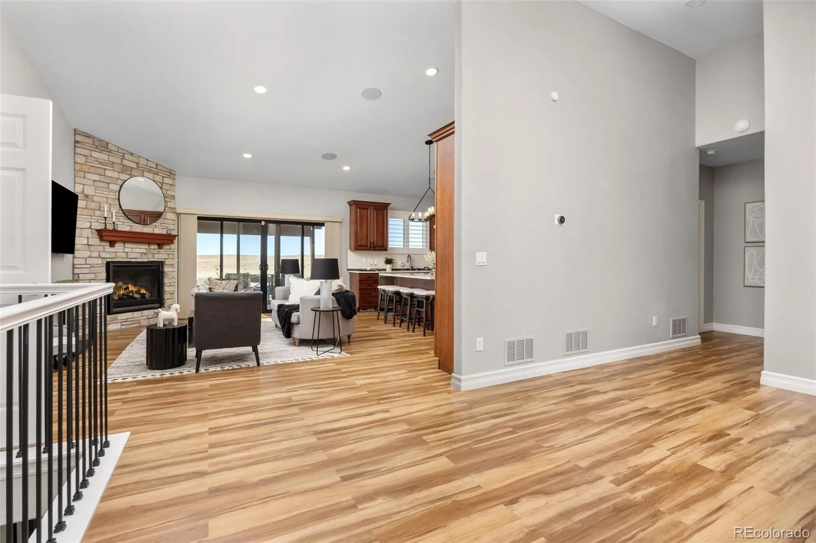 The residence has 4 bedrooms, a non conforming 5th bedroom and three bathrooms. A soundproofed office on the main level offers an optimal environment for professional or personal use. The open-concept kitchen is appointed with high-end finishes, including stainless steel Bosch appliances, a five-burner chef’s gas range, a 36-inch stainless steel range hood, and quartz countertops. Custom 42-inch cherry cabinetry with crown molding, and soft-close drawers and doors enhances both aesthetic appeal and functionality. The kitchen flows seamlessly into the living area, where vaulted ceilings and a gas fireplace establish an elegant and inviting atmosphere.