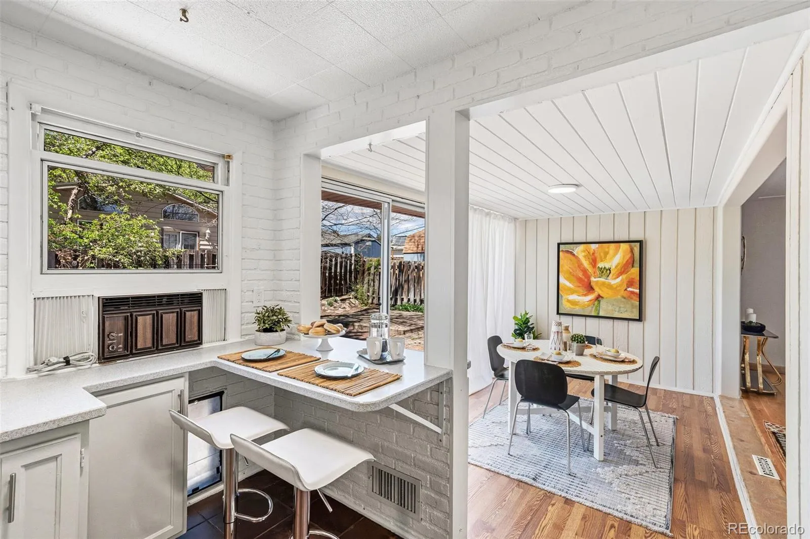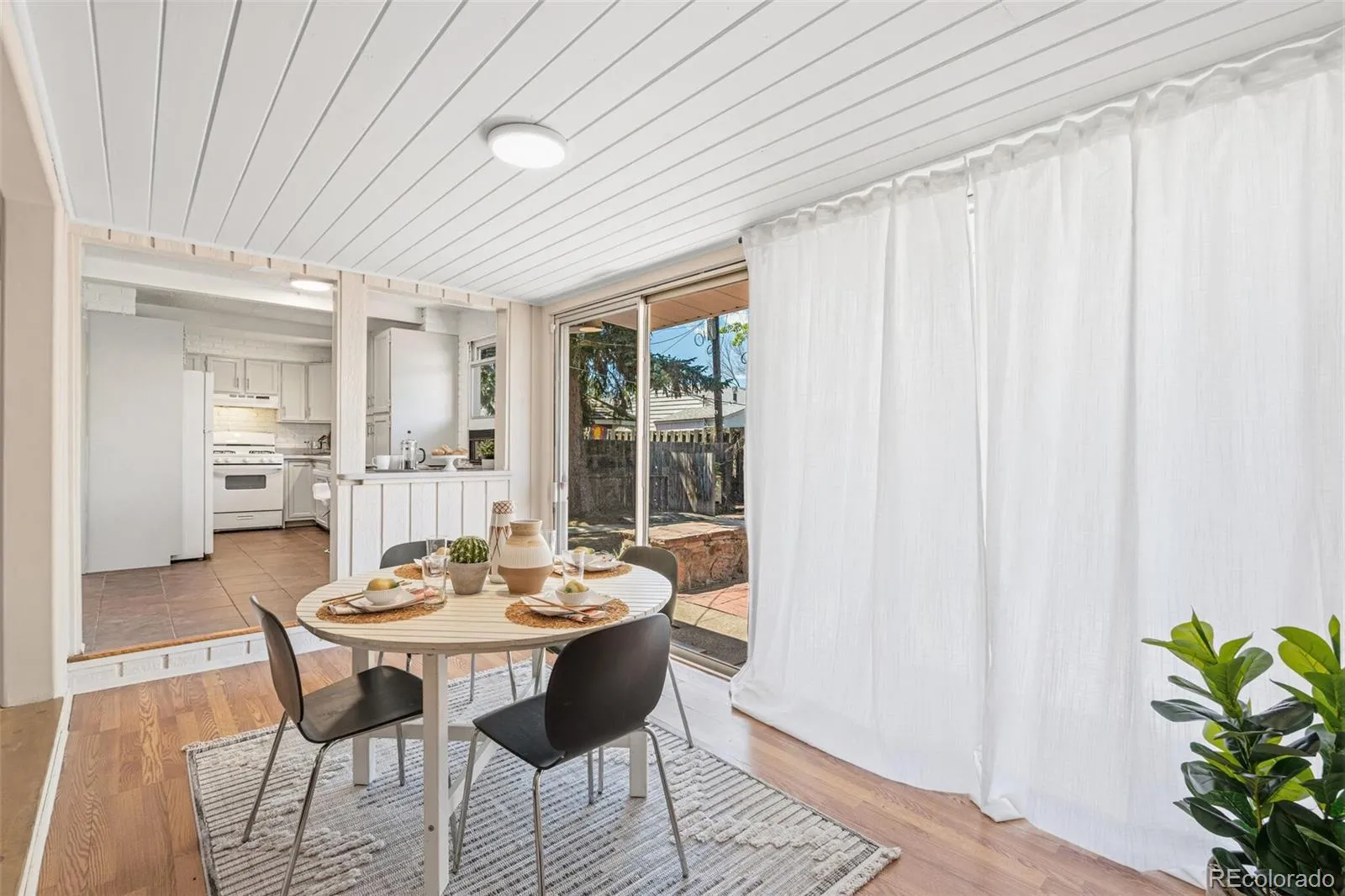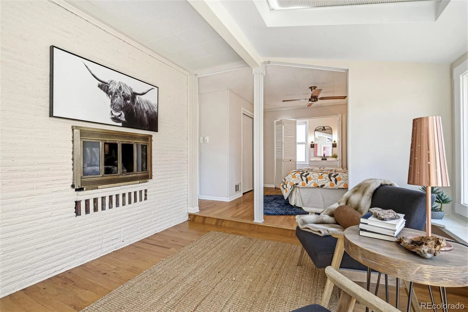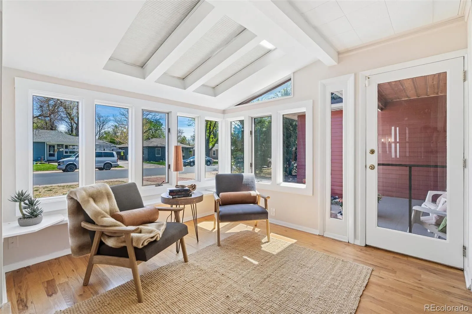 This spacious mid-century, original owner home in Edgewater is light, bright and move-in ready! Unique details can be found throughout and everything is on one convenient level. 3 bedrooms, 1 1/2 baths, large living room with a 2 sided fireplace opens to a charming sunroom, which could be a great studio or office with separate entrance. This home also features wood floors, a breakfast bar in the kitchen, dedicated laundry room and attached garage with opener. Oversized patio doors in the dining room open to the back yard and bring in wonderful afternoon light. Brand new electric panel being installed, new outlets and switches throughout, 5 year old furnace, central A/C, and hot water heater, and pre-inspected roof for peace of mind. Great location near Sloan Lake, Edgewater Town Center, schools and 26th bus line. A community food garden is just down the street. Perennials abound, but the yard needs a little love. Lawn photos have been enhanced to show potential.