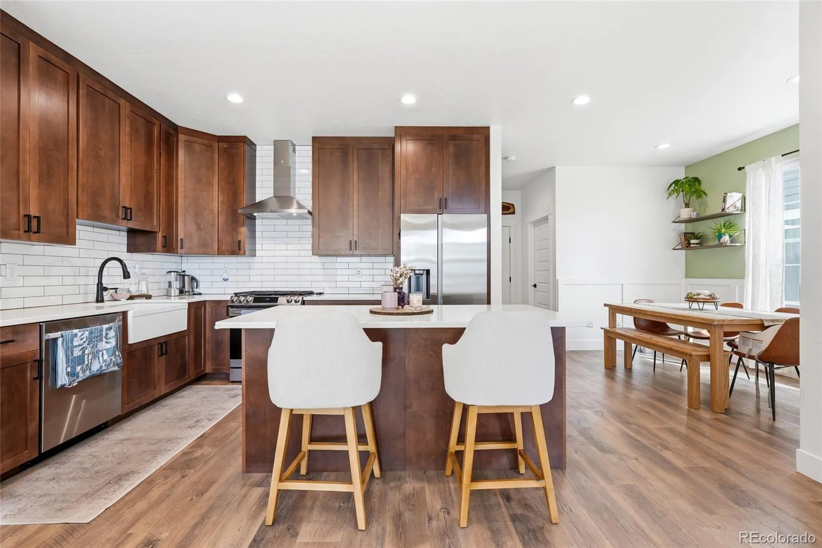 The open-concept main level features quartz countertops, stainless steel appliances, 42″ cabinetry, pantry, LED recessed lighting, and stylish finishes throughout. The kitchen flows seamlessly into the dining and living areas, ideal for everyday living and entertaining. A convenient main floor laundry room adds to the home’s functional layout.