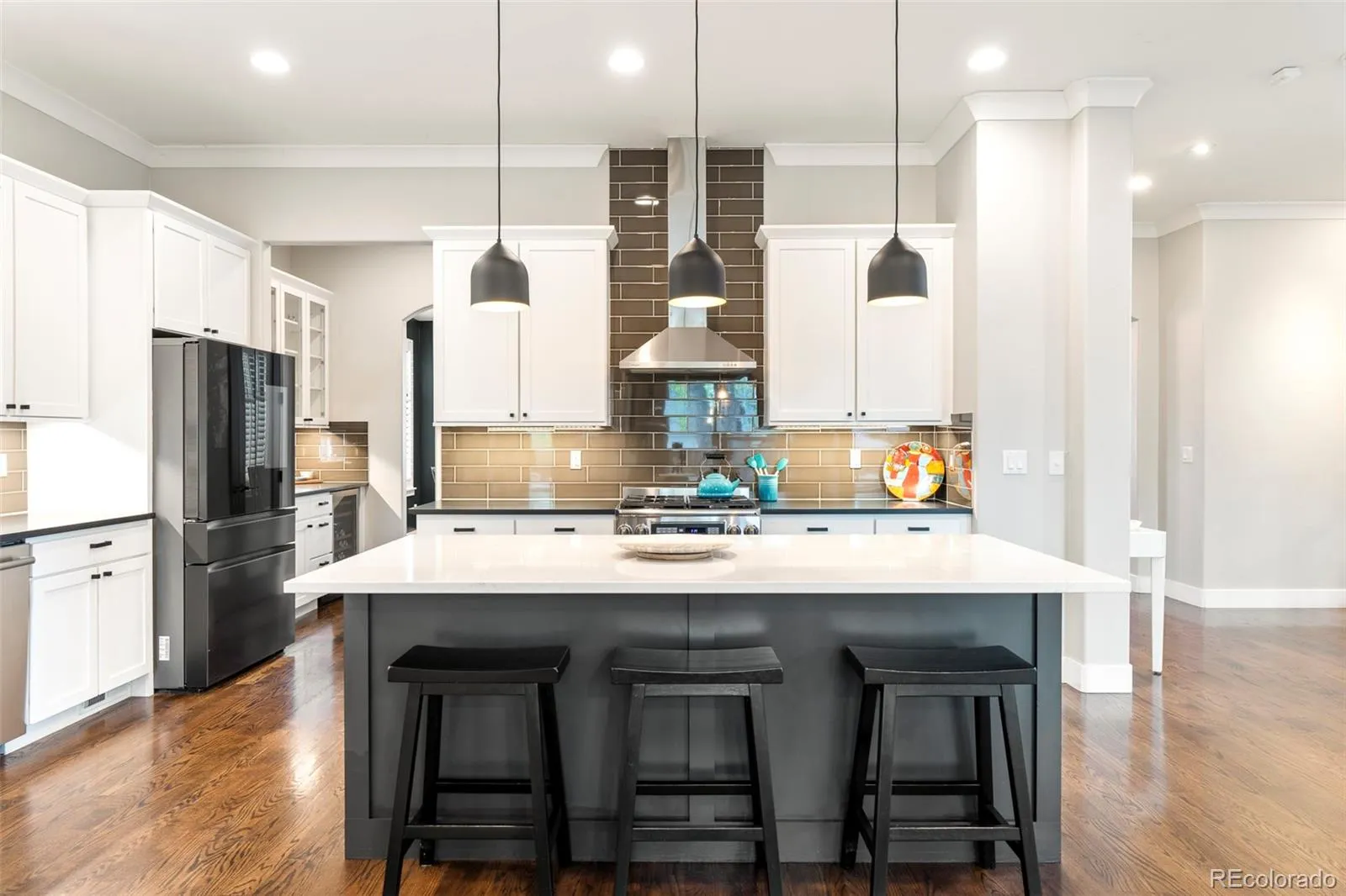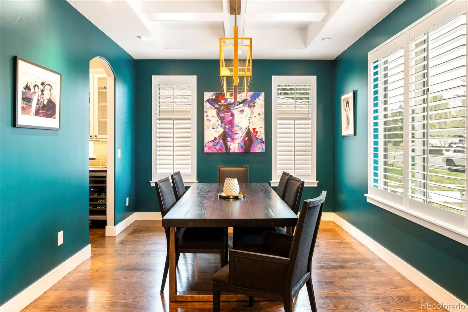 Effortlessly elegant and designed for modern living, this residence one block from Crestmoor Park blends refined detail with inviting comfort across a beautifully flowing floorplan. From the custom-gated front porch with its classic swing to the meticulous landscaping, the home makes a masterful first impression. Enter to a spacious foyer, private office and a chic formal dining room with a coffered ceiling. The open-concept kitchen impresses with a large center island, breakfast nook and butlers pantry flowing seamlessly into the expansive living area. A floor to ceiling fireplace and impressive natural light anchor the warm and comfortable space. Upstairs, the serene primary suite offers a stylish walk-in closet with built-ins, a secondary walk-in closet and a five-piece bath complete with a soaking tub. The finished basement elevates entertaining with a spacious rec room, full wet bar and expansive wine room. Outside, the newly landscaped, low-maintenance backyard features LED up-lighting, a large mature shade tree, private patio and hot tub. Perfectly positioned near Crestmoor Park, Boulevard One and Lowry, this move-in-ready masterpiece delivers a lifestyle of unrivaled convenience.