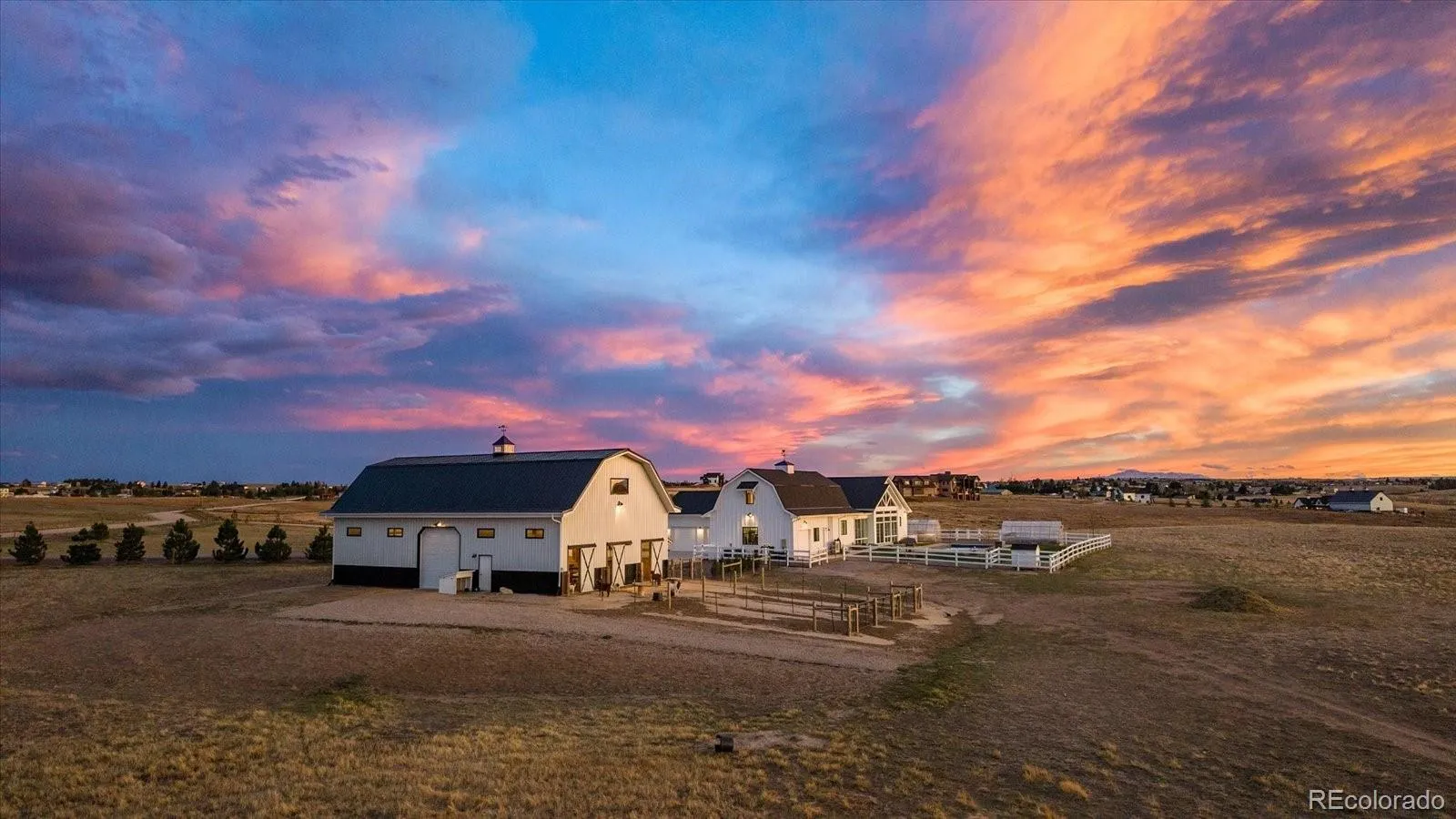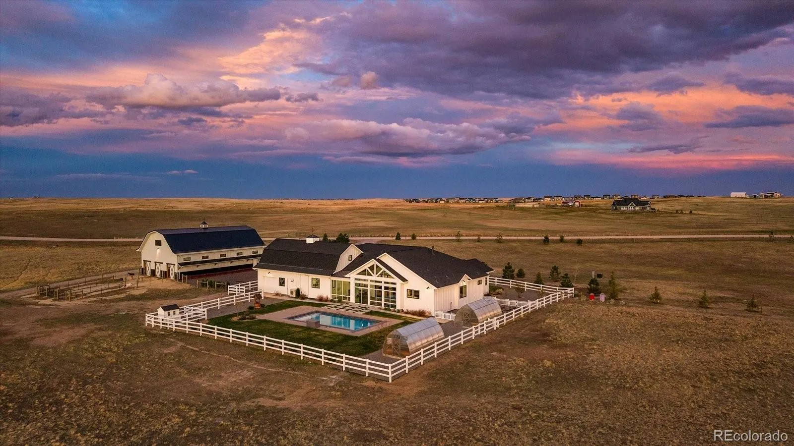 A rare 35-acre retreat in Parker with a custom ranch home, pool, barn, and greenhouses—where luxury meets wide-open Colorado living. Fully equipped for a hobby farm or private escape, minutes from town, 43465 Ptarmigan Ranch St welcomes you to a beautifully designed custom modern farmhouse offering over 3,650 finished square feet, thoughtfully crafted for true main-floor living and effortless indoor-outdoor connection. Set against a backdrop of sweeping Front Range views and endless Colorado skies, this property blends refined living with agricultural flexibility and peaceful seclusion. Inside, the open-concept layout is filled with natural light and designed for both everyday comfort and elevated entertaining. The main-level primary suite offers a serene retreat, complemented by dual walk in closets, oversized laundry, and pantry that enhance daily functionality.