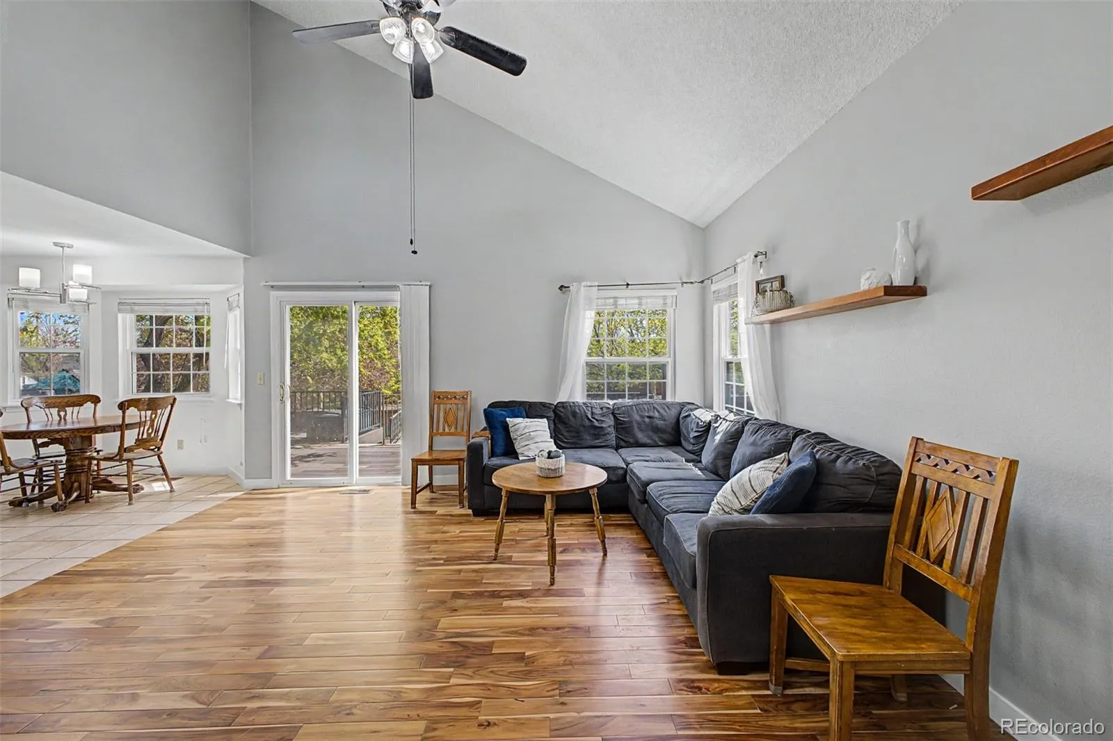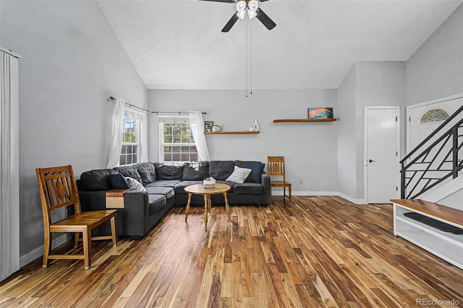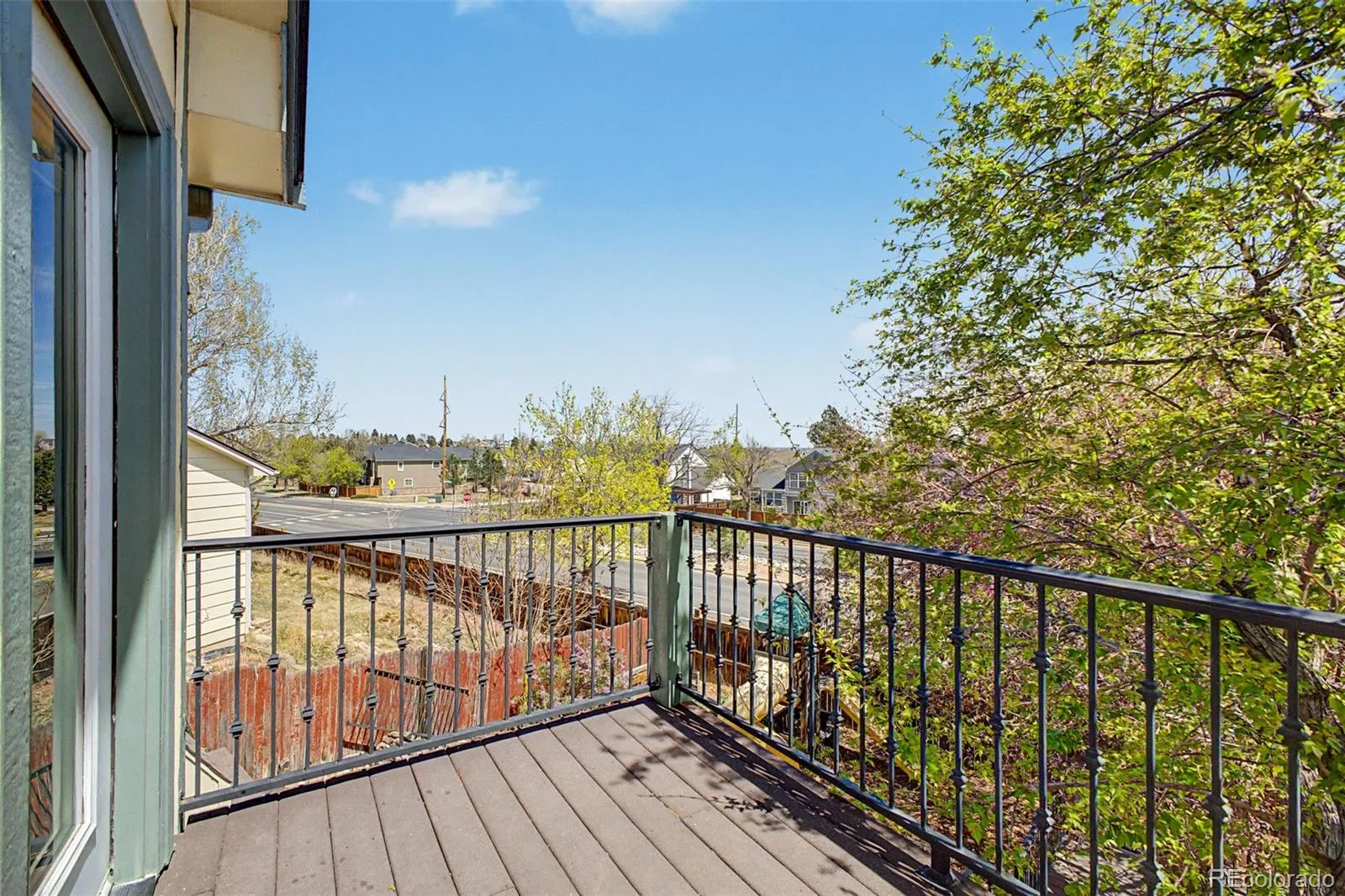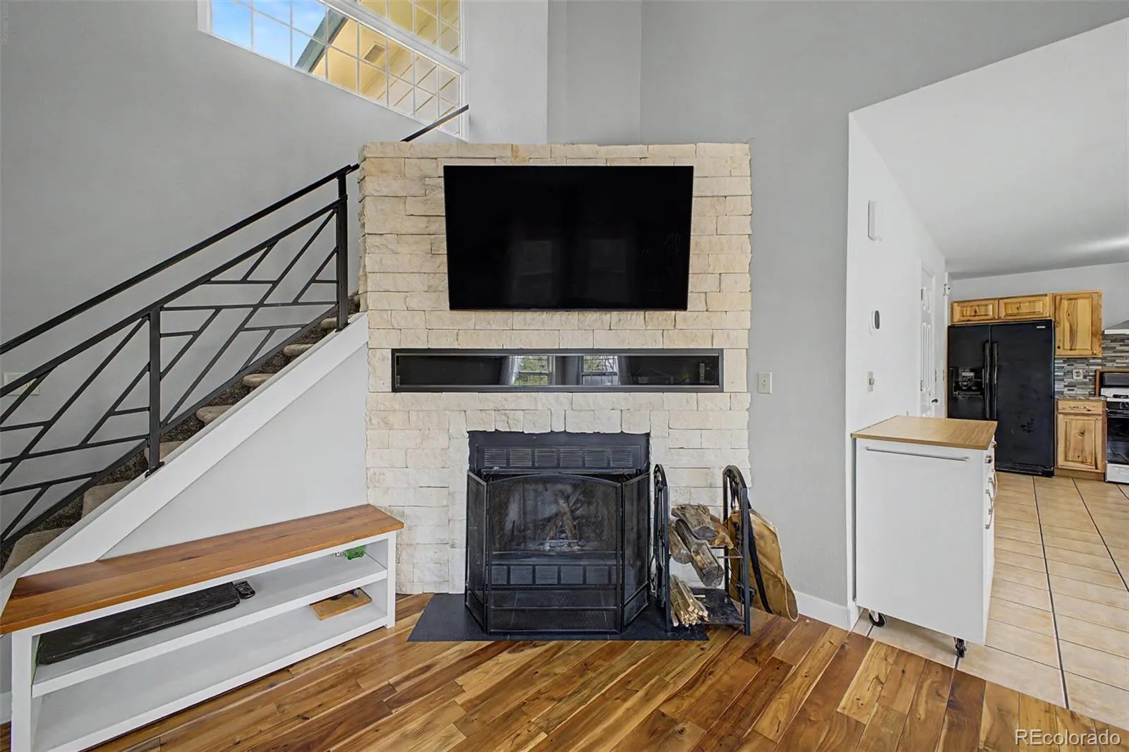 The living room includes vaulted ceilings, acacia hardwood floors, and a custom tile fireplace with iron railing. Upstairs, the primary bedroom offers a full bath and private balcony, while two additional bedrooms include walk-in closets.