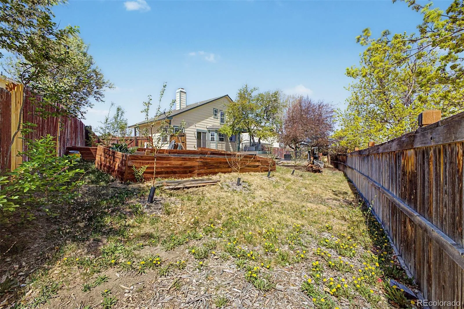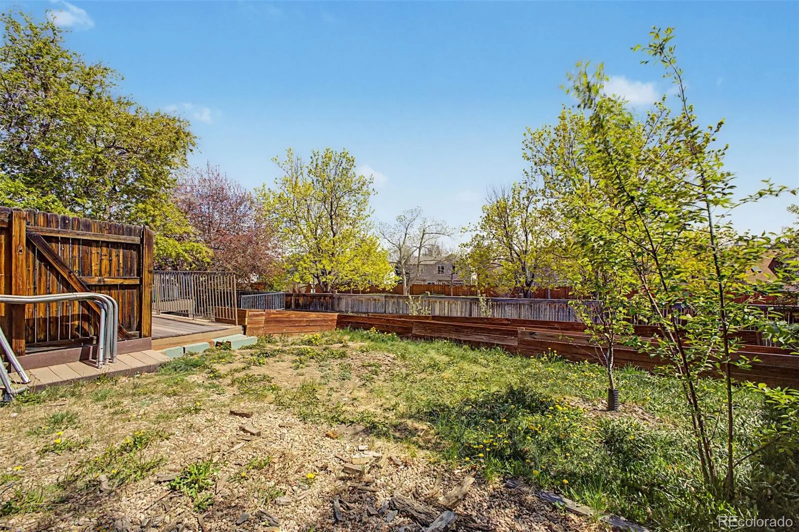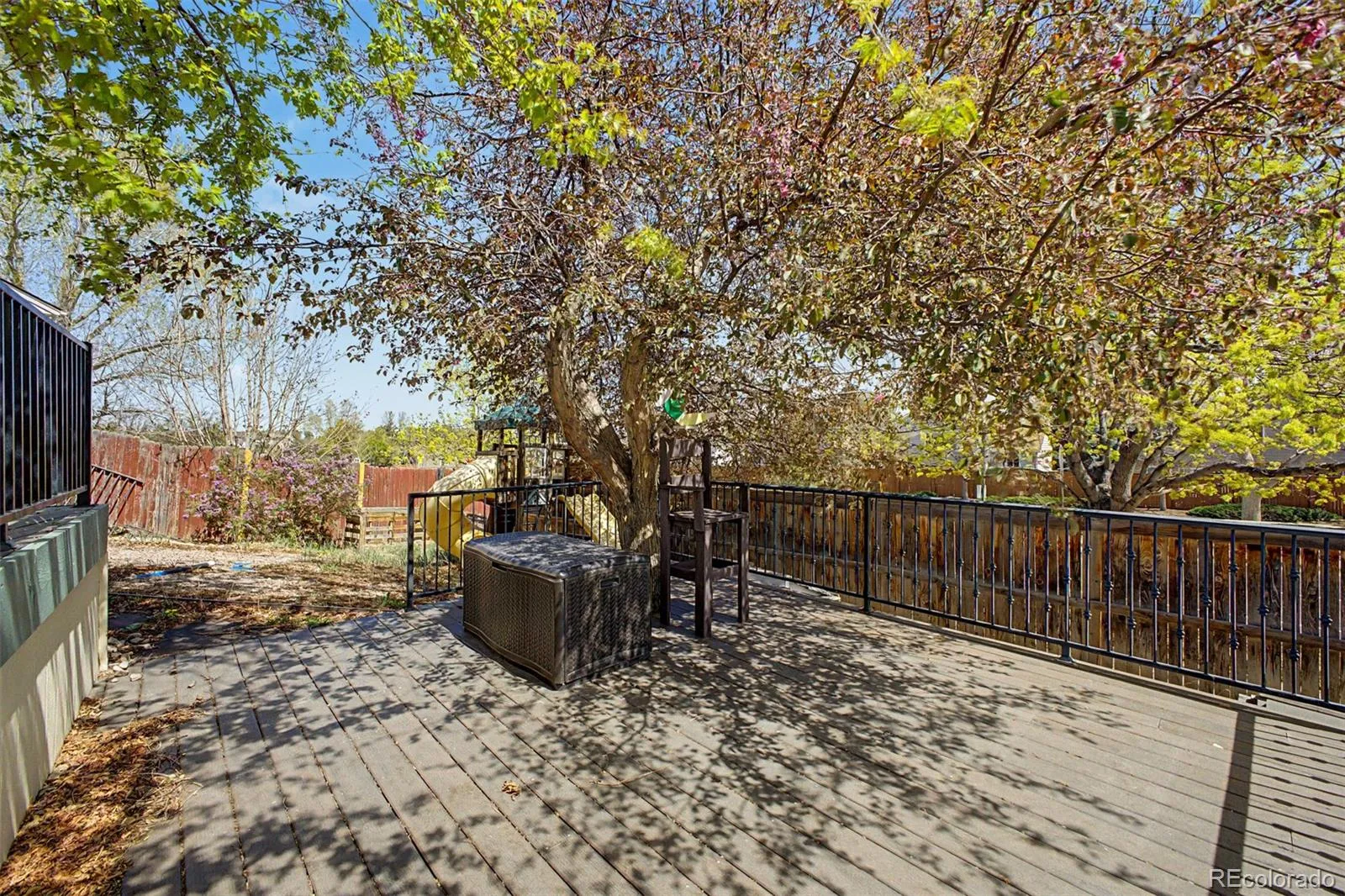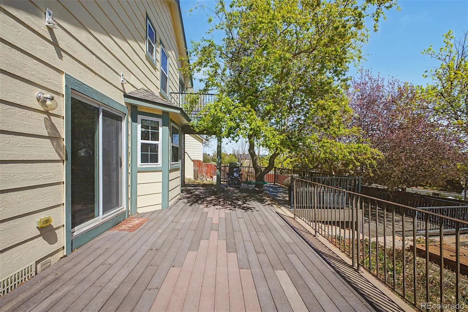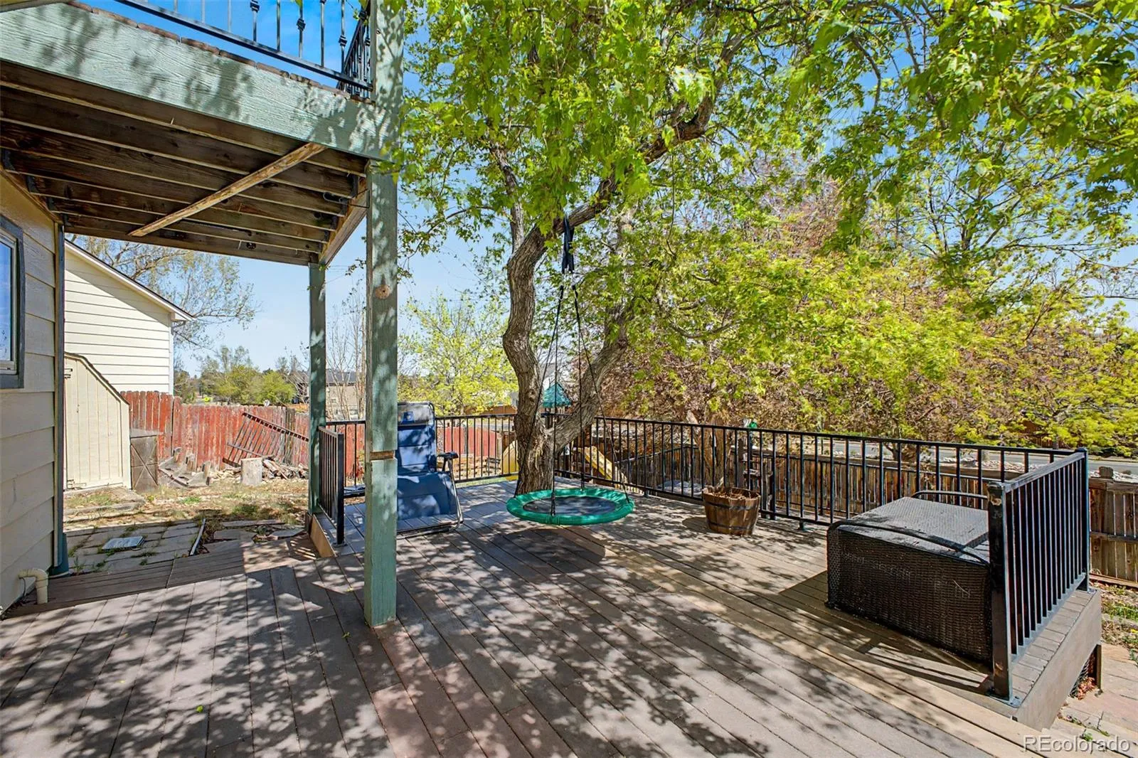 The backyard features a two-tier deck with iron railing, mature trees, outdoor bar area, and shed, and offers an opportunity for improvement and personalization.