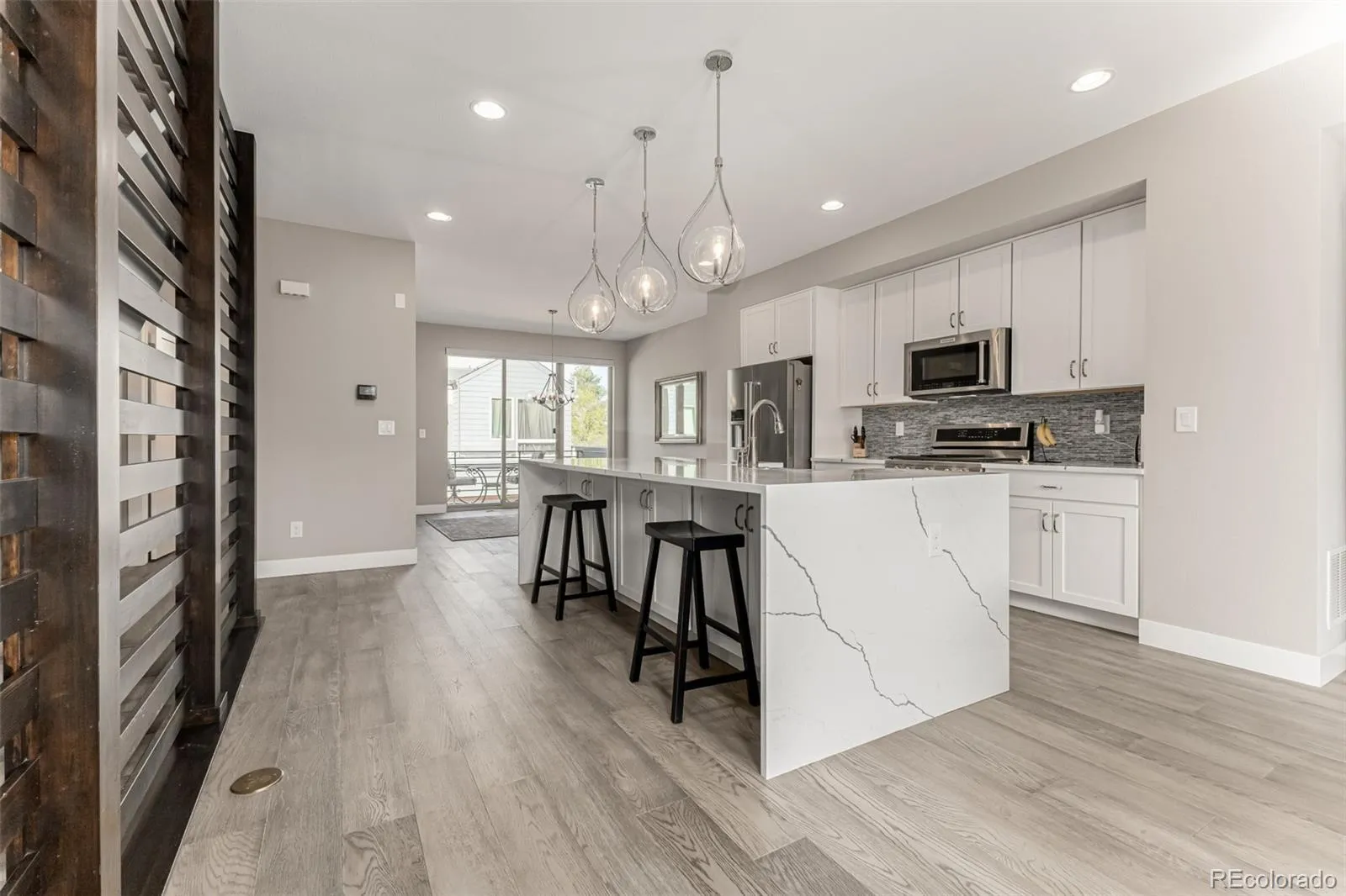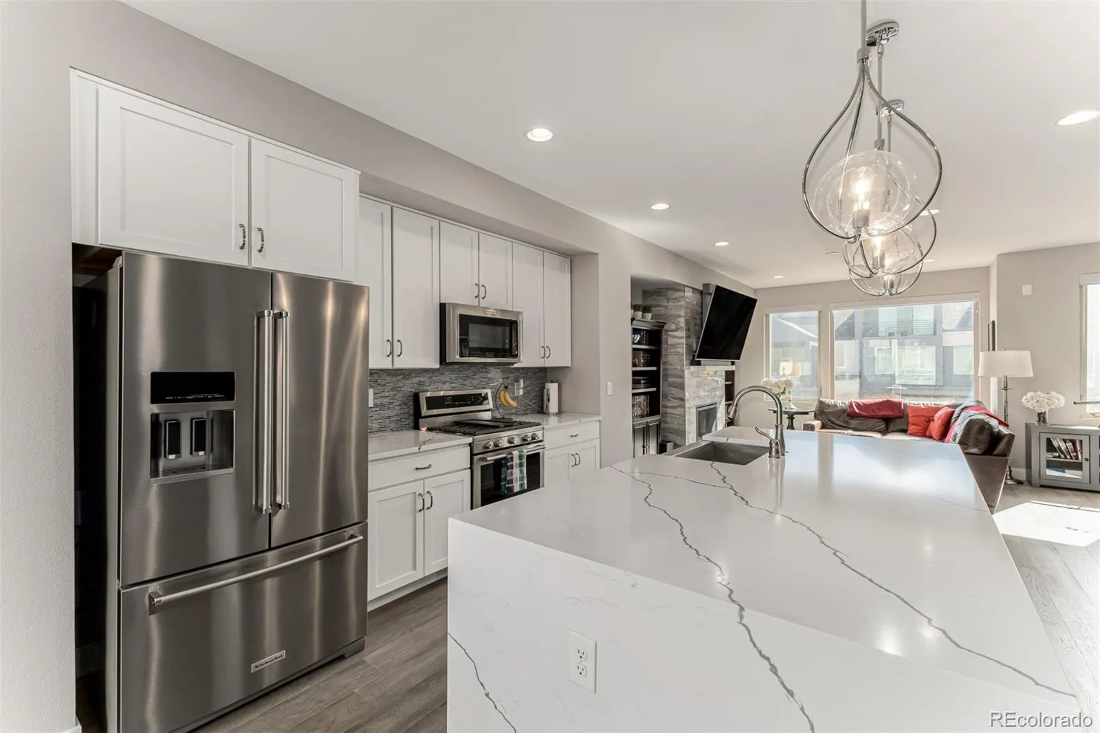 The main living level is filled with natural light and features an open-concept design connecting the living, dining, and kitchen areas. The chef’s kitchen is a standout with quartz waterfall countertops, a large island, stainless steel upgraded appliances, gas range, white cabinetry, subway tile backsplash and oversized pendant lighting. The adjacent dining area and inviting living room with modern gas fireplace create an ideal setting for relaxing or hosting guests. A convenient powder bath and grilling deck complete this level.