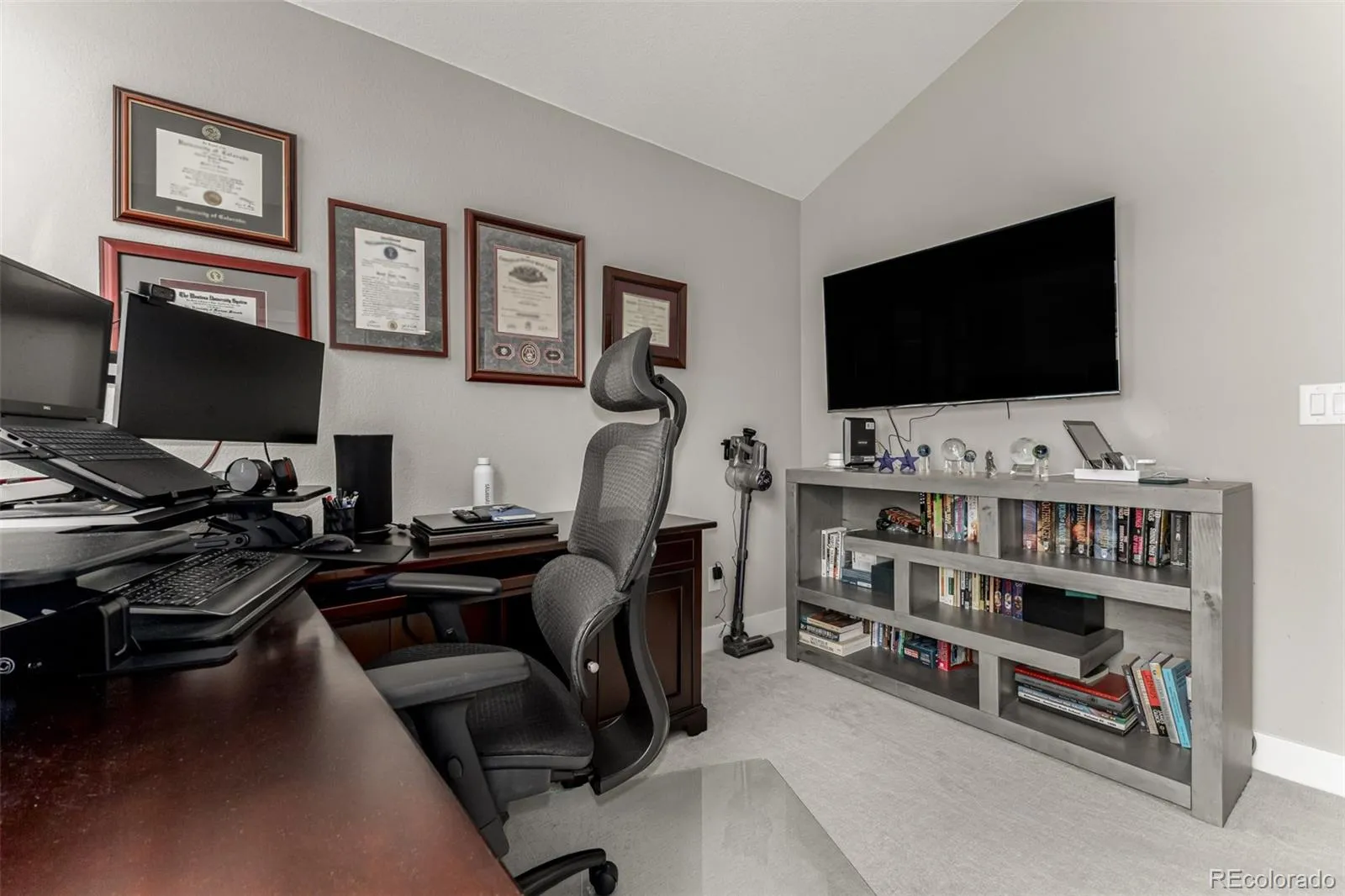 The first floor offers excellent flexibility with a spacious en-suite bedroom with 3/4 bath, perfect for a home office, workout space, guest suite, or additional living area. Upstairs, the top level includes two well-appointed en-suite bedrooms with vaulted ceilings, including a beautiful primary suite with private balcony access. Laundry is conveniently located on the same floor.