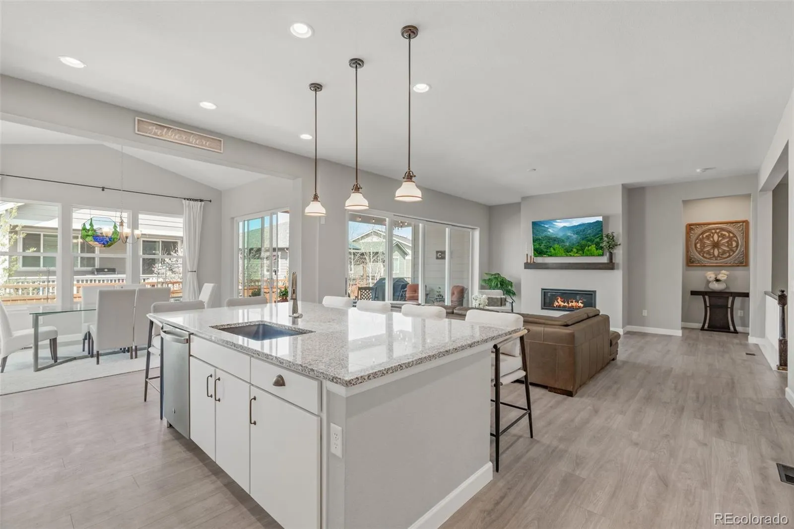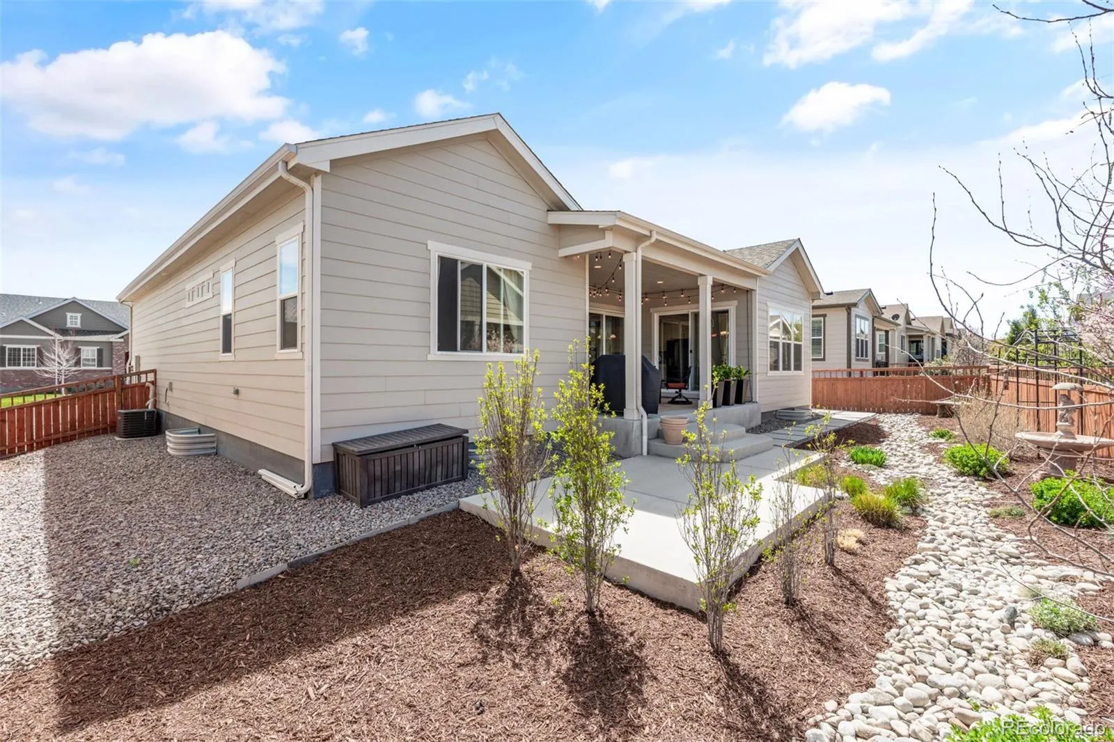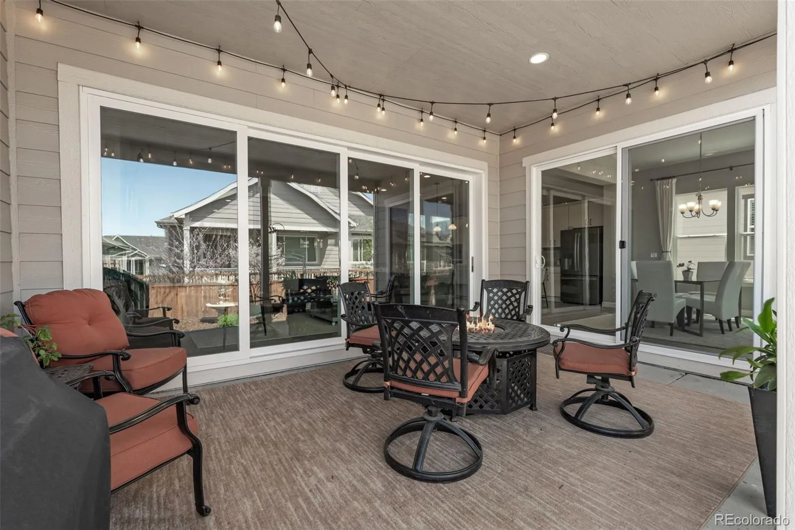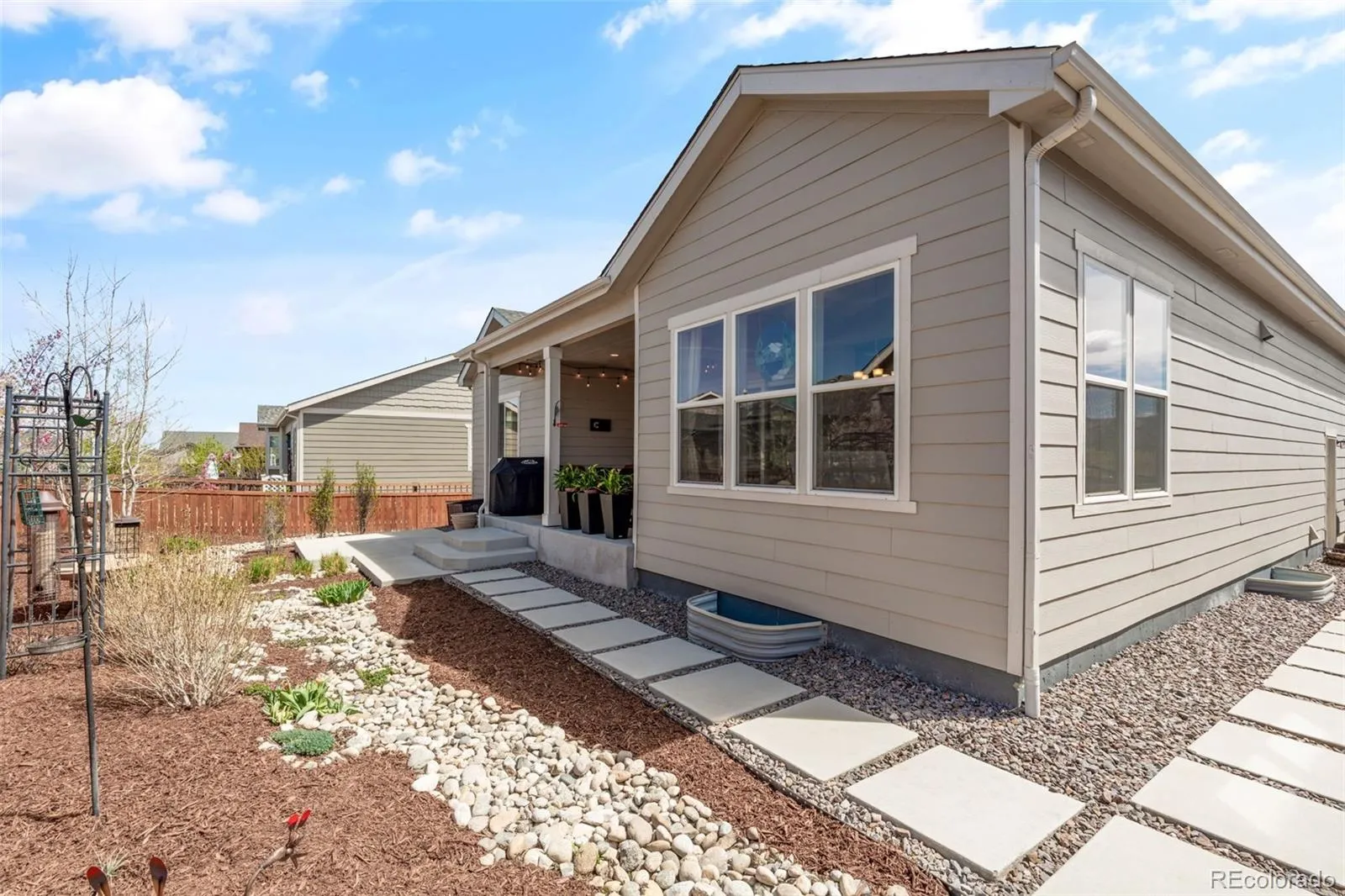 This exceptional home is a true must-see, offering a seamless blend of comfort, style, and thoughtful design. A stunning infinity glass wall fully opens to the patio, creating effortless indoor-outdoor living that’s perfect for entertaining. Gather around the warmth of the indoor fireplace or step outside to enjoy two inviting patios, including a private lower patio. The low-maintenance backyard is beautifully landscaped with ornamental grasses and a variety of flowering, water-wise plants, including rose of sharon and iris.The heart of the home is the well-appointed kitchen,featuring tall cabinetry with designer hardware,pendant lighting over a large island,a spacious walk-in pantry,and a convenient built-in desk area just off the kitchen.The adjoining sunroom dining space is filled with natural light, creating the perfect setting for everyday meals.The main floor is thoughtfully designed,offering a private office with built-in shelving and a separate bedroom and full bath—ideal for guests or multigenerational living.The primary suite provides a relaxing retreat with a spa-like shower, dual sinks, and a generous walk-in closet.The finished basement expands your living space with endless possibilities, including a media area for movie nights, room for a home gym, and space for entertaining.A stylish bar with a sink enhances the experience, while a private bedroom with a large walk-in closet and full bath makes it perfect for guests or extended stays.Enjoy direct access to scenic paths leading to the Cherry Creek Trail, with convenient routes to Denver and Castlewood Canyon State Park. Residents of Cobblestone Ranch also enjoy exclusive amenities, including a private clubhouse, pool, tennis courts, and pickleball facilities.Located in an area with top-rated schools, this home truly has it all. Recent updates include new luxury vinyl plank flooring on the main level, installed in 2025, adding a fresh, modern touch to this remarkable property.