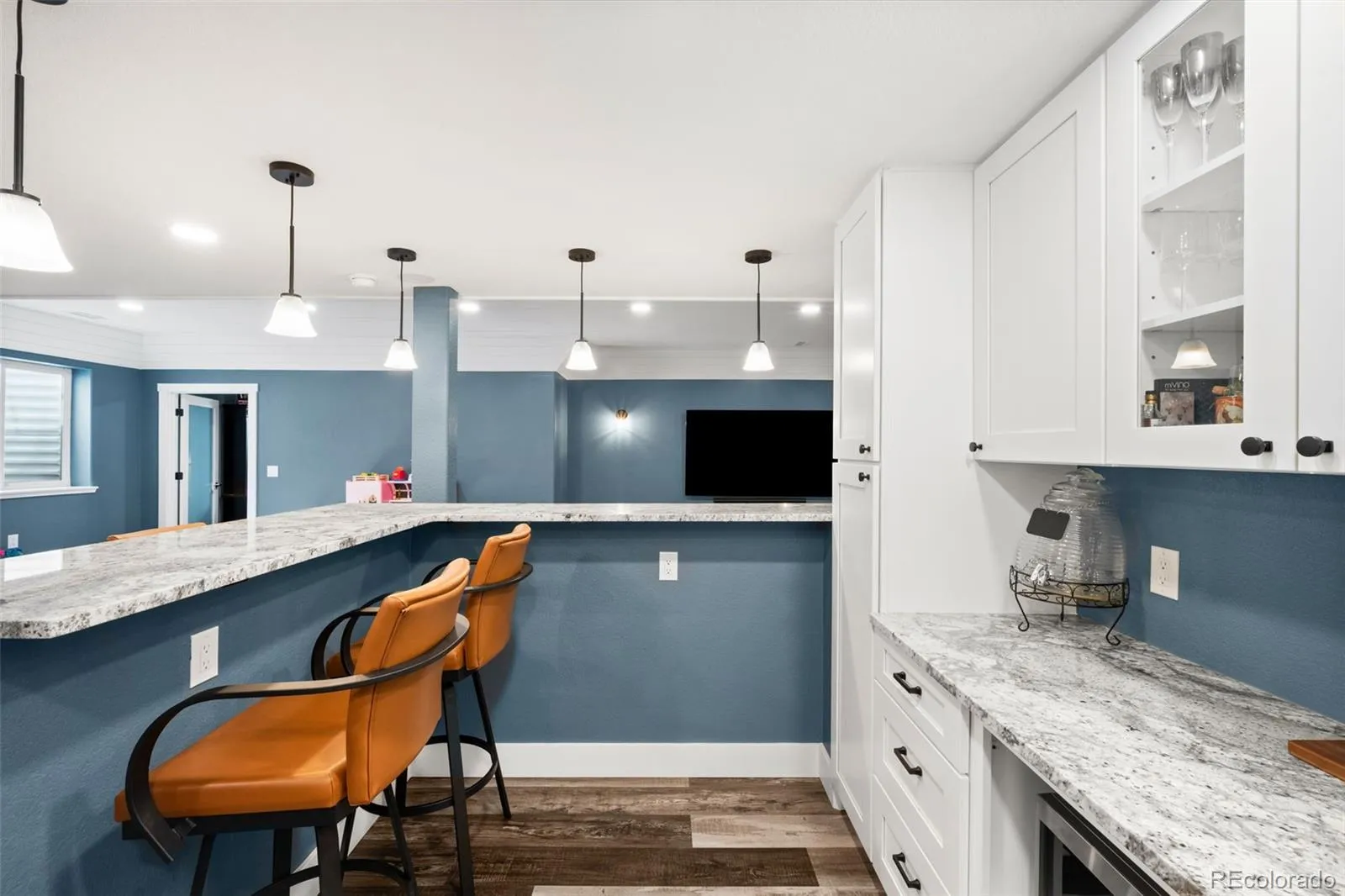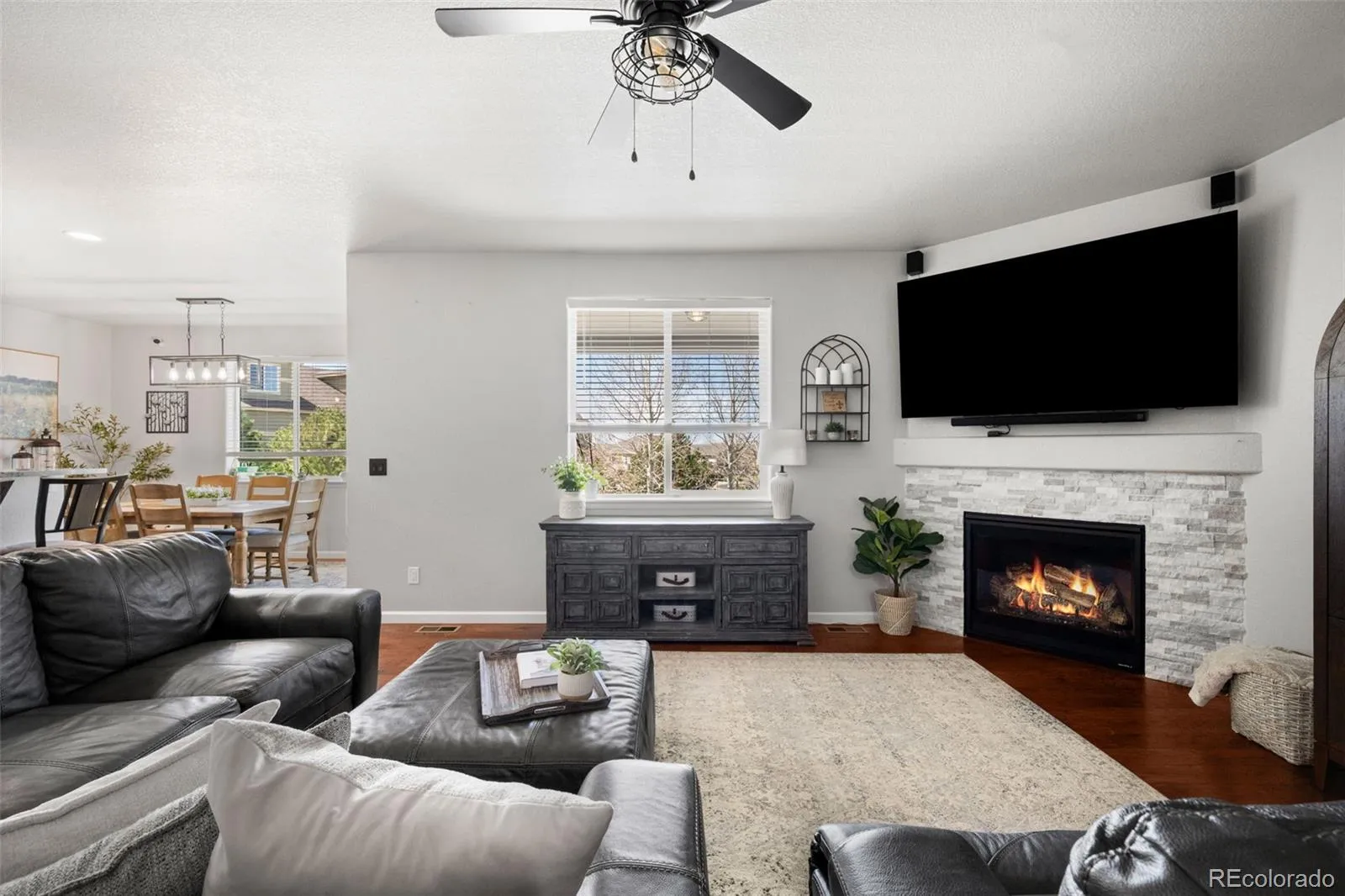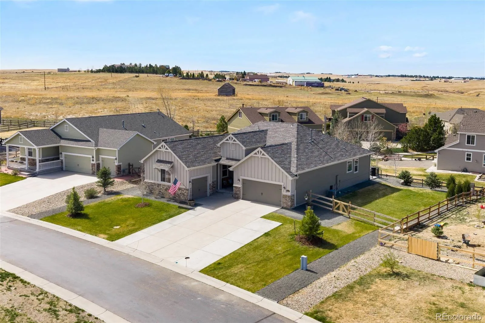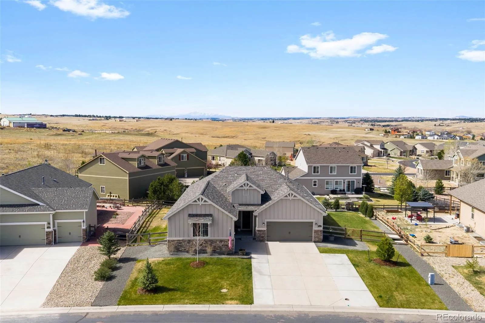 Located in the sought after golf course community of Spring Valley Ranch, this home represents the fully upgraded version buyers wish every builder home included. Major upgrades begin with a Class 4 impact resistant roof designed to withstand severe weather and reduce long term repair costs, a whole home Culligan water filtration system with reverse osmosis at the kitchen sink, custom window coverings, and a fully finished basement. The basement is truly what sets this home apart from others in the community. Built to contractor grade standards, it offers a complete in home entertainment experience with movie lighting, a premium gym with high density rubber flooring, a kitchenette with a full size refrigerator, microwave, sink, bar seating, and a pool table. There are two additional bedrooms with egress windows and a beautiful new bathroom. The main level features wood flooring, 9 foot ceilings, and an open, functional layout. The kitchen has been updated with white cabinetry, beautiful granite countertops, and stainless steel appliances. There is walk in pantry an eat-at counter. The spacious main level primary suite is in its own wing and includes a five piece bath and large walk in closet. Three additional main level bedrooms share a bathroom with a double vanity and a separate shower and toilet room. The backyard features a covered porch, extended concrete patio, steel railing for peace of mind with pets and kids, and a large fully fenced yard. Improvements include French drains, a new insulated sprinkler system with Rain Bird controls and rain sensors, and mature landscaping. Night skies are brilliant with little to no light pollution.Two separate garages offer space for cars, toys, or a golf cart, are finished with epoxy floors and overhead storage. An additional 10 feet of driveway provides extra parking. This is the upgraded benchmark home in Spring Valley Ranch.