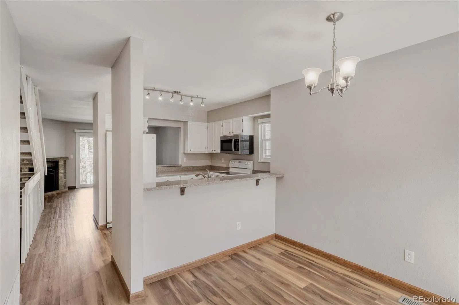 Fantastic end-unit townhouse in the Quailridge community. This property features durable low maintenance LVP flooring throughout the main level. The kitchen features newly refurbished cabinets and open views into both the dining and family rooms. The family room is highlighted with a natural wood burning fireplace and access to the back patio. The top floor offers two bedrooms and two full bathrooms. The spacious primary suite includes great natural light, a ceiling fan and an ensuite bathroom. A partially finished basement provides the 3rd bedroom and a large flex room for ample storage. Ideal location tucked away in the community with open greenbelt to the side and behind the unit. The Quailridge community offers extensive amenities with HOA dues under $300 per month for this property.