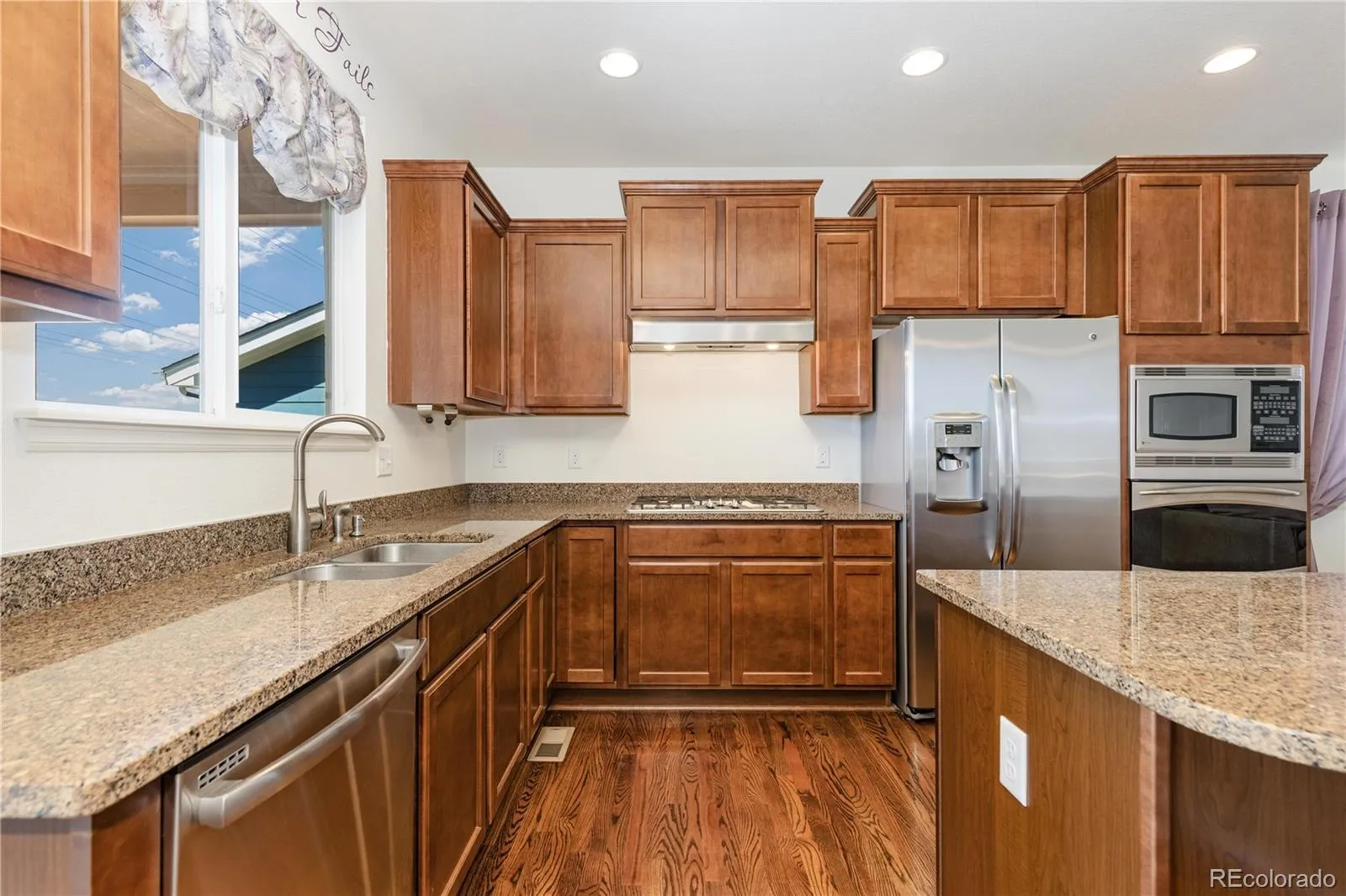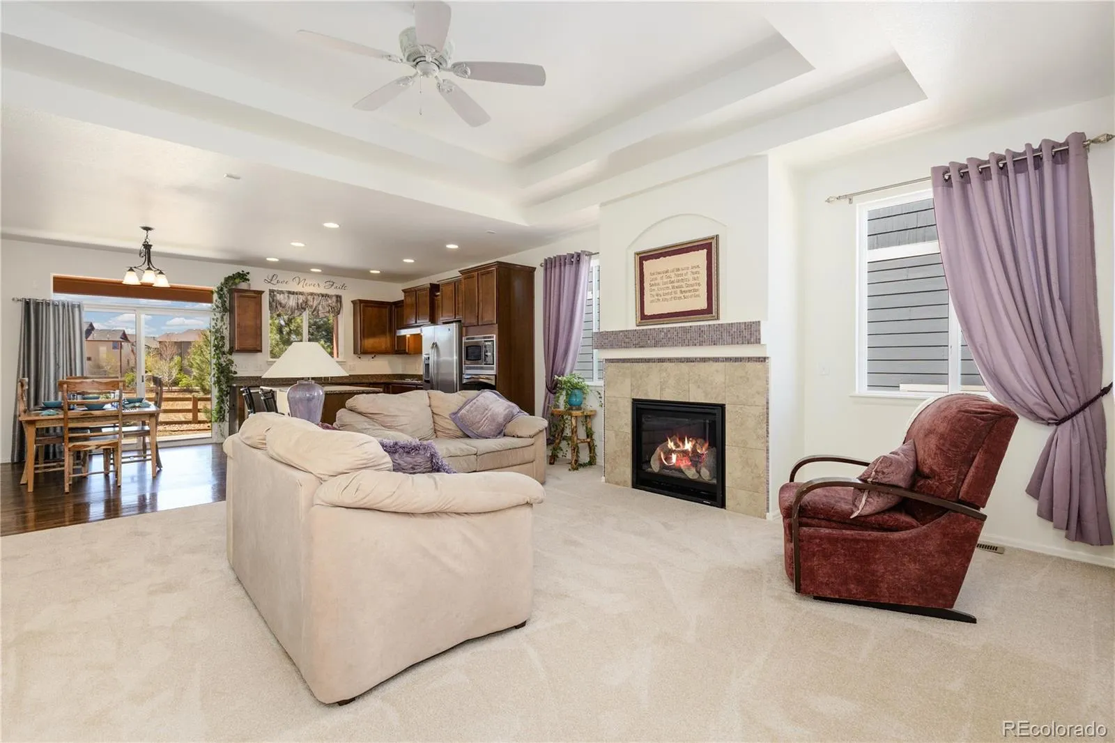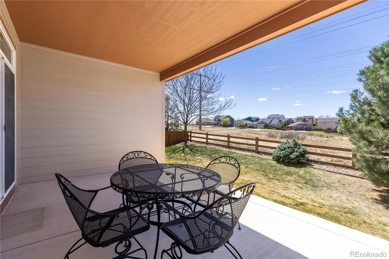 Located in Castle Oaks Terrain, this move-in-ready ranch offers open-concept living, thoughtful updates, and a peaceful setting backing to open space and greenbelt. A covered stone entry creates a welcoming first impression, leading into a bright, functional layout. The main living area features double-tiered coffered ceilings, abundant natural light, and a cozy gas fireplace that anchors the space. It flows into the kitchen and dining area, where hardwood flooring, slab granite countertops, and a large center island provide both style and function. The kitchen is well-appointed with maple cabinetry in a rich sable finish, stainless steel appliances including a gas range, hood, oven, microwave, refrigerator, dishwasher, and disposal, along with a generous walk-in pantry just off the dining area. The primary suite offers a comfortable retreat with two walk-in closets and a spacious five-piece bath featuring granite countertops, a soaking tub, and a separate shower. A secondary bedroom plus a dedicated office, sitting room, or flex space adds versatility for a variety of needs. New carpet installed in 2026 enhances the fresh, move-in-ready feel, while tile flooring is featured in all three baths and the laundry area. Step outside to a large covered back patio overlooking open space, creating a sense of privacy and a natural extension of the living space. The landscaped front and back yards include mature trees and shrubs, a full irrigation system, and a fenced backyard with freshly stained fencing in 2026. The unfinished basement offers excellent potential for future expansion. Additional features include a 2-car attached garage, central A/C, window coverings, ceiling fans, outdoor coach lighting, surround sound wiring, and a security system with wired doors and windows. Smoke-free home with durable stone and frame exterior. Residents enjoy access to Terrain’s pools, clubhouse, and miles of walking and biking trails throughout the community.