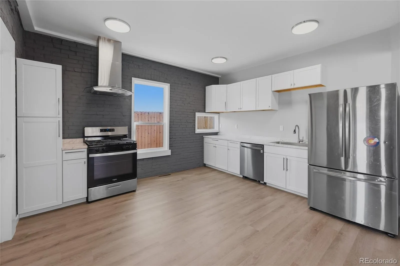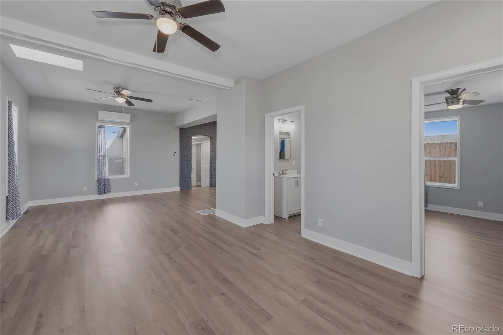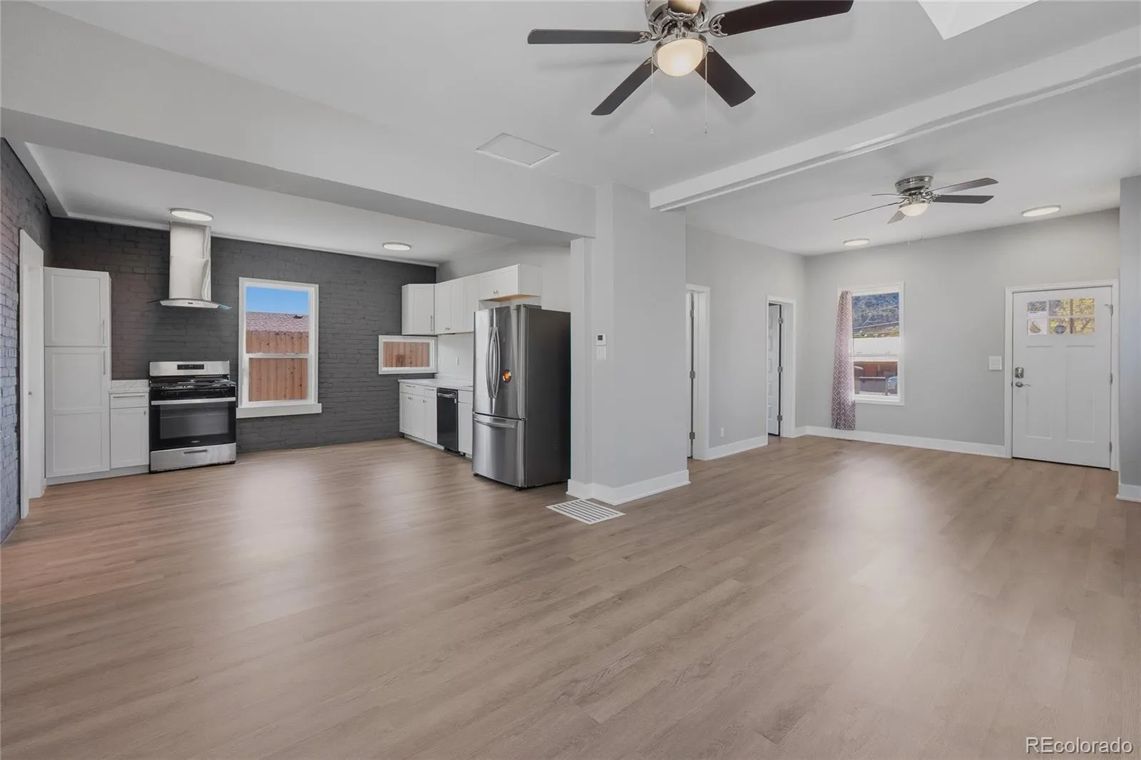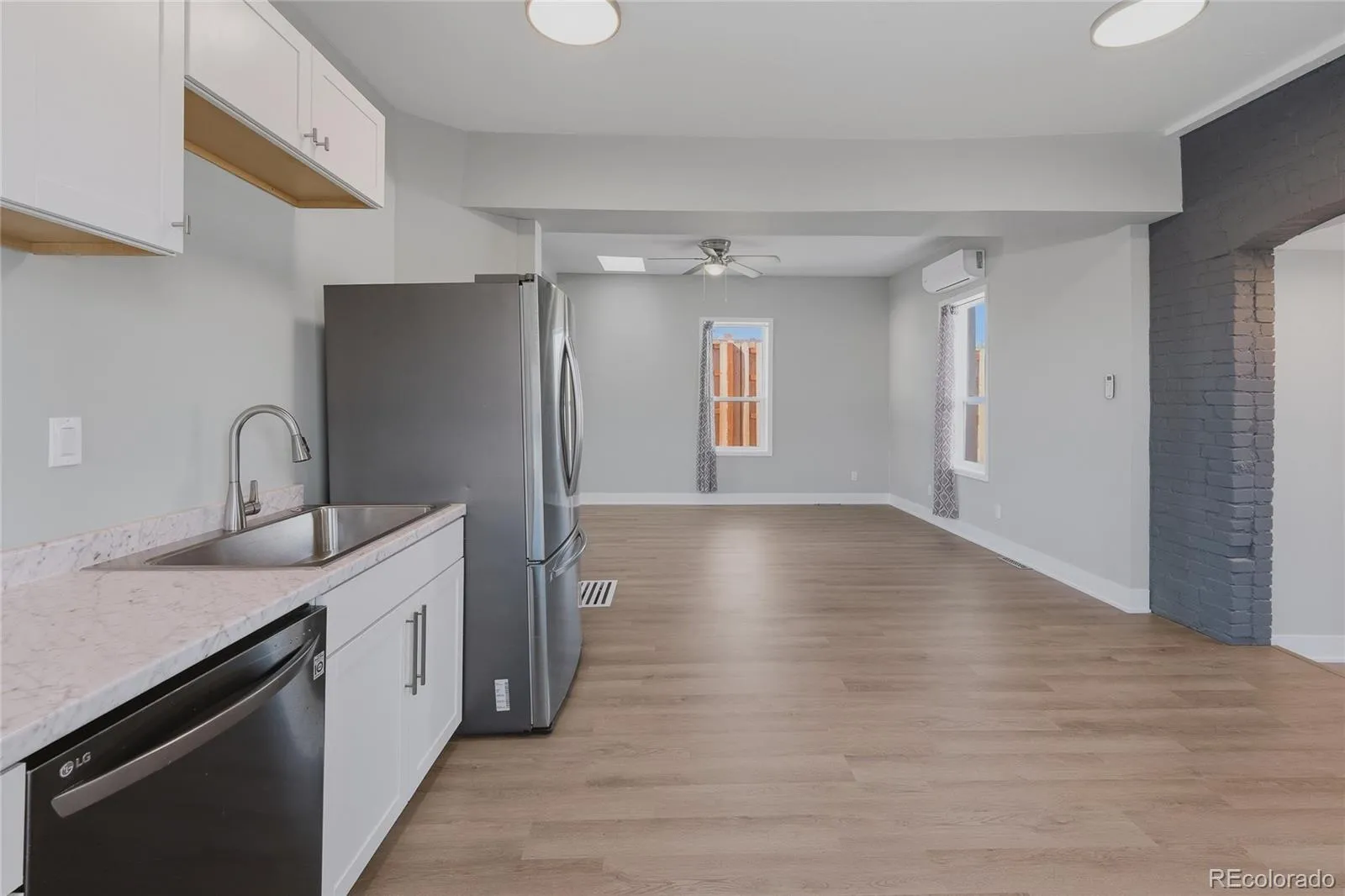 Inside, you’ll find a bright, clean, modern feel with an updated kitchen showcasing sleek cabinetry, stainless steel appliances, and a stylish painted brick accent wall that adds character and a custom touch. The open living and dining area is filled with natural light from a skylight, creating a warm, airy atmosphere that enhances the home’s inviting feel. The layout flows seamlessly, making it ideal for both everyday living and entertaining. The home also includes a foundation inspection and warranty through Groundworks, adding an extra layer of confidence.