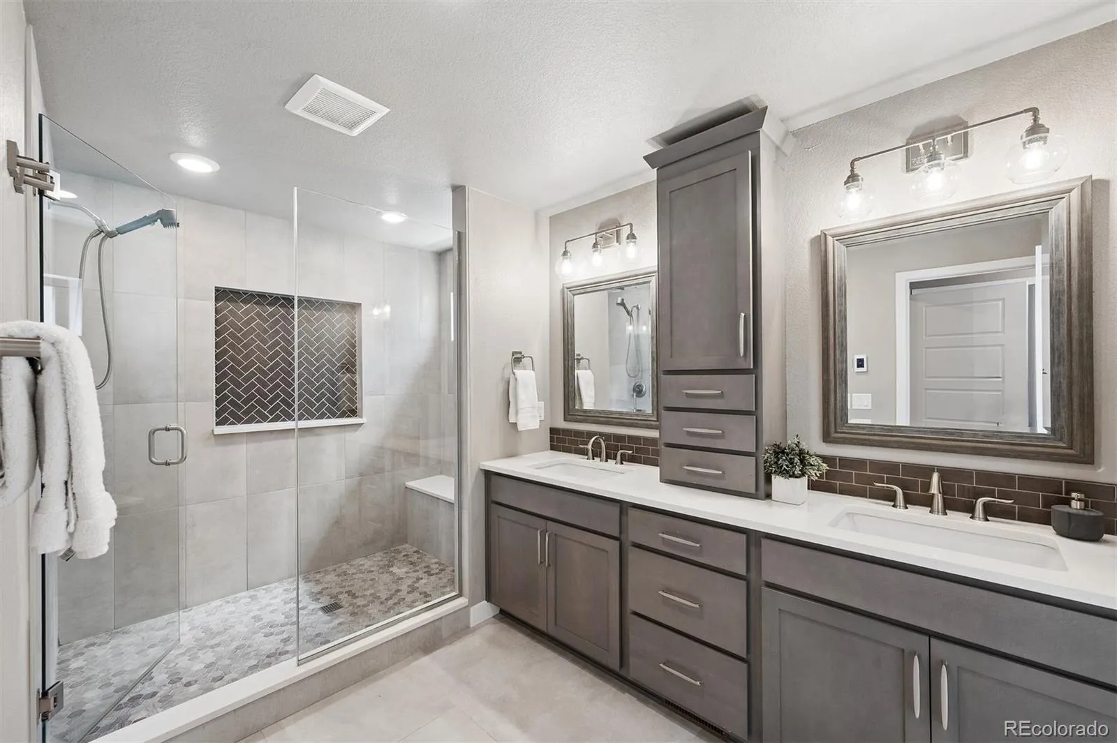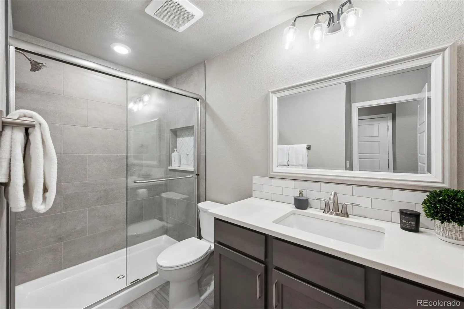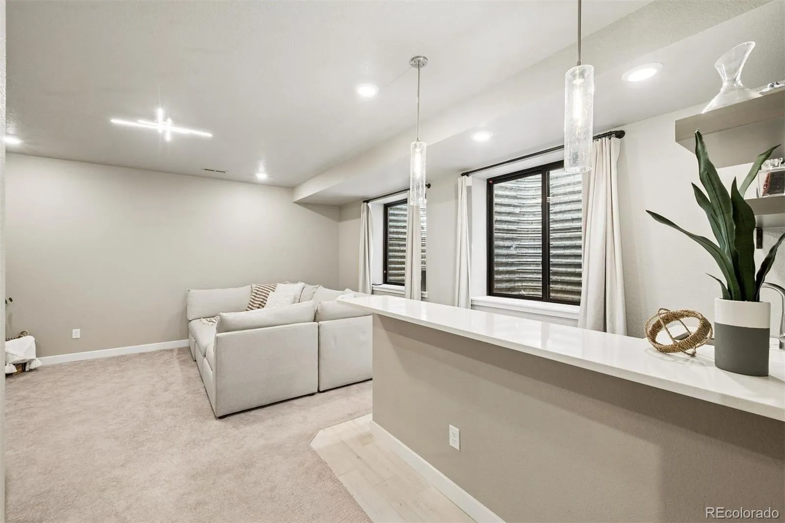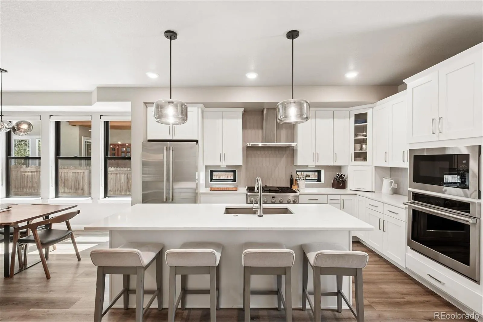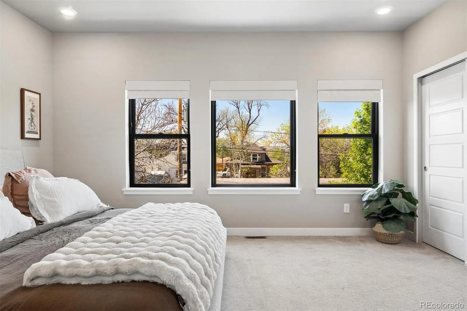 Ideally situated in the heart of Platt Park, one of Denver’s most sought-after neighborhoods, this thoughtfully designed residence blends modern sophistication with effortless, walkable living—just moments from South Pearl Street’s boutiques, dining, and local charm. Built in 2021, the home offers tall ceilings, expansive windows, and seamless indoor-outdoor connection, complete with both front and back yards, a fully fenced setting, and a rooftop deck capturing stunning mountain views. The main level is designed for both everyday living and entertaining, featuring a spacious dining area and a light-filled great room anchored by a gas fireplace with a sleek tile surround and mantle. A custom bar with wine cooler adds an elevated touch, while updated lighting enhances the home’s contemporary aesthetic. At the heart of the home, the kitchen is both functional and refined—appointed with quartz countertops, soft-close white cabinetry, and a full suite of Monogram stainless steel appliances, including a six-burner gas cooktop with hood, built-in oven, microwave, and dishwasher. A large center island and walk-in pantry complete the space, offering both style and convenience. Upstairs, the primary suite serves as a private retreat, featuring a generous walk-in closet, additional wall closets, and a beautifully finished en-suite bath with tile flooring and dual vanities. An additional bedroom with walk-in closet and ceiling fan, along with a full bath, provides comfortable accommodations for family or guests. The finished basement expands the home’s versatility with a spacious recreation room, wet bar with beverage fridge, custom shelving, and a third bedroom with adjacent three-quarter bath—ideal for guests or extended living. Additional highlights include LVP flooring, plush carpeting, a mudroom with built-in cubbies, dedicated laundry room, and a detached two-car garage.