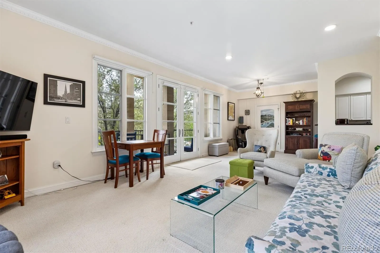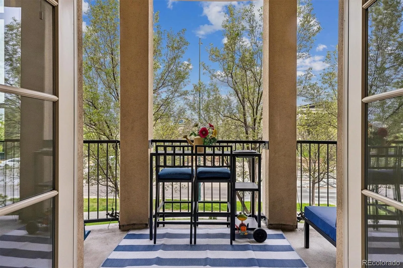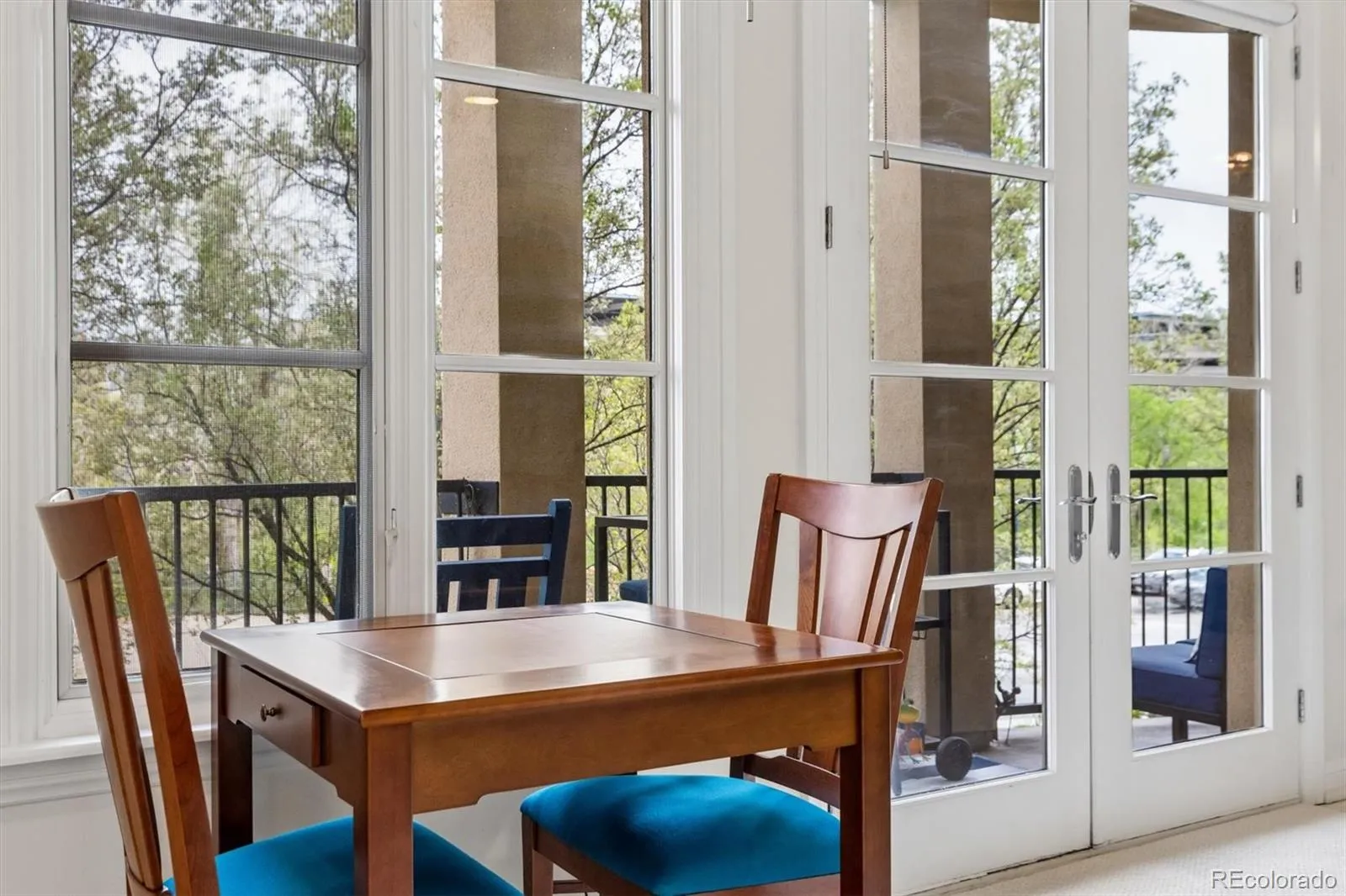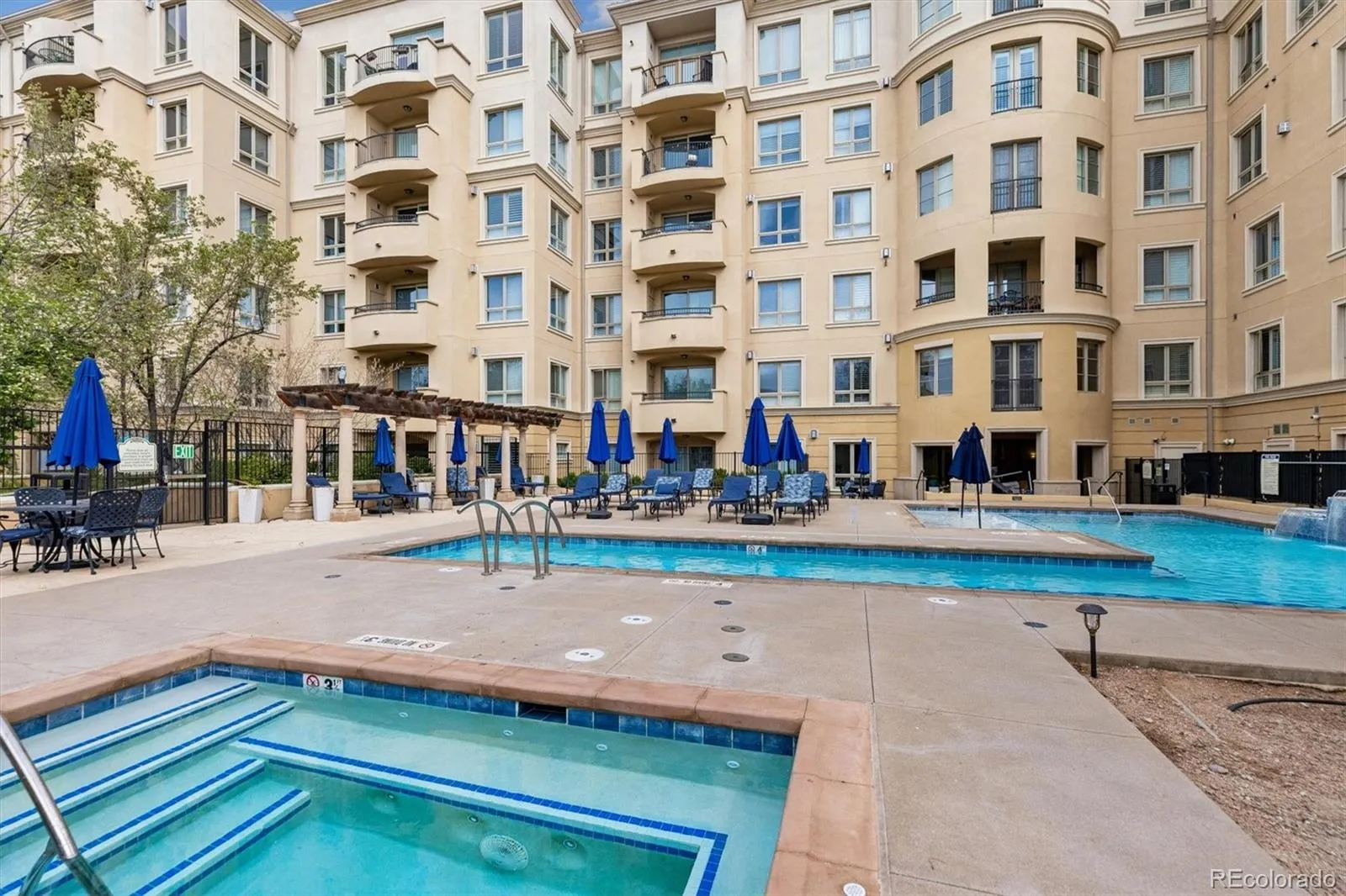 Welcome to your new paradise in the trees! This is an updated and upgraded, two full bath one-bedroom plus a study corner unit on the south bank of Cherry Creek with north and western views. Nine-foot ceilings with crown molding throughout the home and walls of windows in the Living and Dining Room with French doors leading to the charming balcony are graced with automated shades including both solar and blackout on the West window. In the primary bedroom with a 5-piece, ensuite bath, newly tiled shower, the West window has both manually operated solar shades as well as linen black-out curtains. New carpet in the den, living room, and dining room in 2024. Fresh paint throughout (2025) and a new closet system in the master closet (2024). New kitchen backsplash (granite countertops!) and bathroom faucets, bathroom sinks, and new lighting, including an upscale hotel back-lit mirror. Appliance upgrades boast a Samsung 4-door counter-depth refrigerator, a Samsung dishwasher, and an LG washer and dryer. Enjoy the new designer lighting throughout. Portico amenities include a Social Room with fireplace and kitchen, a fitness facility, a hot tub and pools (year-round use!), and a spa with steam room, sauna, and massage room. 2 parking spaces at the foot of the East stairs and across from the elevators. You will love living at the prestigious Portico just steps from Cherry Creek with awesome views of the Denver Country Club fireworks!!