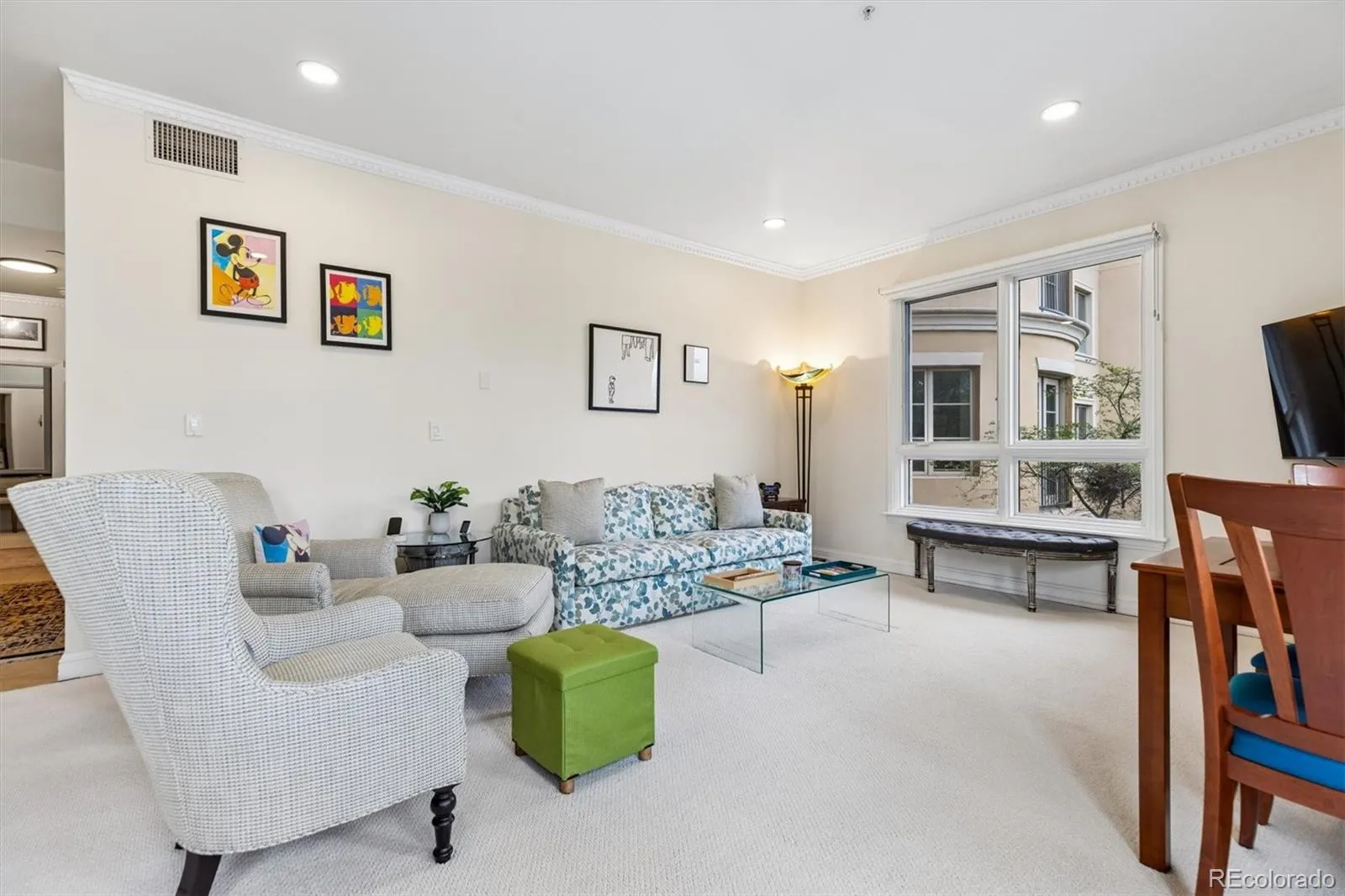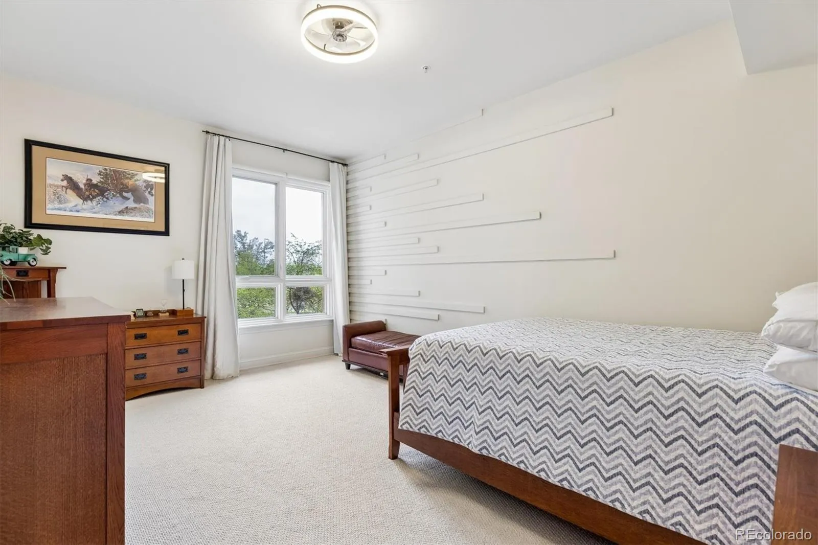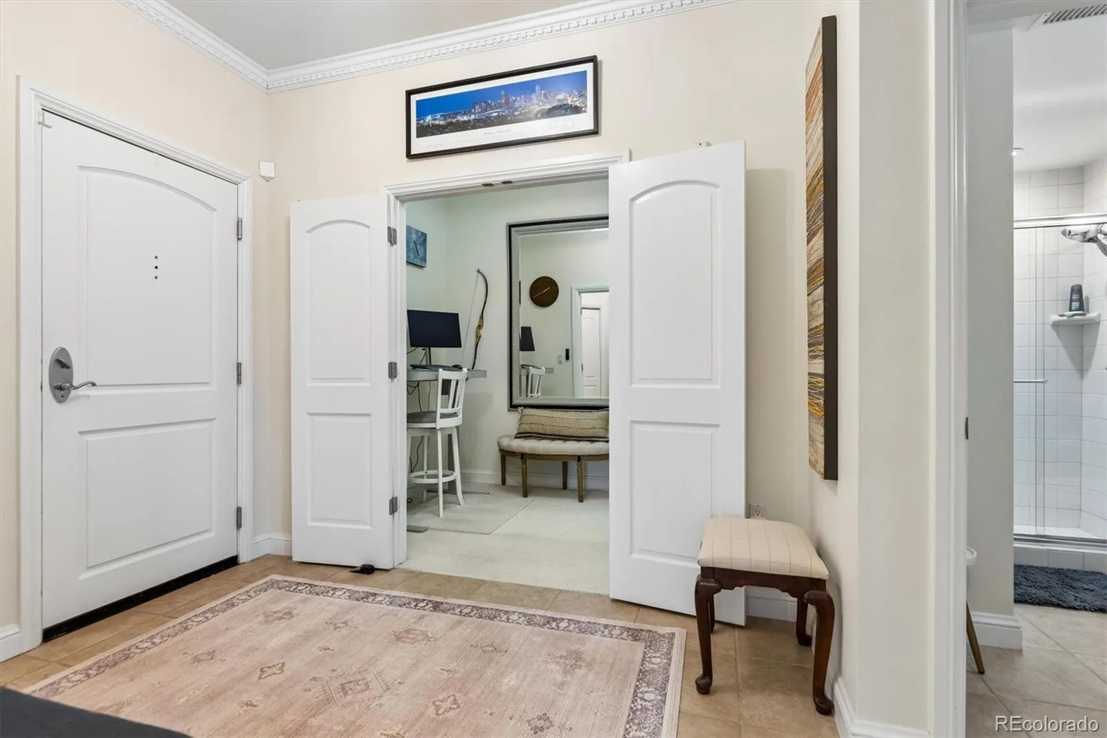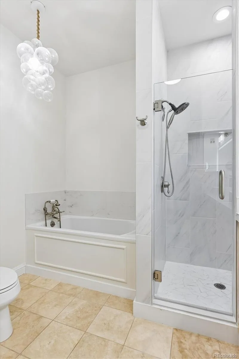 Welcome to your new paradise in the trees! This is an updated and upgraded, two full bath one-bedroom plus a study corner unit on the south bank of Cherry Creek with north and western views. Nine-foot ceilings with crown molding throughout the home and walls of windows in the Living and Dining Room with French doors leading to the charming balcony are graced with automated shades including both solar and blackout on the West window. In the primary bedroom with a 5-piece, ensuite bath, newly tiled shower, the West window has both manually operated solar shades as well as linen black-out curtains. New carpet in the den, living room, and dining room in 2024. Fresh paint throughout (2025) and a new closet system in the master closet (2024). New kitchen backsplash (granite countertops!) and bathroom faucets, bathroom sinks, and new lighting, including an upscale hotel back-lit mirror. Appliance upgrades boast a Samsung 4-door counter-depth refrigerator, a Samsung dishwasher, and an LG washer and dryer. Enjoy the new designer lighting throughout. Portico amenities include a Social Room with fireplace and kitchen, a fitness facility, a hot tub and pools (year-round use!), and a spa with steam room, sauna, and massage room. 2 parking spaces at the foot of the East stairs and across from the elevators. You will love living at the prestigious Portico just steps from Cherry Creek with awesome views of the Denver Country Club fireworks!!