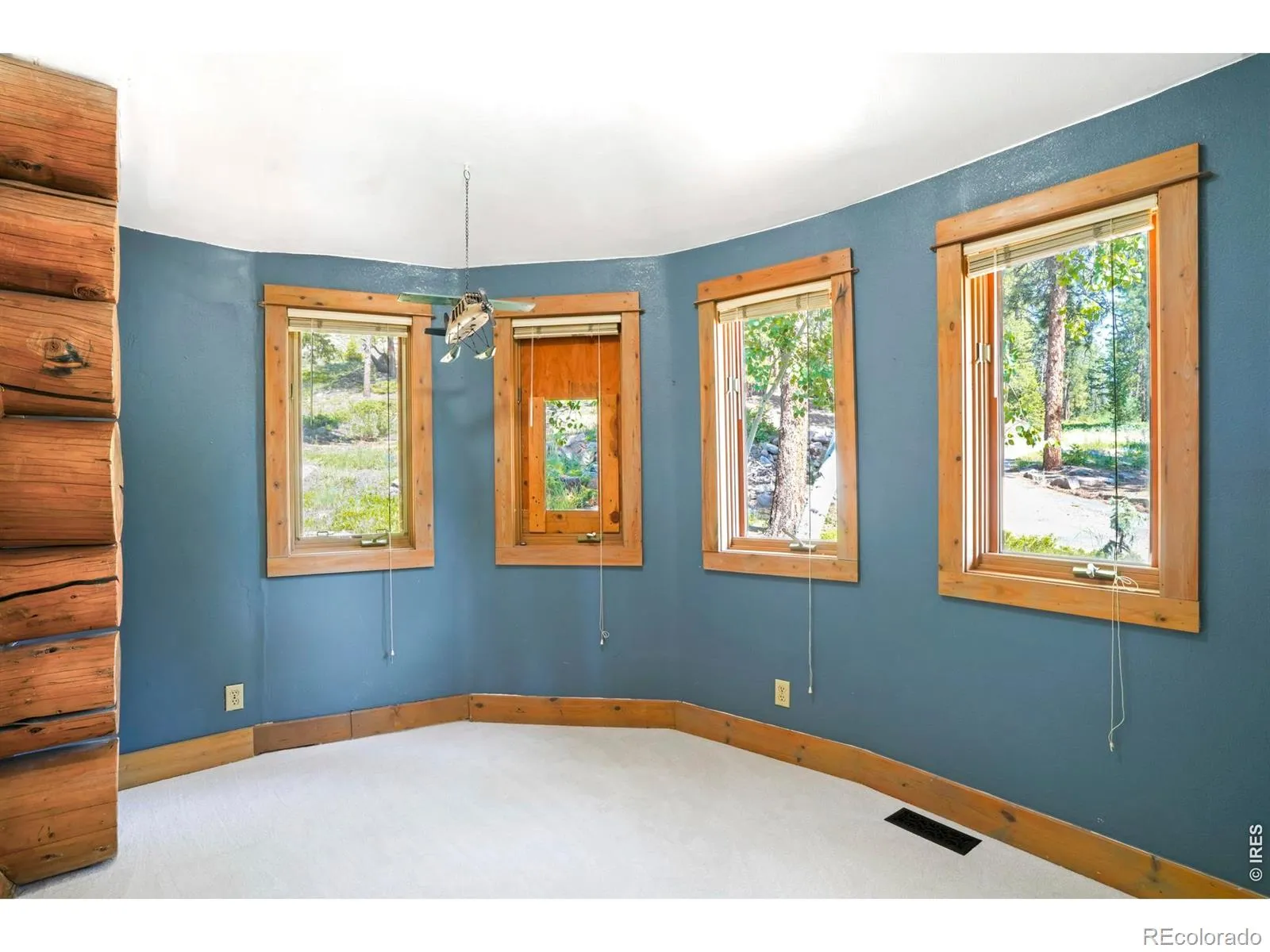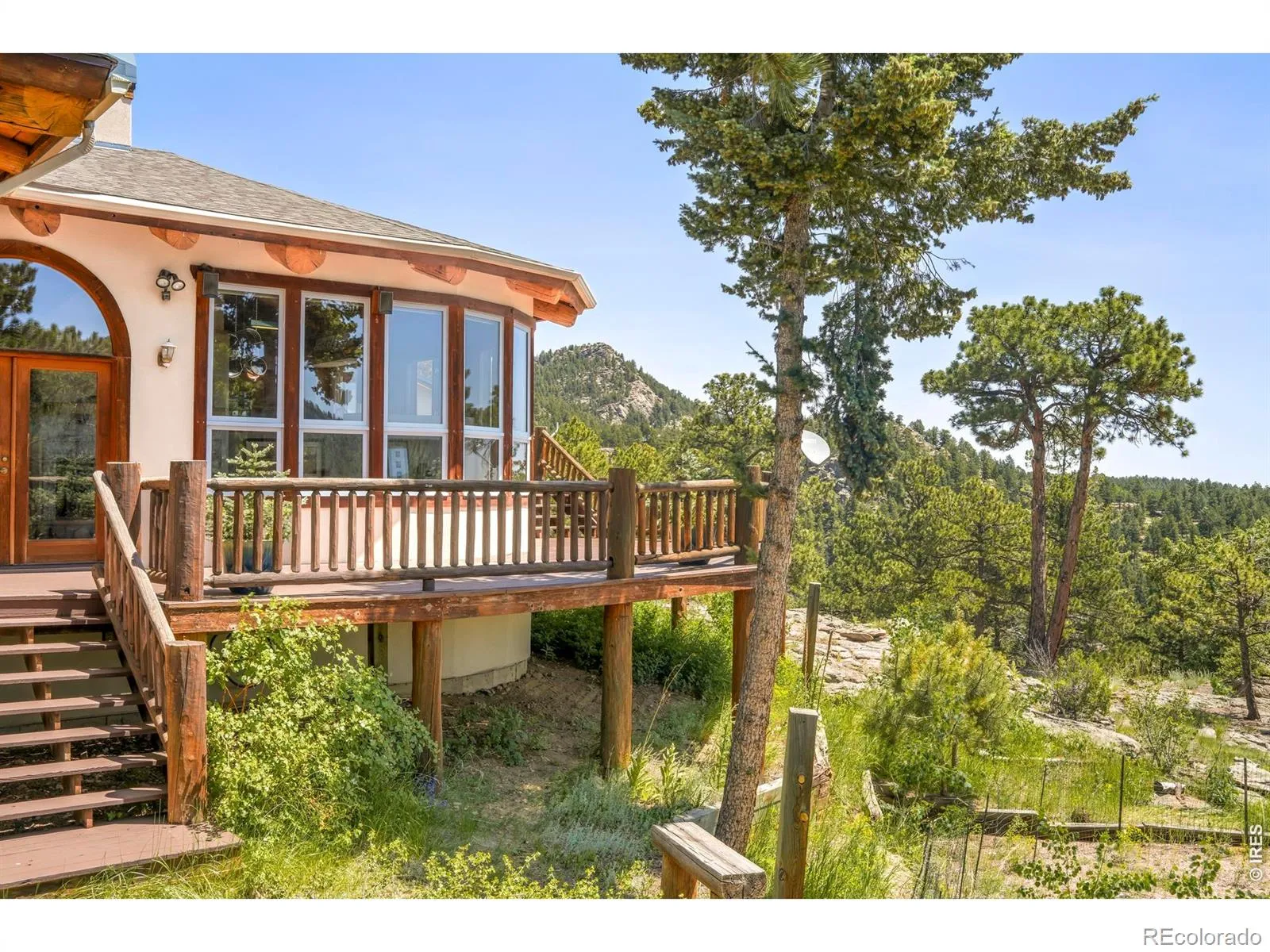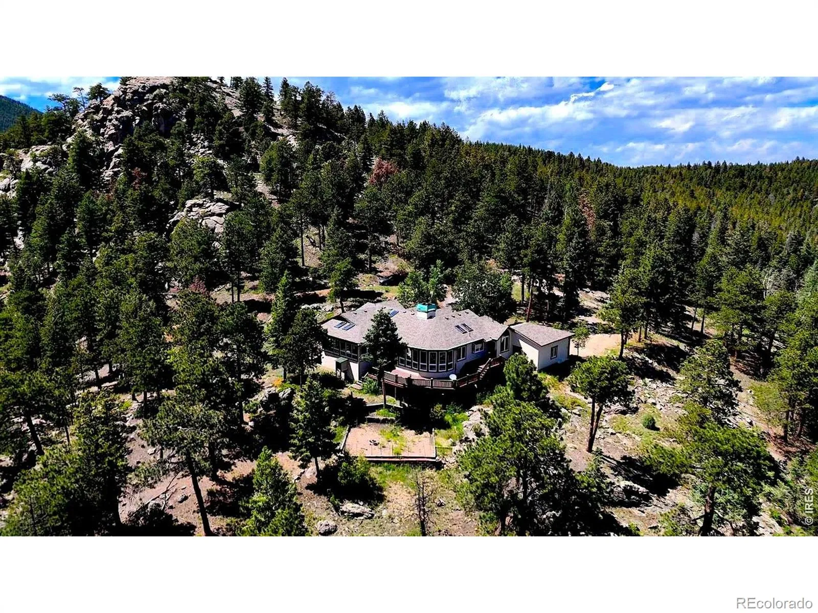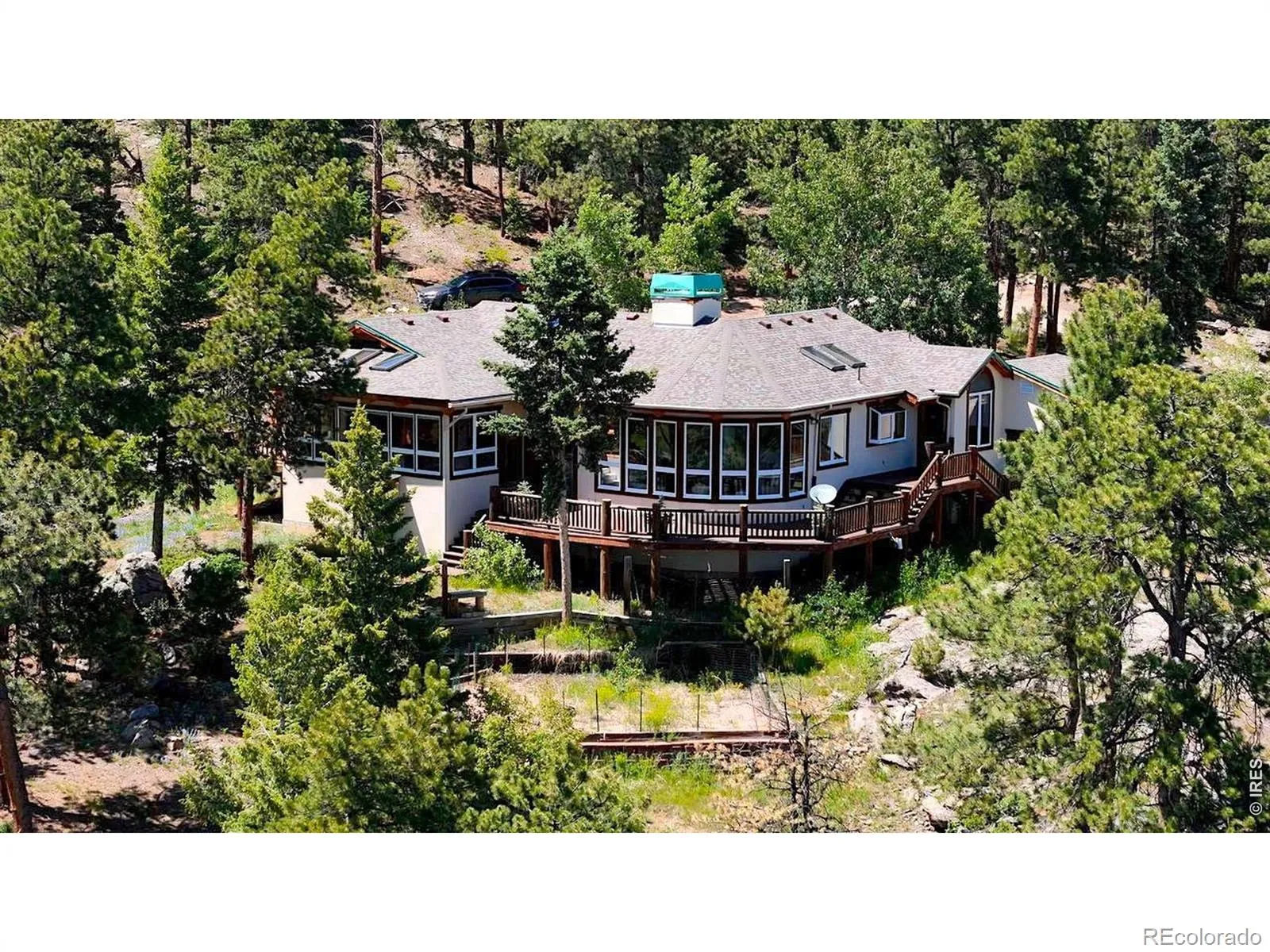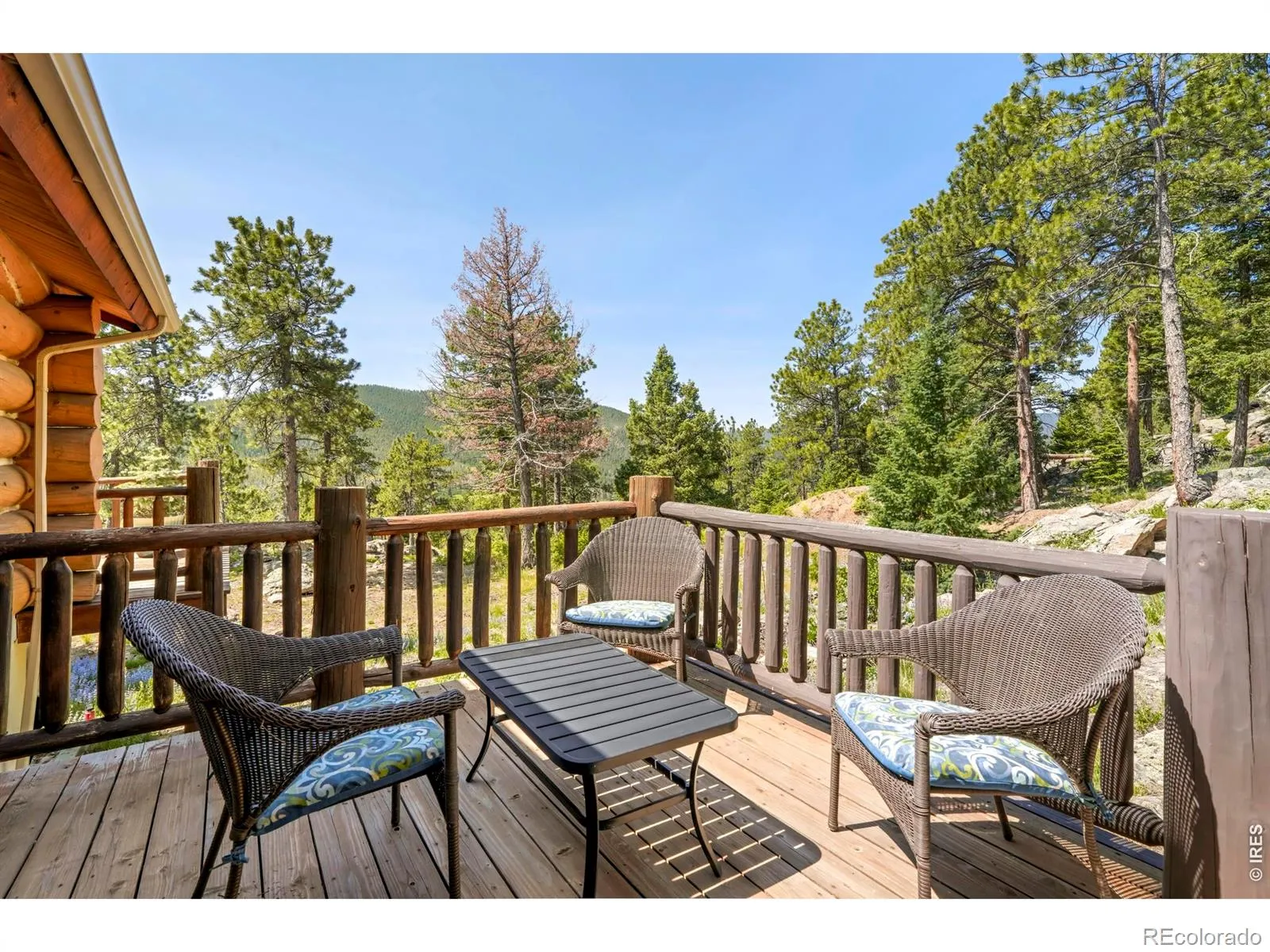 A rare blend of seclusion, craftsmanship and panoramic beauty, this custom British Columbian log home offers captivating views from every angle. On top of the mountain perched on 10.88 forested acres of pine, aspen and dramatic rock outcroppings, this residence showcases sweeping vistas of both the City and surrounding mountains. Designed for connection to nature and timeless comfort, the interior features cathedral ceilings, expansive south-facing windows and warm wood-look tile flooring. A spacious main-level primary suite boasts a remodeled bath, jetted tub, walk-in shower and direct access to a private sunroom and deck. The kitchen highlighted by a large pantry flows seamlessly into a cozy den with a river rock wall and a wood stove insert, ideal for entertaining. Additional highlights include two fireplaces, a versatile office, laundry room and a lower-level retreat. Bordered by Meyer Ranch and Denver Mountain Parks open space, this home sits just moments from Hwy 285 and the town of Aspen Park, Conifer + Morrison