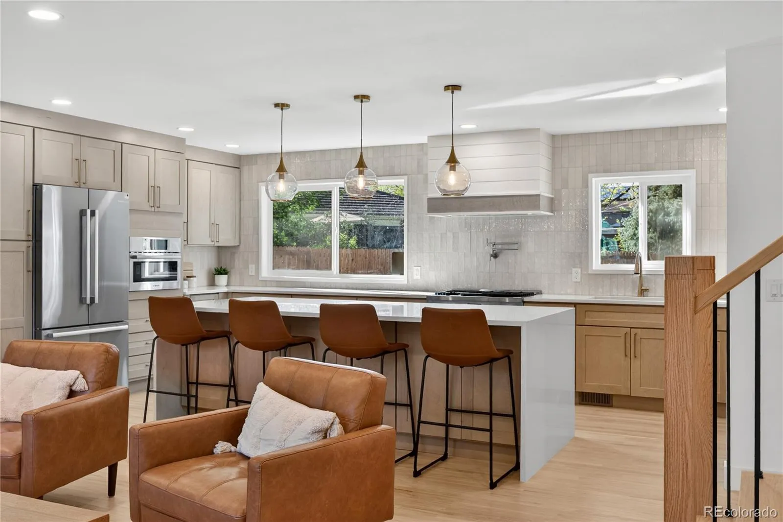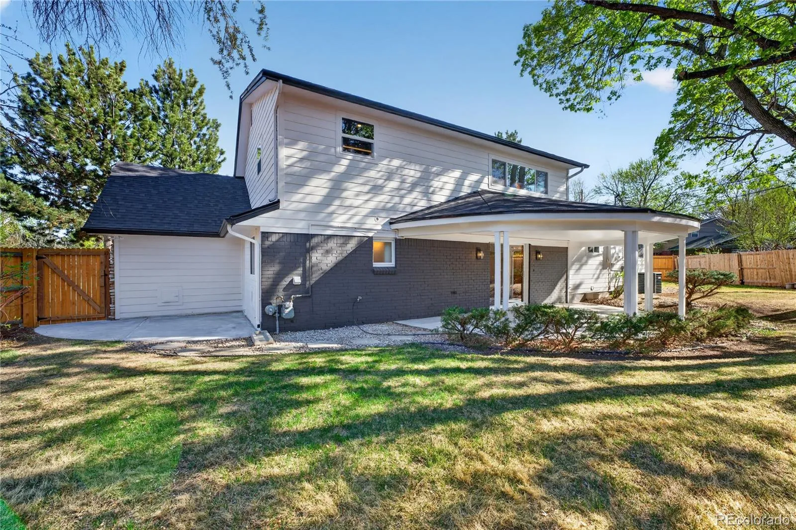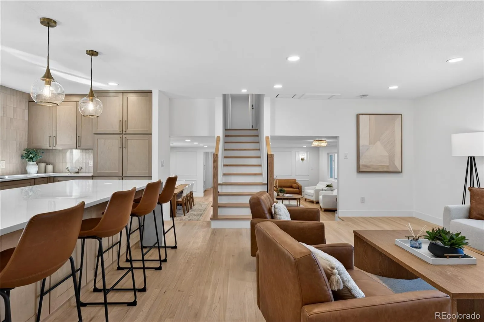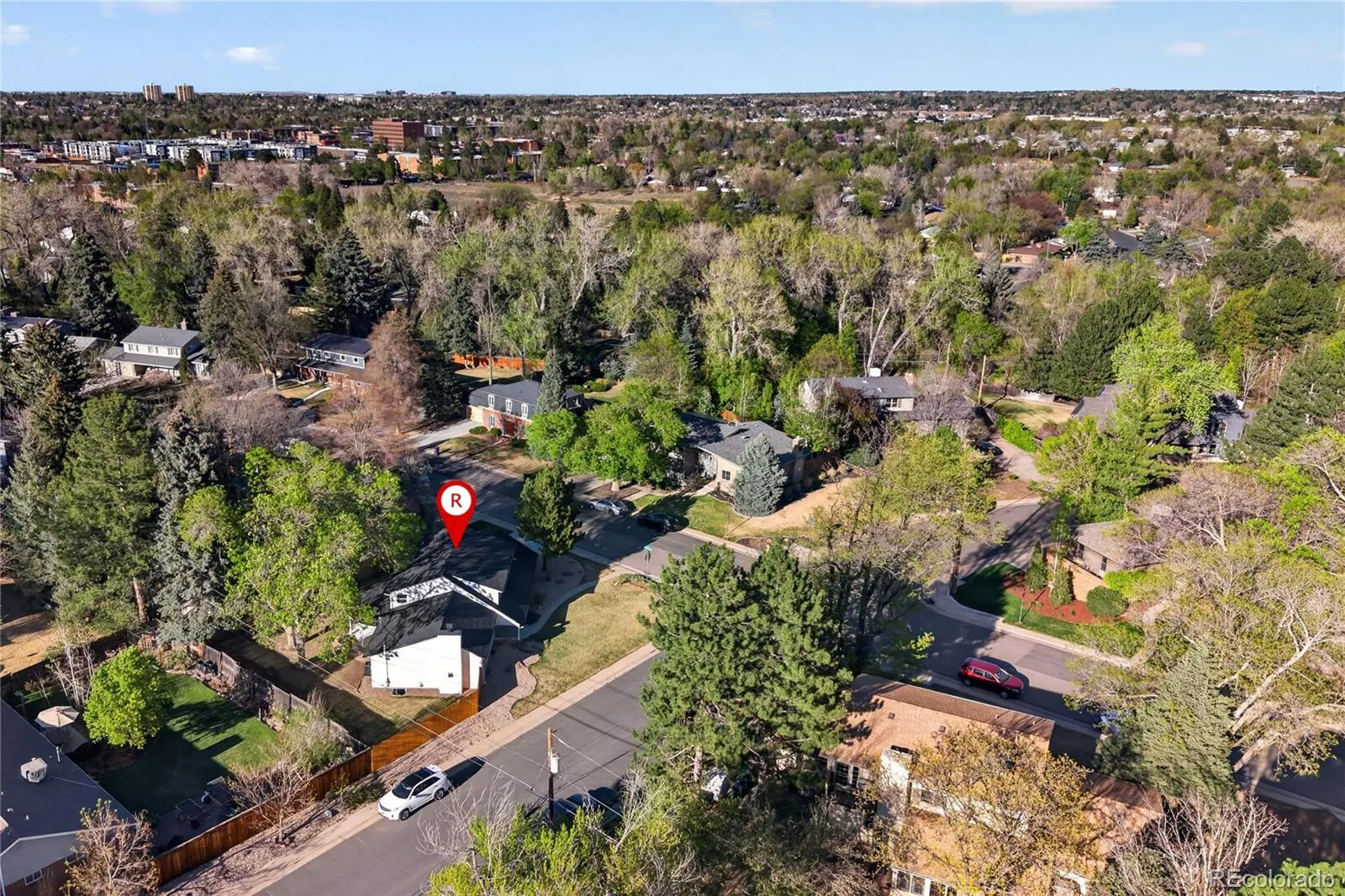 This stunning home in Holly Hills/Eastgate has been completely transformed with a full, high-end remodel reflecting exceptional craftsmanship and today’s most desirable design trends. Offering approximately 2,200 square feet above ground with four bedrooms plus a den on the second floor—an exceptionally rare find in this neighborhood—the home delivers both space and flexibility for modern living. Located in Holly Hills, ranked the #1 Best Place to Live in the Denver area by Niche, this property sits in one of the most sought-after communities. Set on a large, unique corner lot, the home’s unique angled architecture brings in natural light throughout the day, while mature trees and landscaping create a peaceful, private setting. Inside, the open-concept layout blends style and function. Hardwood flooring runs throughout, complemented by designer finishes. The gourmet kitchen features a quartz waterfall island, premium Bosch appliances including a 6-burner gas range with a custom hood, and sleek cabinetry. The adjacent living room showcases a linear gas fireplace with built-ins. The dining area sits just off the main living space and is enhanced by an elegantly designed wet bar with a beverage fridge—ideal for everyday living and entertaining. Upstairs offers four generously sized bedrooms, a versatile bonus room, beautifully designed bathrooms with high-end finishes, and a custom walk-in closet. The fully finished basement adds a large family room, private guest bedroom, and attached bath—ideal for visitors or multi-generational living. Outside, enjoy a landscaped backyard with a covered patio. All systems—including HVAC, water heater, roof, windows, and insulation—are brand new. Minutes to Bible Park and the High Line Canal Trail, with easy access to shopping and dining, this move-in-ready home offers luxury, comfort, and location.