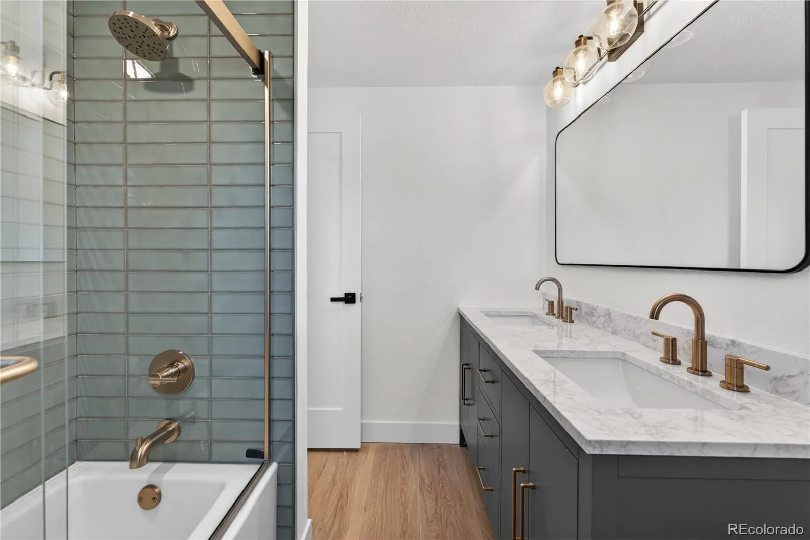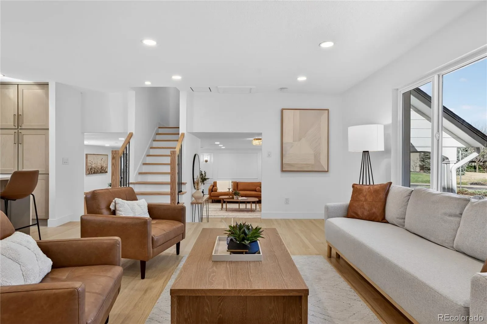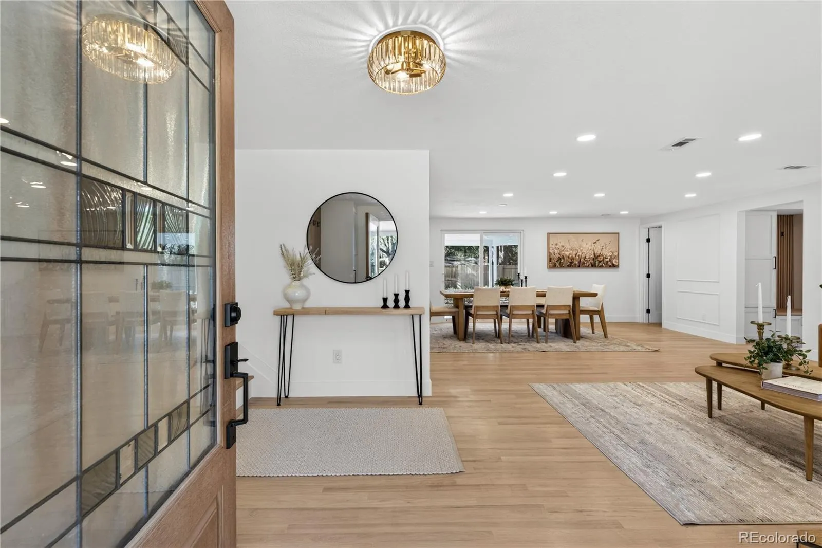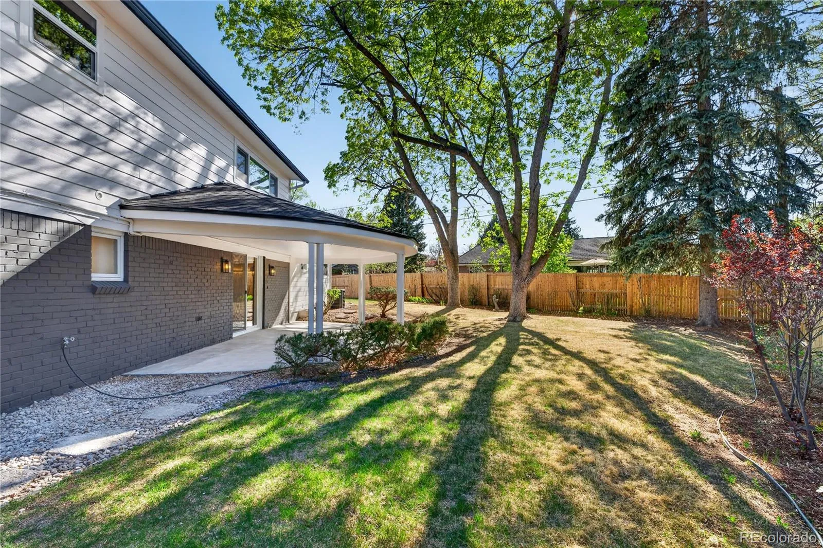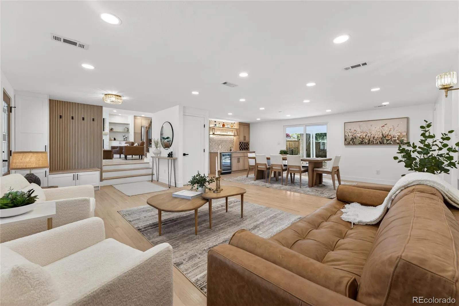 This stunning home in Holly Hills/Eastgate has been completely transformed with a full, high-end remodel reflecting exceptional craftsmanship and today’s most desirable design trends. Offering approximately 2,200 square feet above ground with four bedrooms plus a den on the second floor—an exceptionally rare find in this neighborhood—the home delivers both space and flexibility for modern living. Located in Holly Hills, ranked the #1 Best Place to Live in the Denver area by Niche, this property sits in one of the most sought-after communities. Set on a large, unique corner lot, the home’s unique angled architecture brings in natural light throughout the day, while mature trees and landscaping create a peaceful, private setting. Inside, the open-concept layout blends style and function. Hardwood flooring runs throughout, complemented by designer finishes. The gourmet kitchen features a quartz waterfall island, premium Bosch appliances including a 6-burner gas range with a custom hood, and sleek cabinetry. The adjacent living room showcases a linear gas fireplace with built-ins. The dining area sits just off the main living space and is enhanced by an elegantly designed wet bar with a beverage fridge—ideal for everyday living and entertaining. Upstairs offers four generously sized bedrooms, a versatile bonus room, beautifully designed bathrooms with high-end finishes, and a custom walk-in closet. The fully finished basement adds a large family room, private guest bedroom, and attached bath—ideal for visitors or multi-generational living. Outside, enjoy a landscaped backyard with a covered patio. All systems—including HVAC, water heater, roof, windows, and insulation—are brand new. Minutes to Bible Park and the High Line Canal Trail, with easy access to shopping and dining, this move-in-ready home offers luxury, comfort, and location.