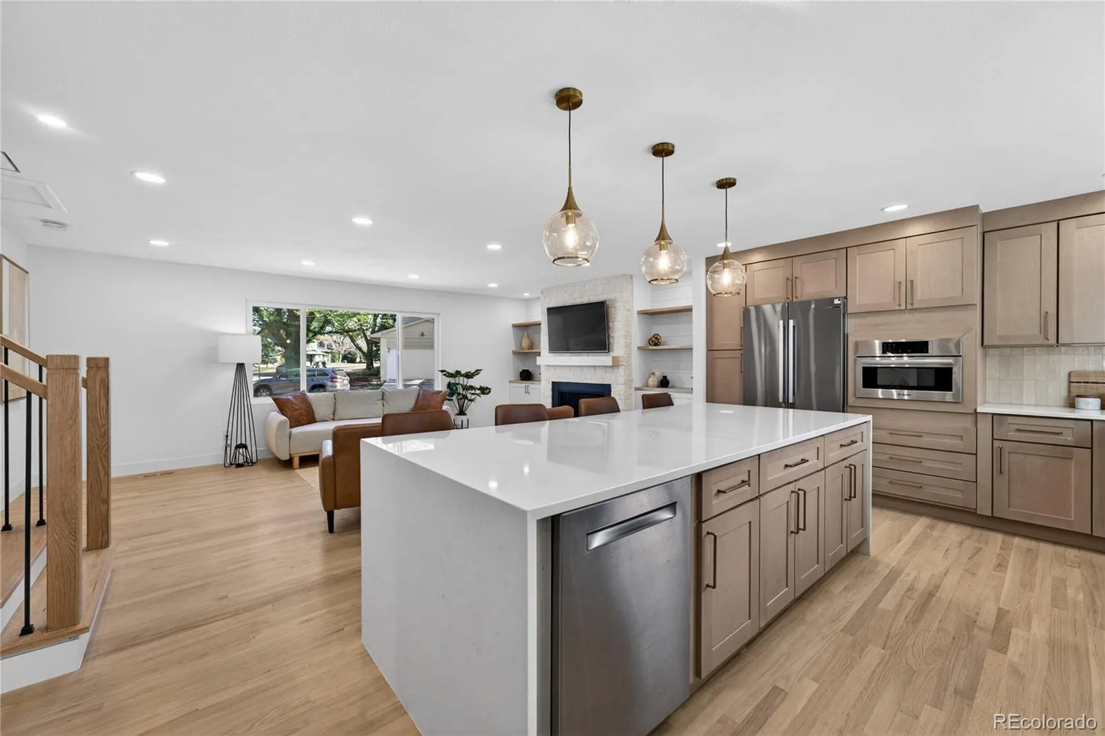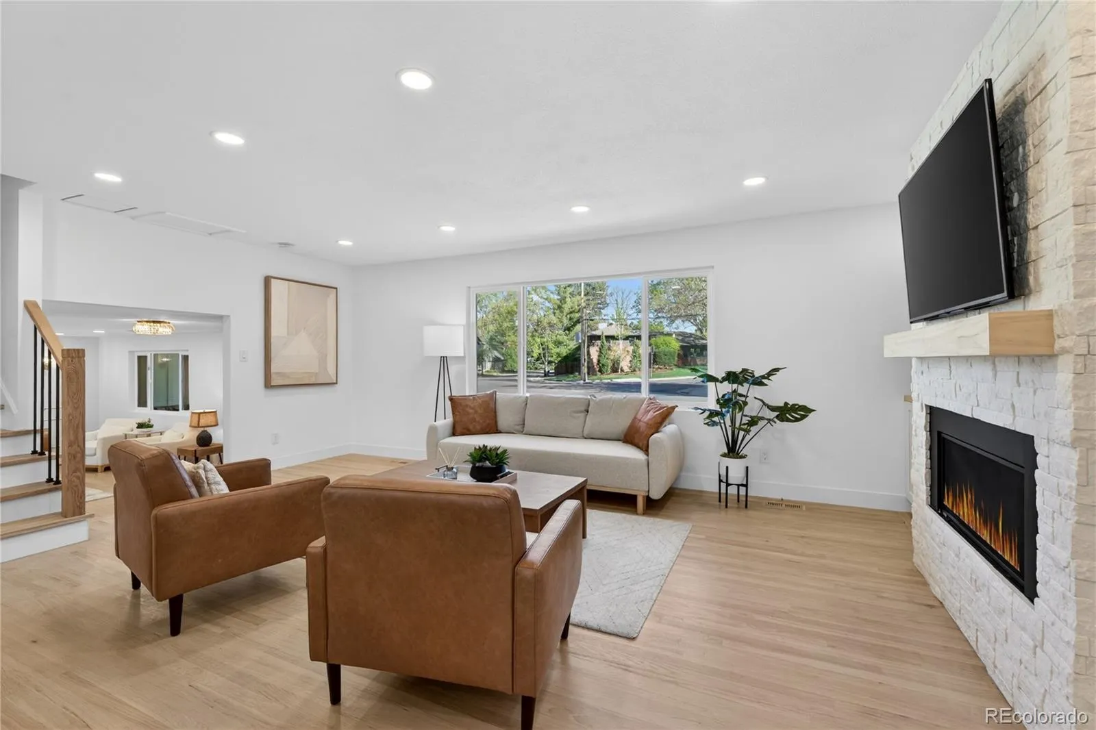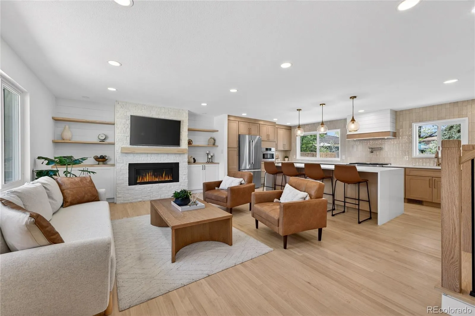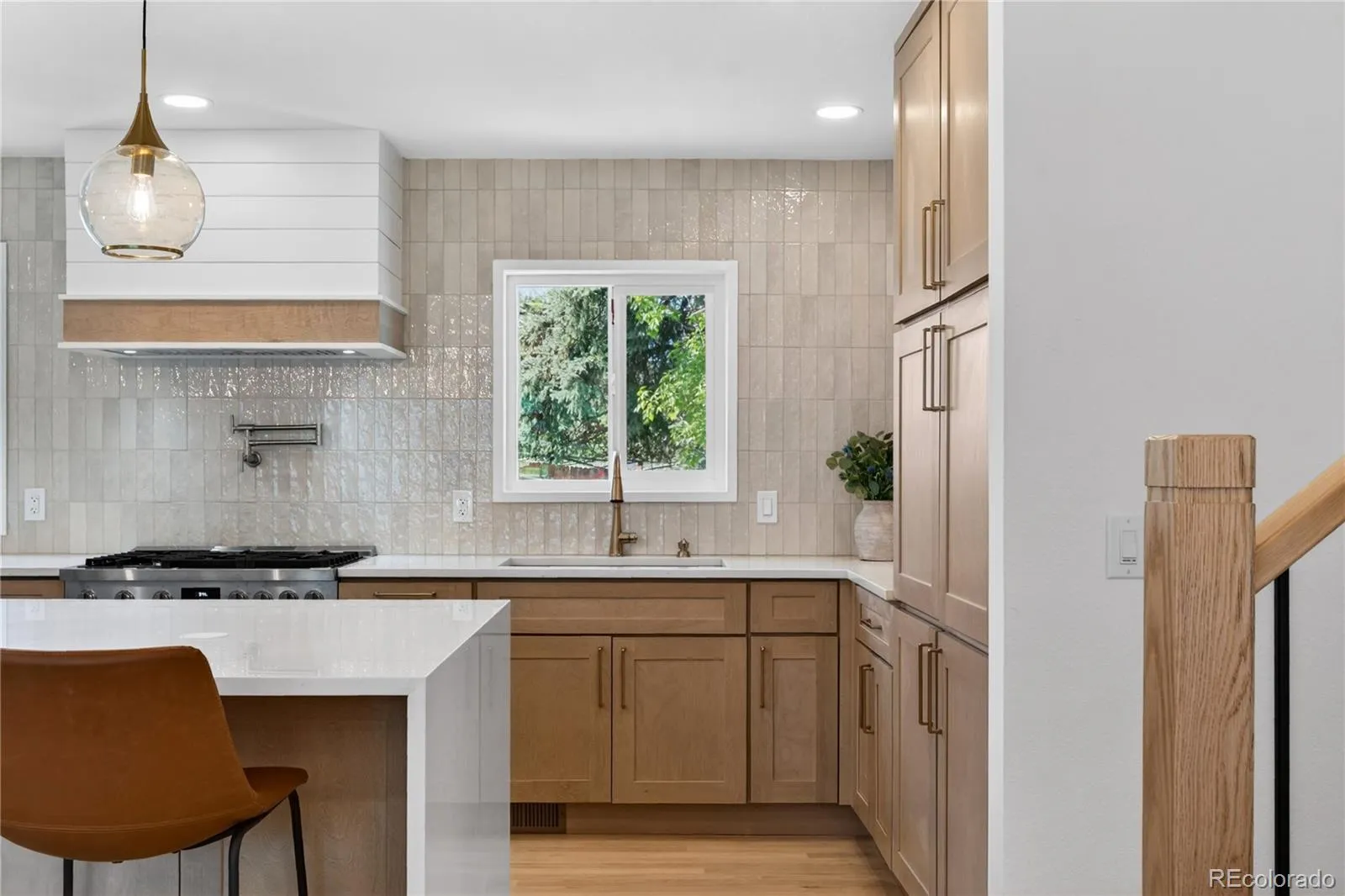 This stunning home in Holly Hills/Eastgate has been completely transformed with a full, high-end remodel reflecting exceptional craftsmanship and today’s most desirable design trends. Offering approximately 2,200 square feet above ground with four bedrooms plus a den on the second floor—an exceptionally rare find in this neighborhood—the home delivers both space and flexibility for modern living. Located in Holly Hills, ranked the #1 Best Place to Live in the Denver area by Niche, this property sits in one of the most sought-after communities. Set on a large, unique corner lot, the home’s unique angled architecture brings in natural light throughout the day, while mature trees and landscaping create a peaceful, private setting. Inside, the open-concept layout blends style and function. Hardwood flooring runs throughout, complemented by designer finishes. The gourmet kitchen features a quartz waterfall island, premium Bosch appliances including a 6-burner gas range with a custom hood, and sleek cabinetry. The adjacent living room showcases a linear gas fireplace with built-ins. The dining area sits just off the main living space and is enhanced by an elegantly designed wet bar with a beverage fridge—ideal for everyday living and entertaining. Upstairs offers four generously sized bedrooms, a versatile bonus room, beautifully designed bathrooms with high-end finishes, and a custom walk-in closet. The fully finished basement adds a large family room, private guest bedroom, and attached bath—ideal for visitors or multi-generational living. Outside, enjoy a landscaped backyard with a covered patio. All systems—including HVAC, water heater, roof, windows, and insulation—are brand new. Minutes to Bible Park and the High Line Canal Trail, with easy access to shopping and dining, this move-in-ready home offers luxury, comfort, and location.