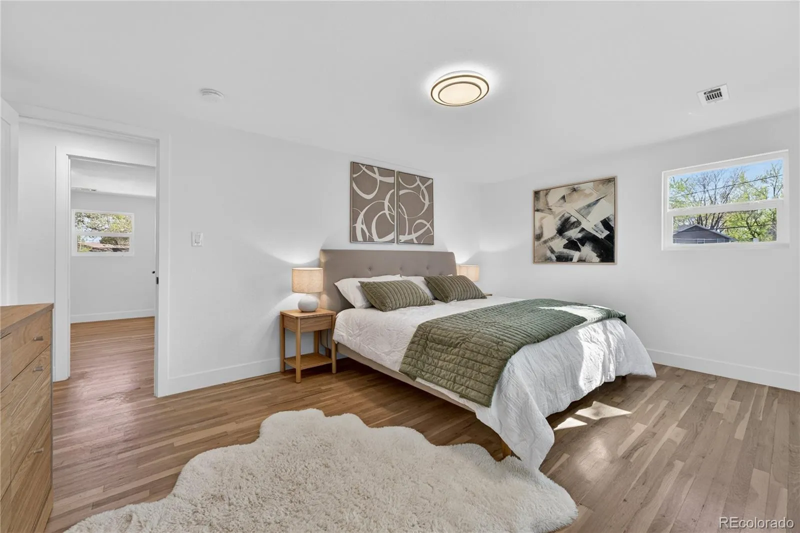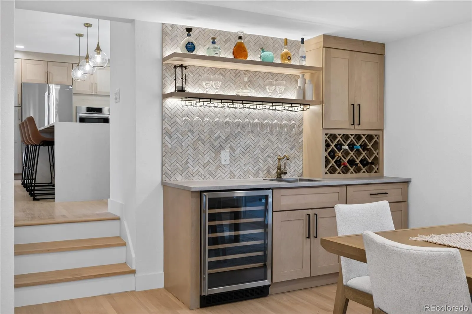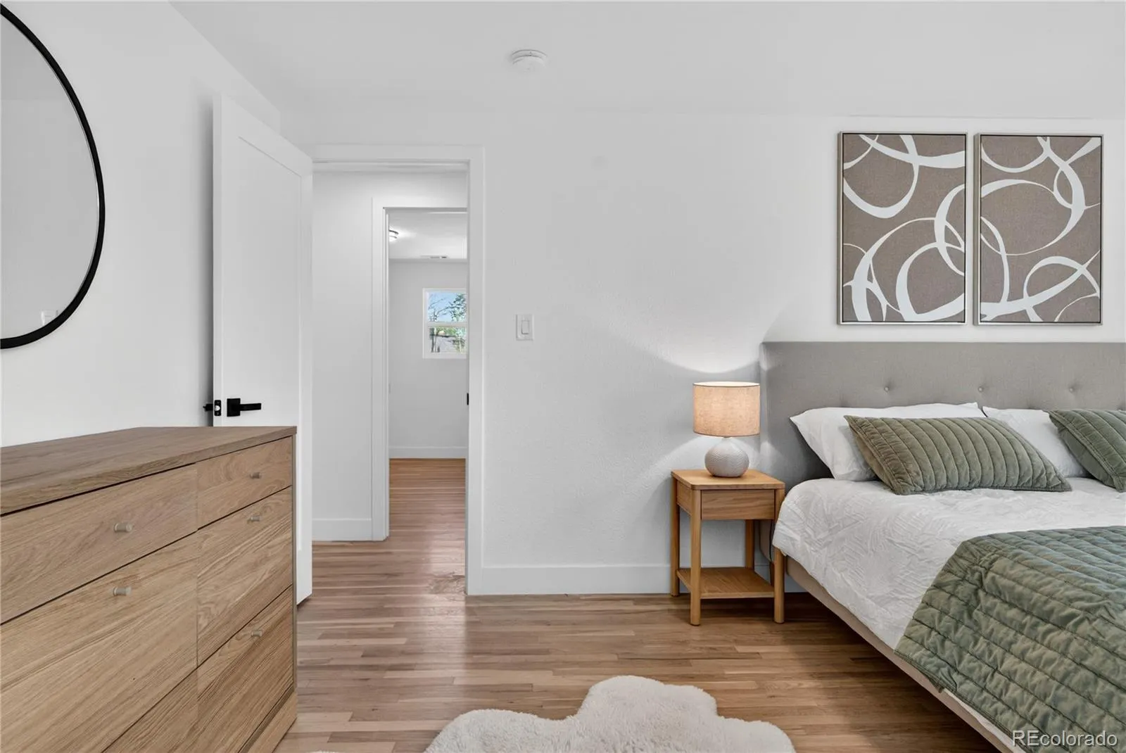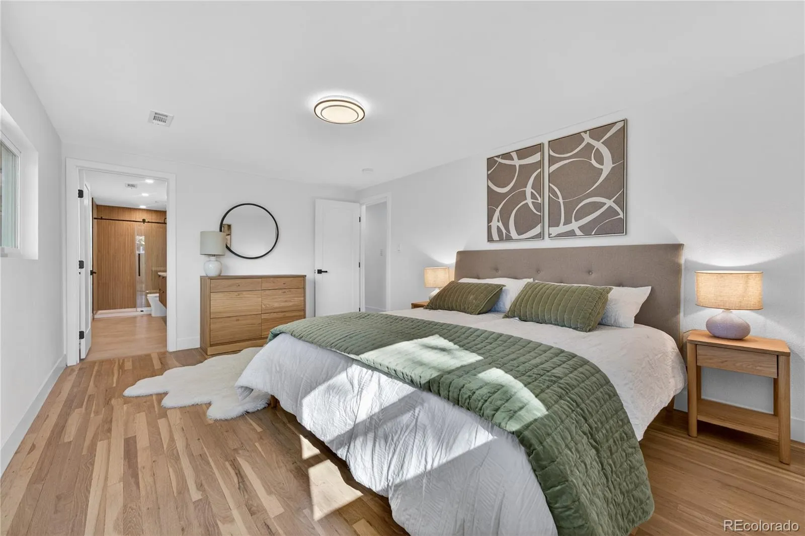 This stunning home in Holly Hills/Eastgate has been completely transformed with a full, high-end remodel reflecting exceptional craftsmanship and today’s most desirable design trends. Offering approximately 2,200 square feet above ground with four bedrooms plus a den on the second floor—an exceptionally rare find in this neighborhood—the home delivers both space and flexibility for modern living. Located in Holly Hills, ranked the #1 Best Place to Live in the Denver area by Niche, this property sits in one of the most sought-after communities. Set on a large, unique corner lot, the home’s unique angled architecture brings in natural light throughout the day, while mature trees and landscaping create a peaceful, private setting. Inside, the open-concept layout blends style and function. Hardwood flooring runs throughout, complemented by designer finishes. The gourmet kitchen features a quartz waterfall island, premium Bosch appliances including a 6-burner gas range with a custom hood, and sleek cabinetry. The adjacent living room showcases a linear gas fireplace with built-ins. The dining area sits just off the main living space and is enhanced by an elegantly designed wet bar with a beverage fridge—ideal for everyday living and entertaining. Upstairs offers four generously sized bedrooms, a versatile bonus room, beautifully designed bathrooms with high-end finishes, and a custom walk-in closet. The fully finished basement adds a large family room, private guest bedroom, and attached bath—ideal for visitors or multi-generational living. Outside, enjoy a landscaped backyard with a covered patio. All systems—including HVAC, water heater, roof, windows, and insulation—are brand new. Minutes to Bible Park and the High Line Canal Trail, with easy access to shopping and dining, this move-in-ready home offers luxury, comfort, and location.