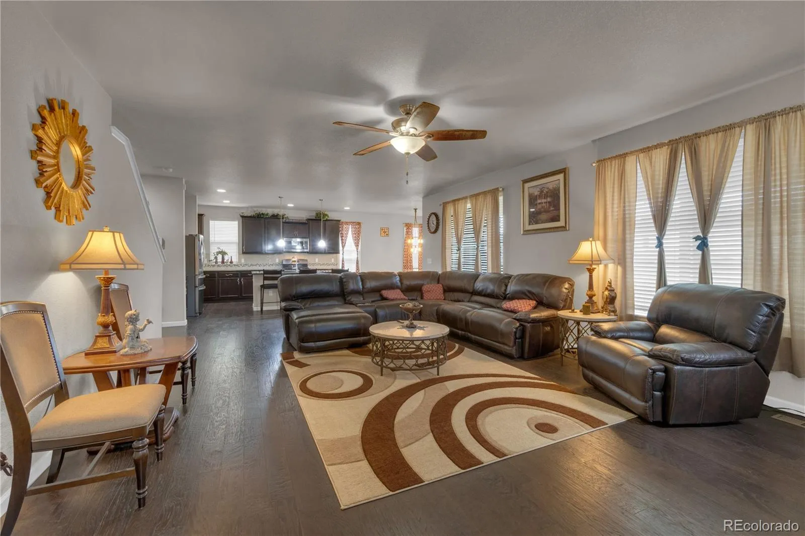 This beautiful home features hardwood floors throughout the main level, including a study, formal dining room, family room, and kitchen. The kitchen offers stainless steel appliances, granite countertops, a gas cooktop, a large island, and plenty of storage, making it great for everyday living and entertaining. Sliding doors open to a covered patio for easy indoor-outdoor enjoyment.