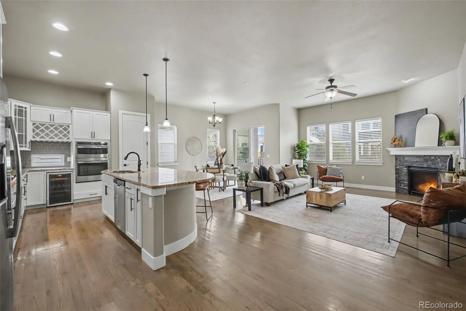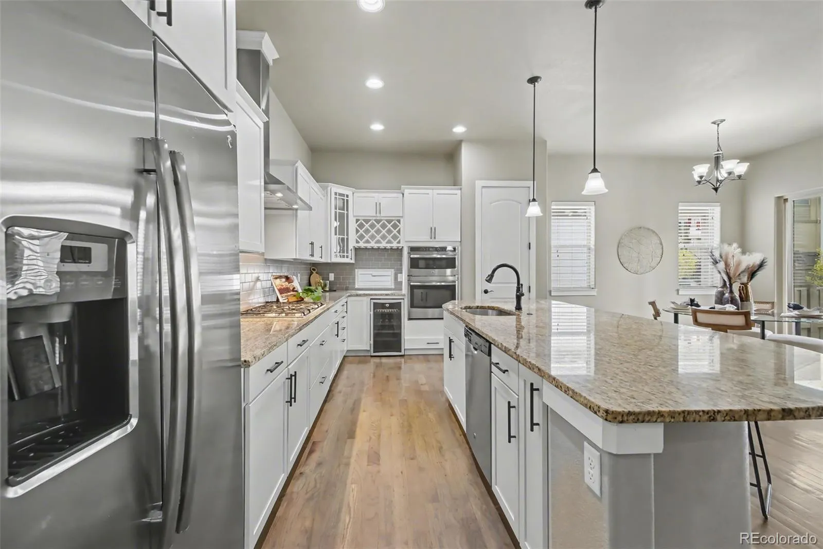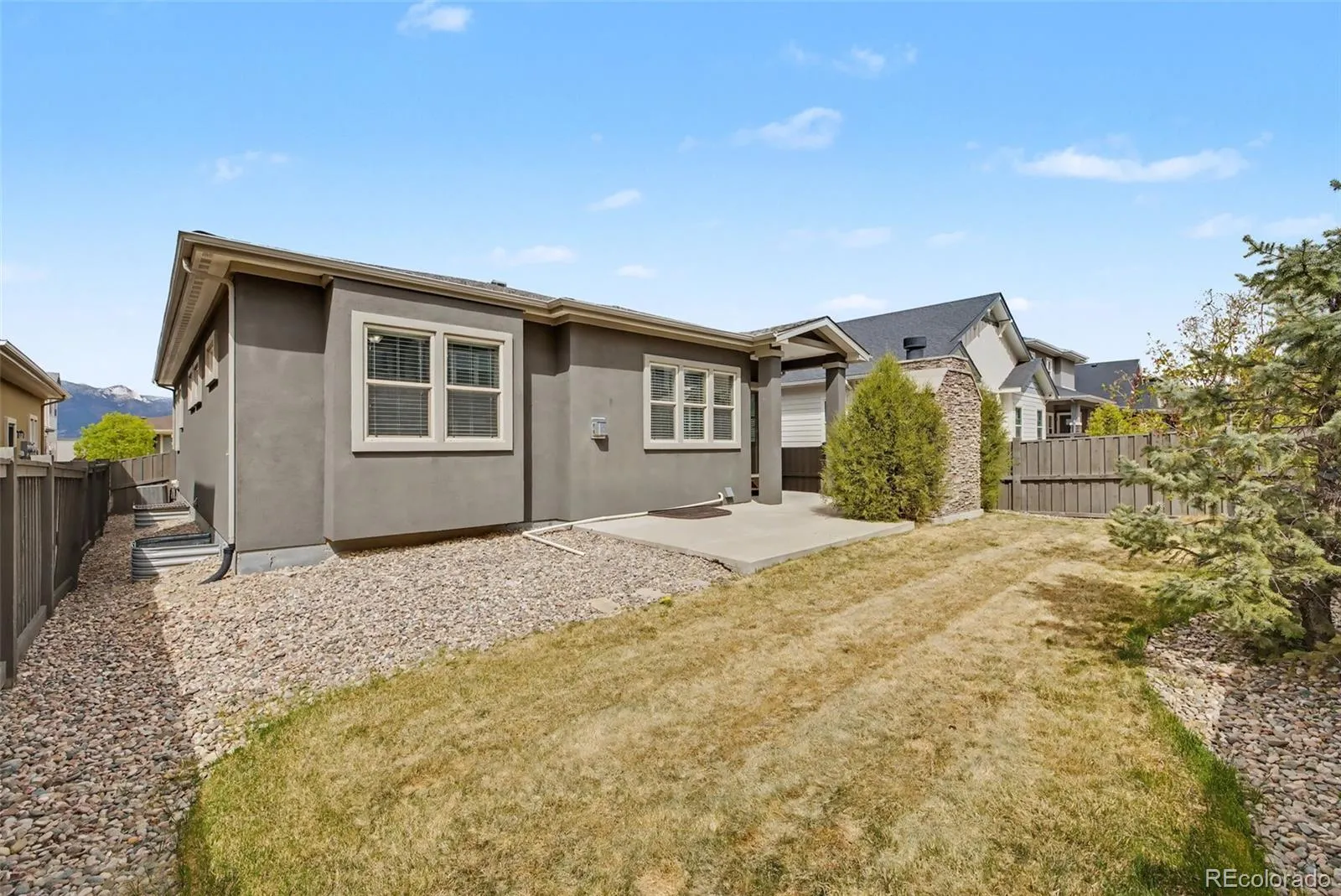 Welcome to this beautifully designed ranch-style home in the highly desirable community of The Farm, offering modern living, scenic views, and access to exceptional amenities. With 4 bedrooms, 3 bathrooms, and over 3,100 finished square feet, this home provides a spacious and functional layout for everyday living and entertaining. The main level features an open-concept design with 9-foot ceilings, natural wood flooring, and a gas fireplace, creating a warm and inviting atmosphere. The gourmet kitchen is thoughtfully designed with granite countertops, a large island, built in wine fridge, breakfast bar, pantry, and gas cooking, flowing seamlessly into the dining area and family room with walk-out access. The primary suite offers a private retreat featuring a tray ceiling with a walk-in closet and a luxurious 5-piece bath featuring a soaking tub, double vanity, and separate shower. A second main-level bedroom and convenient laundry room complete the main floor. The finished basement expands your living space with a large recreation room, two additional bedrooms, and a full bathroom—perfect for guests or multi-generational living as well as an unfinished room for storage, hobbies, or a game room. Situated on a level, fenced lot with mountain views, this home also includes central A/C and a two-car attached garage with added storage at the rear. Residents of The Farm enjoy access to outstanding amenities including a clubhouse, pool, fitness center, pond, parks, and trails, all within Academy District 20 and close to shopping, dining, and I-25. This home offers the perfect combination of space, comfort, and community living.