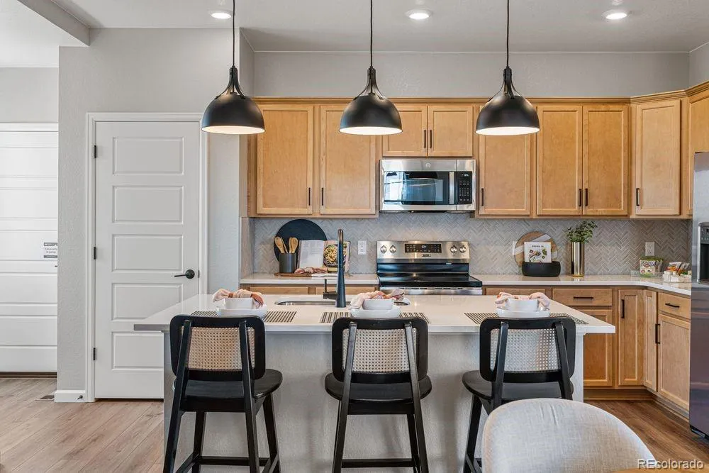 What’s Special: White Cabinets | Close to Park | East Facing Lot | 2nd Floor Laundry Room | Model Plan. New Construction – Ready Now! Built by America’s Most Trusted Home Builder. Welcome to the Aurora at 333 N Bently Street in Sky Ranch! This popular floor plan opens with a bright and open living space that seamlessly connects the great room, dining area, and spacious kitchen with a large island. Sliding doors lead to the patio, creating an easy flow for indoor outdoor living. Upstairs, the private primary suite offers a peaceful retreat, while three additional bedrooms with generous closets share a well designed bathroom with a separate water closet. A convenient upstairs laundry adds to the thoughtful layout. Welcome to Sky Ranch, a vibrant master-planned community in Aurora. Just south of I-70, you’re minutes from E-470, DIA, and downtown Denver. Enjoy easy access to Southlands Mall, 100+ parks, trails, golf, and a new K-8 charter school. With attainable pricing, a 4-acre park, and quick access to Hogan Park, Sky Ranch offers comfort, connection, and true Colorado living. Additional Highlights Include: slide in gas range in place of electric range. Photos are for representative purposes only. MLS#6943047