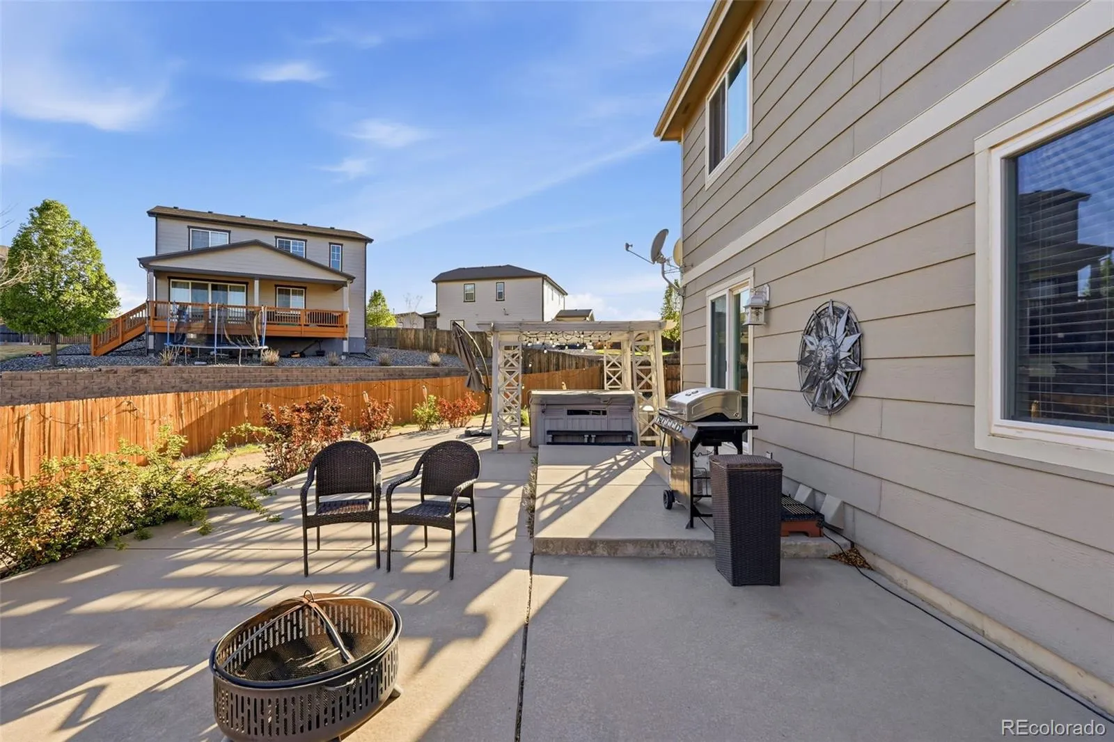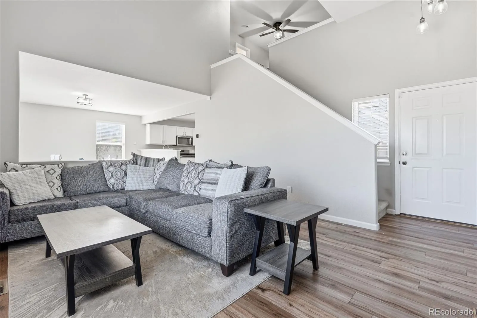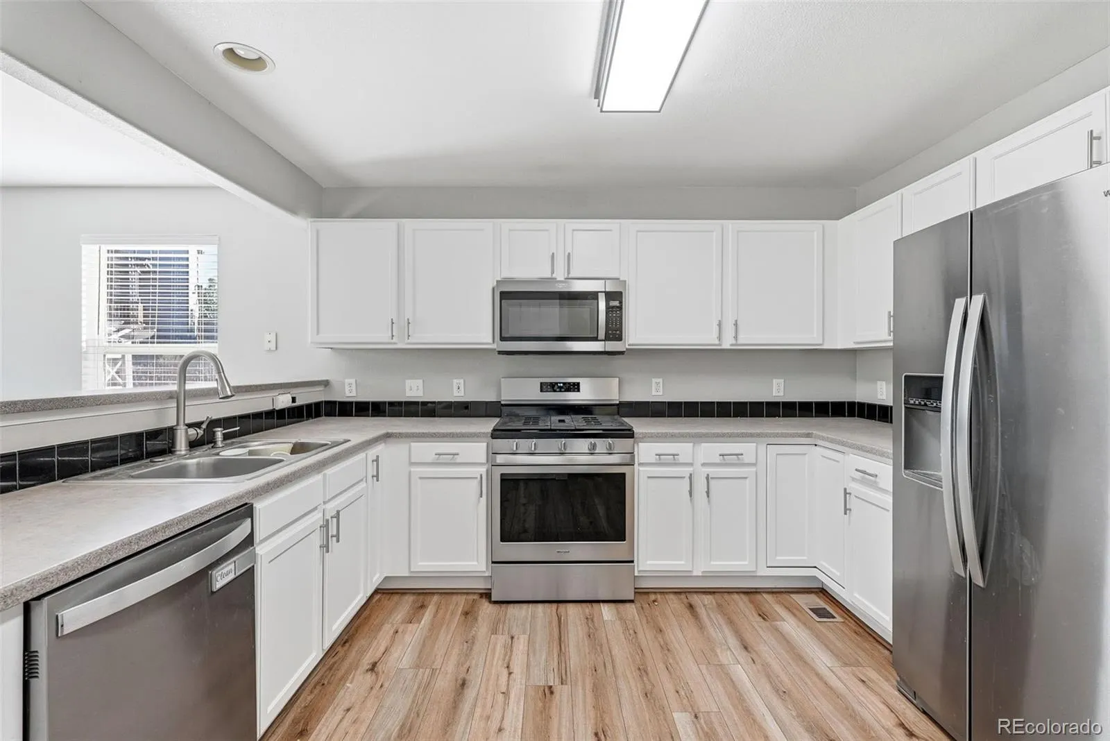 Updated home located on a quiet cul-desac within the Cherry Creek School District boundary. The kitchen features white cabinetry, stainless steel appliances, and luxury vinyl plank flooring, with an adjacent dining area offering access to the backyard through a sliding glass door. The family room includes vaulted ceilings and a gas fireplace, creating an open and functional living space. Recent interior improvements include updated paint, carpet, doors, trim, lighting, and window coverings. The primary bedroom offers a walk-in closet and a remodeled bathroom with updated flooring, fixtures, and finishes. An upstairs loft provides flexible space suitable for a variety of uses such as a home office or study area. The finished basement adds additional living space, including a secondary living area with an electric fireplace, a nonconforming bedroom, and a bathroom. Major system updates include a roof replacement in 2023 and a recently installed furnace, air conditioning system, and humidifier with an active warranty. Additional improvements include updates to the sprinkler system with a new control unit and components. The backyard includes a patio area, hot tub, and gazebo, offering outdoor living potential. The attached garage includes built-in workbench and cabinet storage. Additional features include a recently replaced garage door opener, washer and dryer, and a hardwired security system (service subscription may be required).