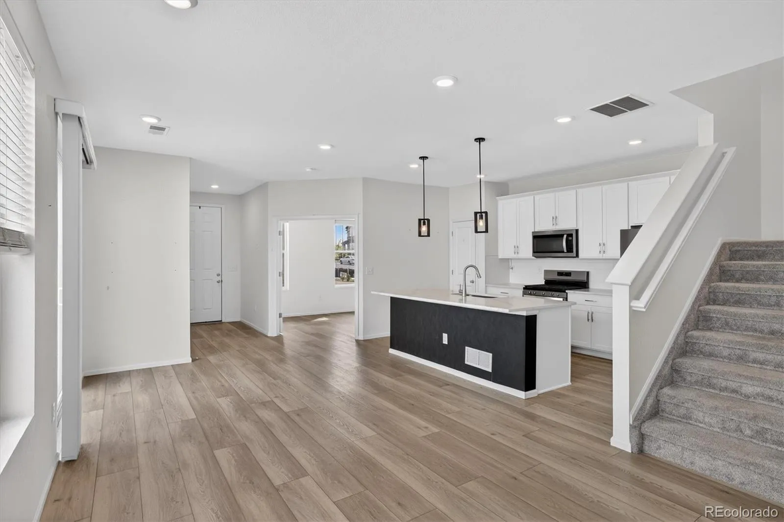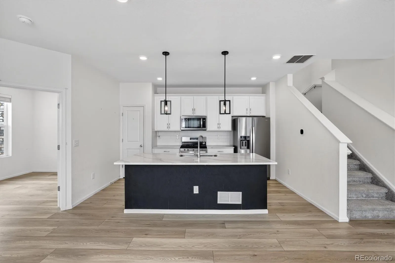 At the heart of the home, the stunning kitchen shines with a spacious island—perfect for hosting friends, sharing meals, or simply enjoying your morning coffee. Elegant touches like Moen faucets and gorgeous vinyl plank flooring throughout elevate the entire space with a sense of quality and comfort.