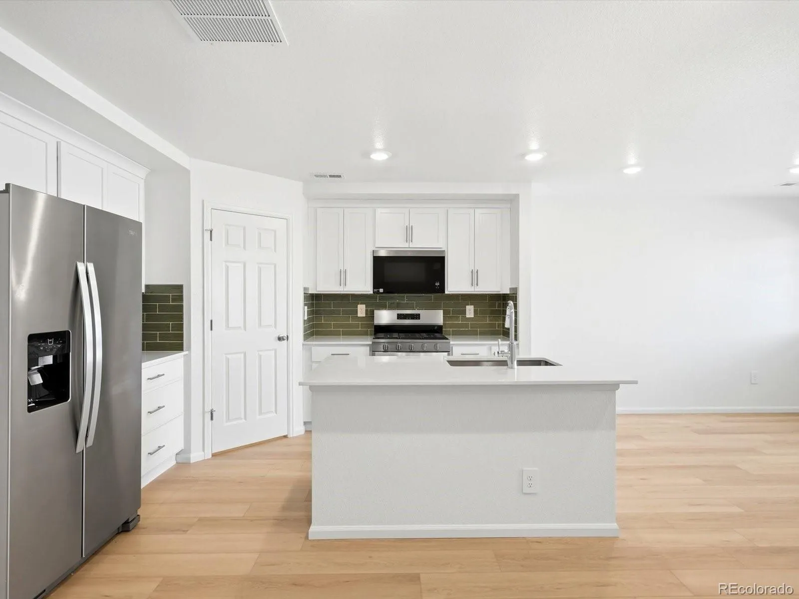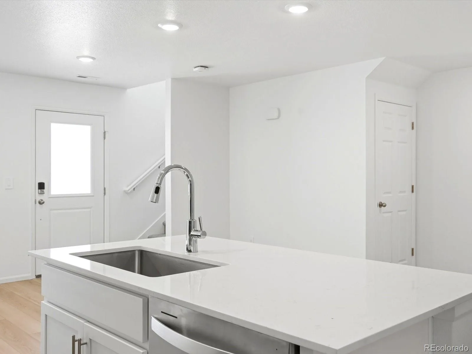 Open concept kitchen with quartz countertops and white cabinets!