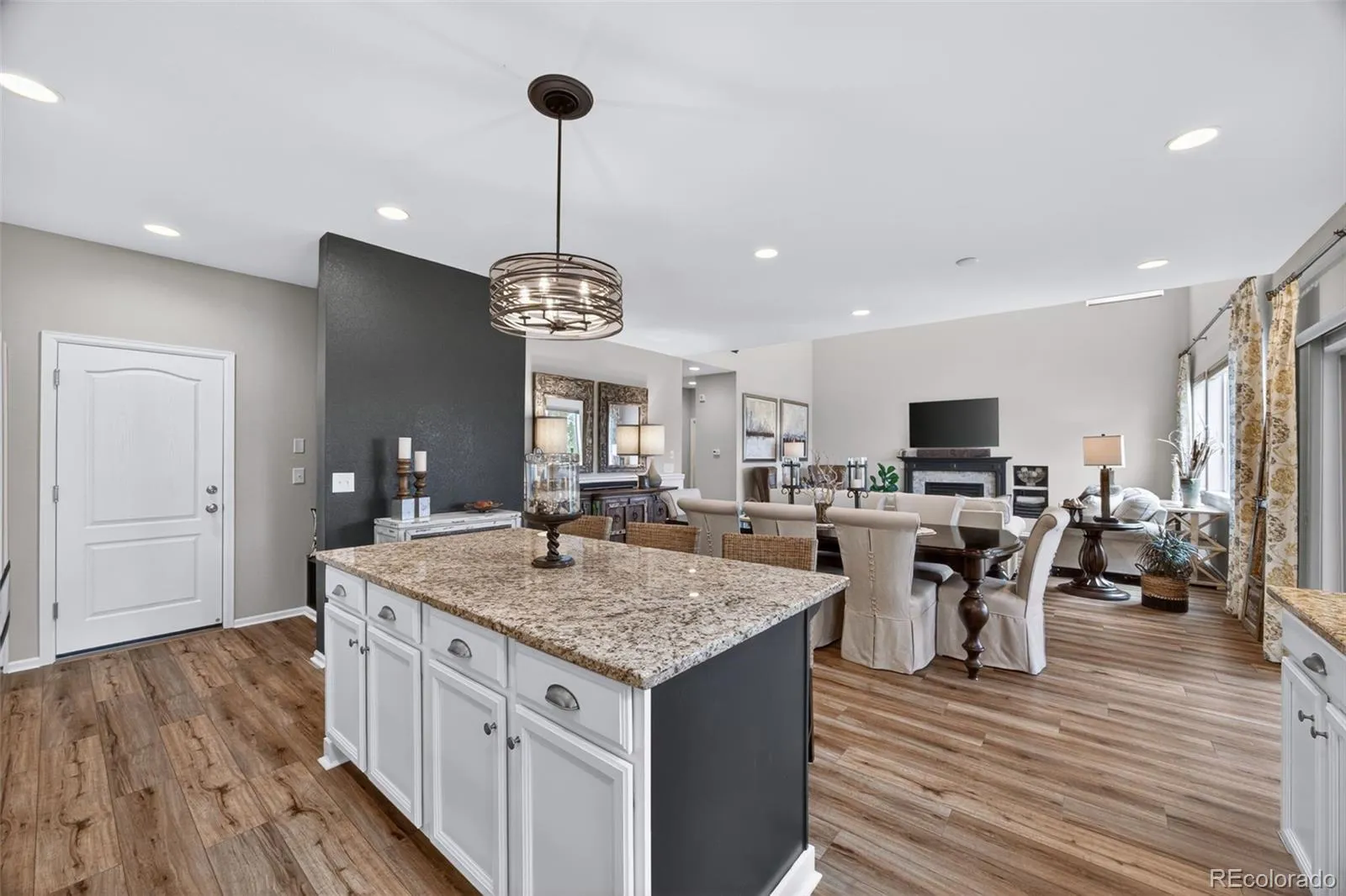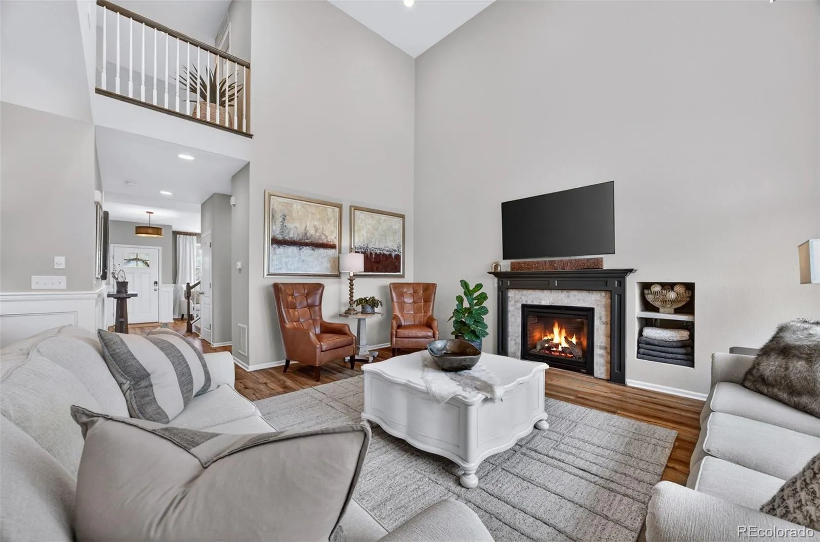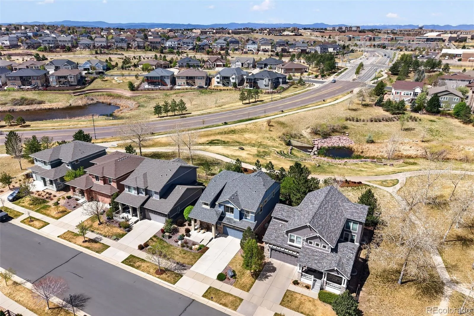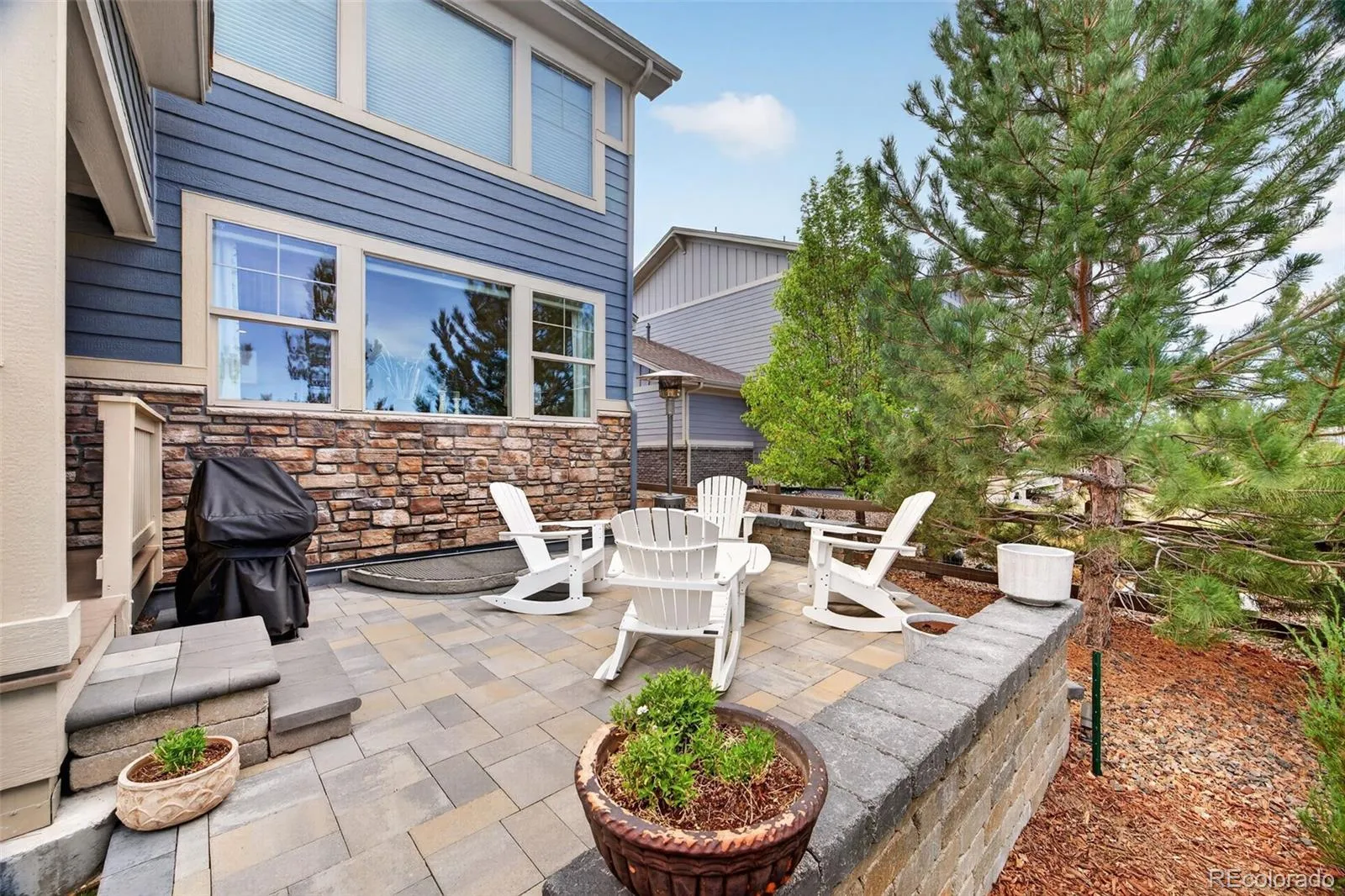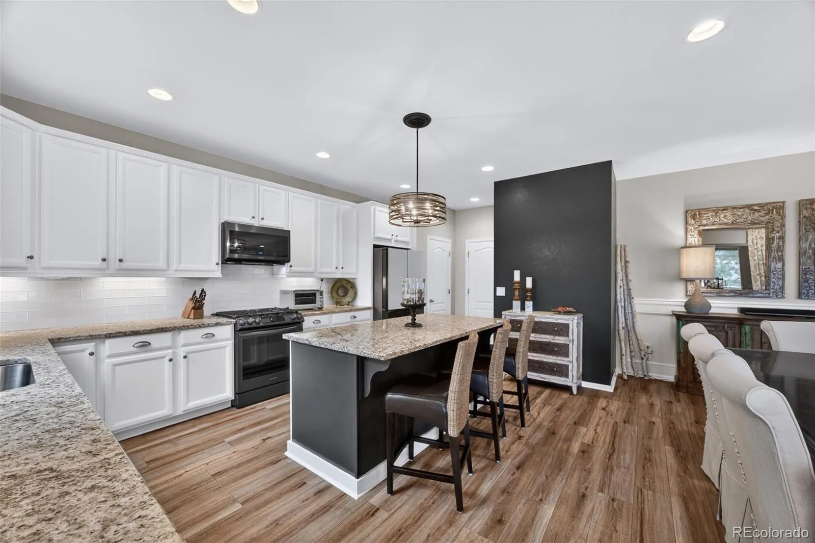 Welcome to 7045 S Robertsdale Way, a former model home in Southshore where thoughtful design, modern finishes, and everyday functionality come together in a bright, open layout. Just inside, a versatile front room offers space for a home office, sitting area, or flex space, enhanced by elegant wainscoting, along with black accent finishes and updated flooring (2022). The kitchen is a true standout featuring granite countertops, subway tile backsplash, abundant cabinetry, and a full suite of Samsung Bespoke appliances in striking navy blue stainless steel. The sleek glass front refrigerator includes an interior beverage center for both style and convenience, all flowing seamlessly into the main living and dining spaces. A mudroom just off the garage adds everyday ease, while the powder bath showcases a grasscloth wall treatment for a coastal-inspired touch. Upstairs, the spacious primary suite offers a walk-in closet and linen storage, complemented by well-appointed secondary bedrooms, including a guest room with a shiplap accent wall. A versatile loft provides space for a home office or additional living area, and the laundry room includes extra cabinetry for added function. The finished basement expands your living space with a large rec area, a guest bedroom with 8.8-foot ceilings, a full bathroom, and a 220V outlet—ideal for a home gym or workshop. Step outside to a low-maintenance backyard with turf and professionally designed landscaping, enhanced by Kichler exterior lighting controlled by an app. The home backs to open space with direct trail access to the Aurora Reservoir, nearby parks, and Southshore’s two community clubhouses—the Lakehouse and Lighthouse. With resort-style amenities, an oversized 2-car garage, and a whole-home lighting control system, this home offers a rare combination of design, convenience, and Colorado lifestyle.