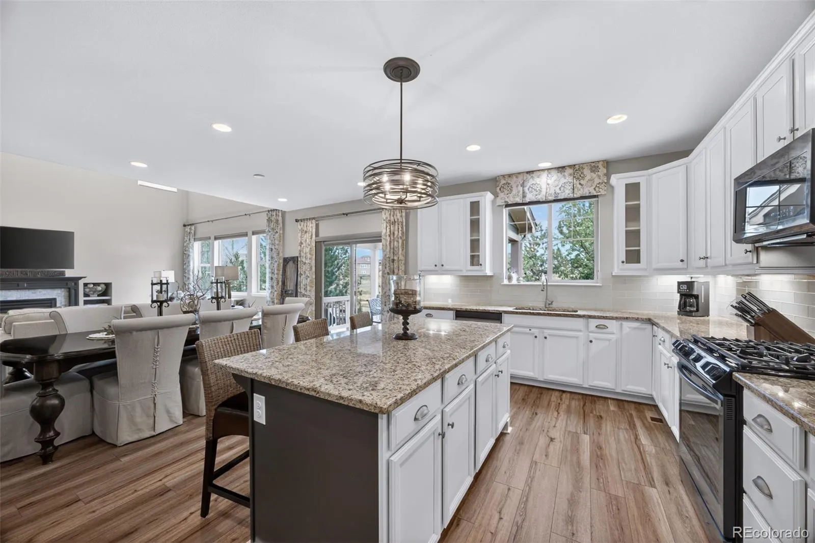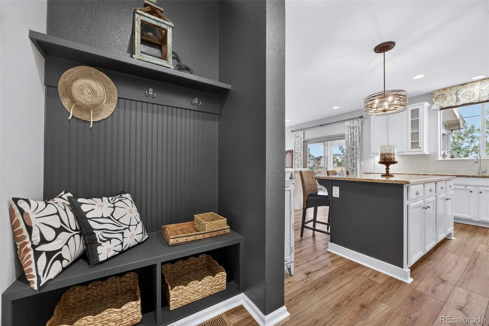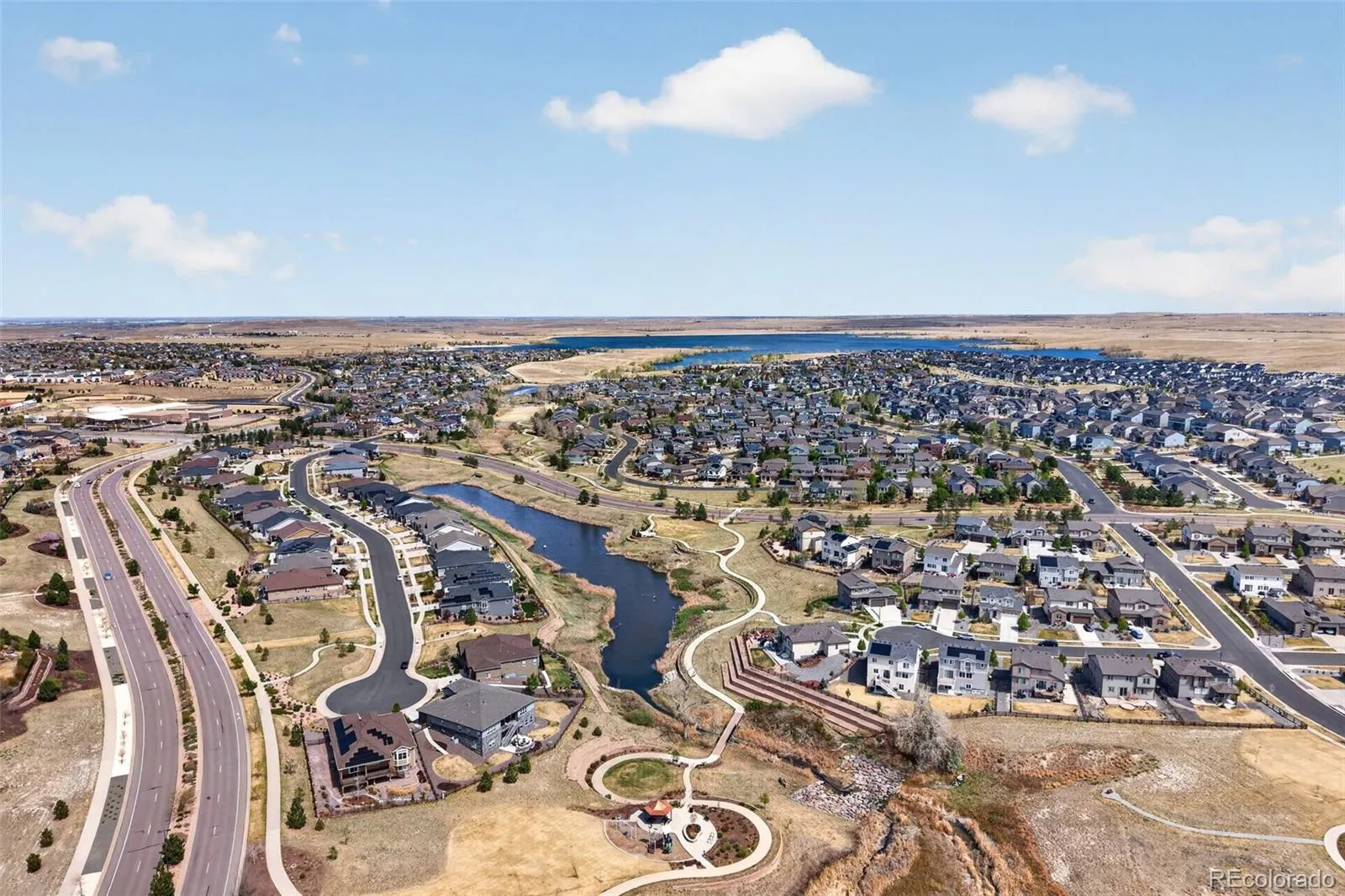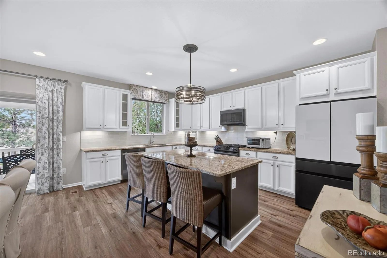 Welcome to 7045 S Robertsdale Way, a former model home in Southshore where thoughtful design, modern finishes, and everyday functionality come together in a bright, open layout. Just inside, a versatile front room offers space for a home office, sitting area, or flex space, enhanced by elegant wainscoting, along with black accent finishes and updated flooring (2022). The kitchen is a true standout featuring granite countertops, subway tile backsplash, abundant cabinetry, and a full suite of Samsung Bespoke appliances in striking navy blue stainless steel. The sleek glass front refrigerator includes an interior beverage center for both style and convenience, all flowing seamlessly into the main living and dining spaces. A mudroom just off the garage adds everyday ease, while the powder bath showcases a grasscloth wall treatment for a coastal-inspired touch. Upstairs, the spacious primary suite offers a walk-in closet and linen storage, complemented by well-appointed secondary bedrooms, including a guest room with a shiplap accent wall. A versatile loft provides space for a home office or additional living area, and the laundry room includes extra cabinetry for added function. The finished basement expands your living space with a large rec area, a guest bedroom with 8.8-foot ceilings, a full bathroom, and a 220V outlet—ideal for a home gym or workshop. Step outside to a low-maintenance backyard with turf and professionally designed landscaping, enhanced by Kichler exterior lighting controlled by an app. The home backs to open space with direct trail access to the Aurora Reservoir, nearby parks, and Southshore’s two community clubhouses—the Lakehouse and Lighthouse. With resort-style amenities, an oversized 2-car garage, and a whole-home lighting control system, this home offers a rare combination of design, convenience, and Colorado lifestyle.