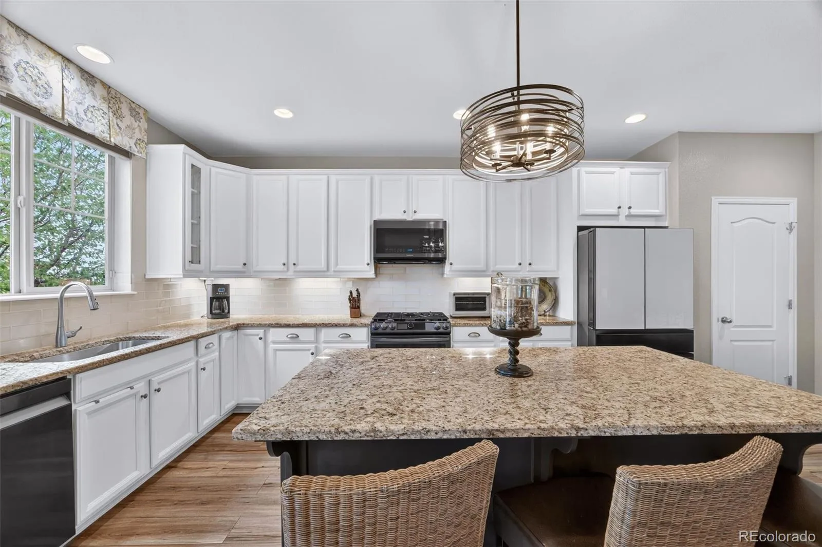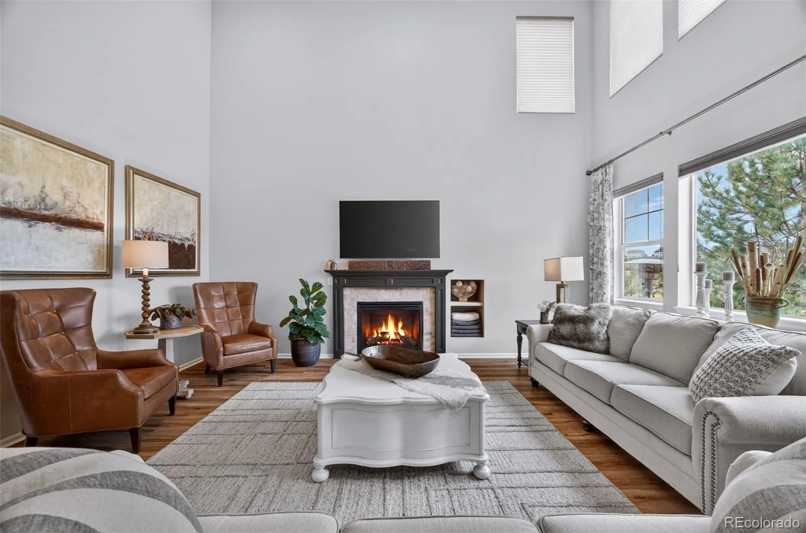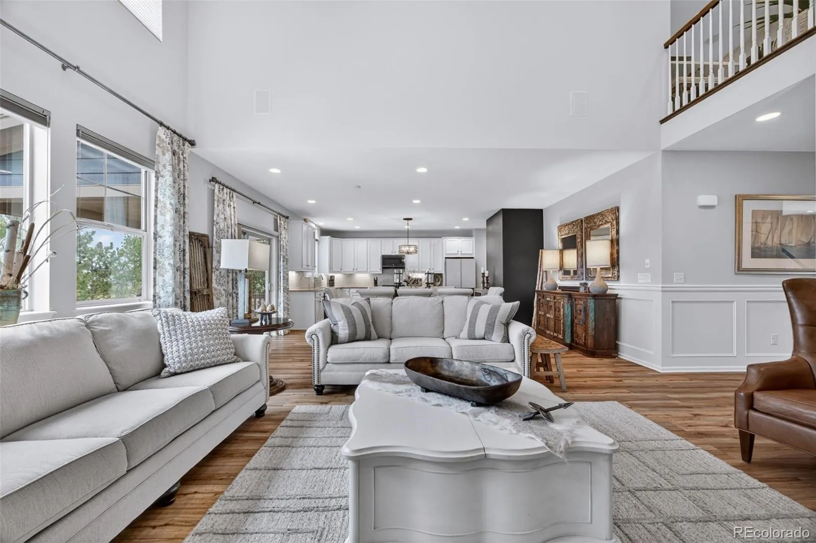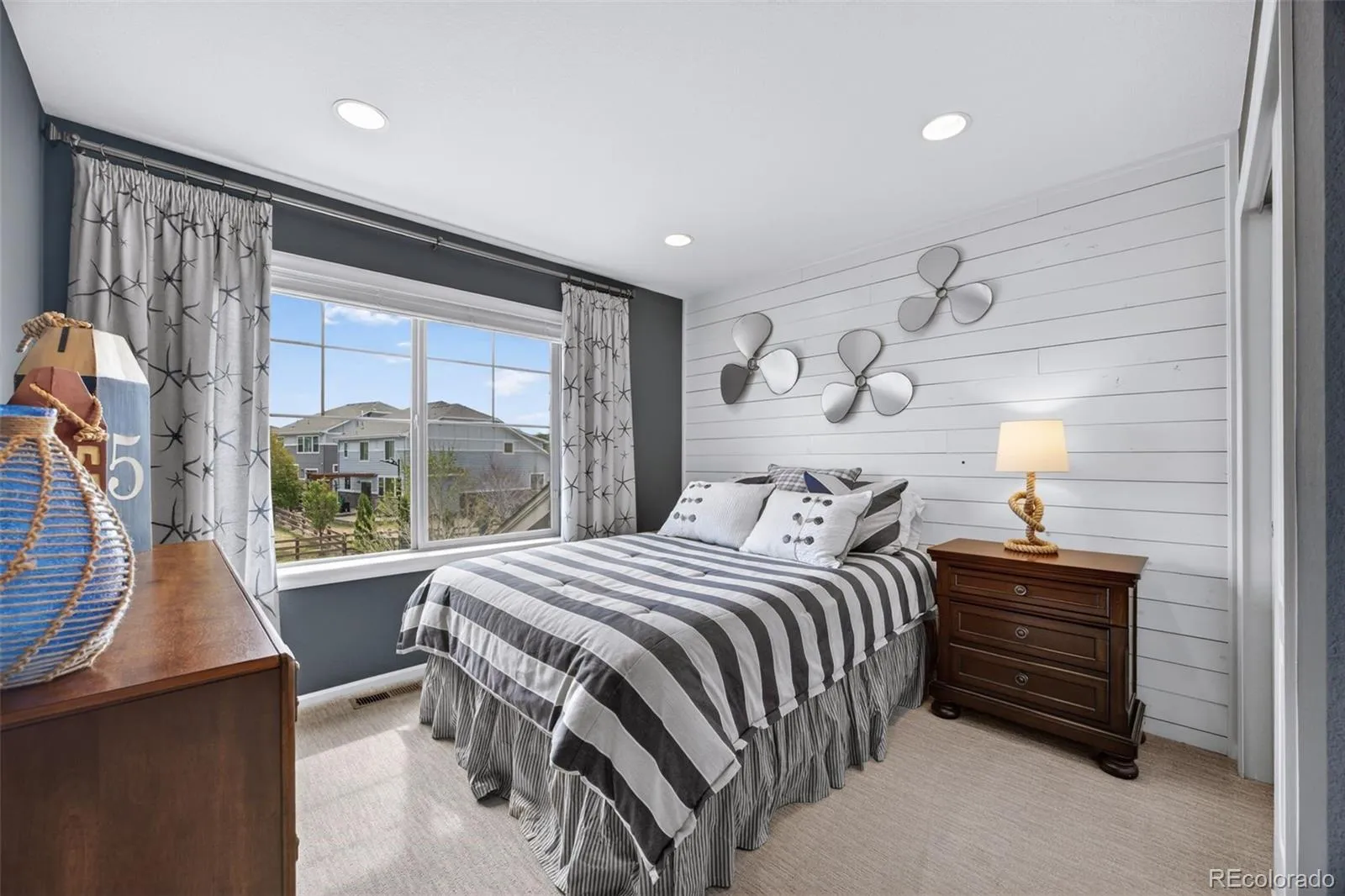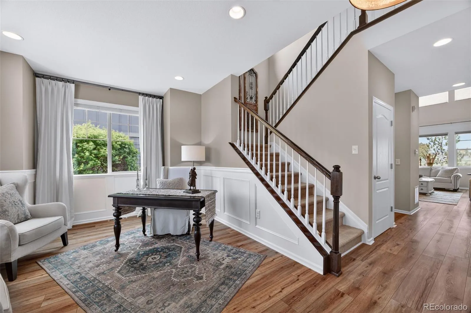 Welcome to 7045 S Robertsdale Way, a former model home in Southshore where thoughtful design, modern finishes, and everyday functionality come together in a bright, open layout. Just inside, a versatile front room offers space for a home office, sitting area, or flex space, enhanced by elegant wainscoting, along with black accent finishes and updated flooring (2022). The kitchen is a true standout featuring granite countertops, subway tile backsplash, abundant cabinetry, and a full suite of Samsung Bespoke appliances in striking navy blue stainless steel. The sleek glass front refrigerator includes an interior beverage center for both style and convenience, all flowing seamlessly into the main living and dining spaces. A mudroom just off the garage adds everyday ease, while the powder bath showcases a grasscloth wall treatment for a coastal-inspired touch. Upstairs, the spacious primary suite offers a walk-in closet and linen storage, complemented by well-appointed secondary bedrooms, including a guest room with a shiplap accent wall. A versatile loft provides space for a home office or additional living area, and the laundry room includes extra cabinetry for added function. The finished basement expands your living space with a large rec area, a guest bedroom with 8.8-foot ceilings, a full bathroom, and a 220V outlet—ideal for a home gym or workshop. Step outside to a low-maintenance backyard with turf and professionally designed landscaping, enhanced by Kichler exterior lighting controlled by an app. The home backs to open space with direct trail access to the Aurora Reservoir, nearby parks, and Southshore’s two community clubhouses—the Lakehouse and Lighthouse. With resort-style amenities, an oversized 2-car garage, and a whole-home lighting control system, this home offers a rare combination of design, convenience, and Colorado lifestyle.